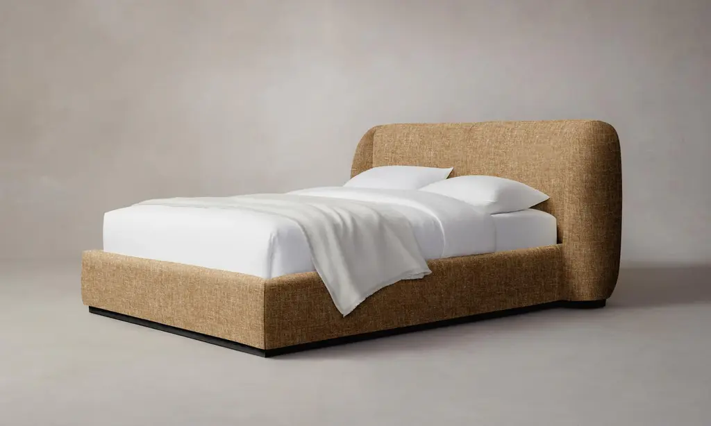 This plush, overstuffed bed frame offers a cozy night's sleep with its signature profile. Set on a rippled wooden plinth base, the boucle upholstery and gentle lines inspire a cloud-like softness you'll love climbing into. This bed is from our exclusive Sarah Sherman Samuel collaboration and features all the trademarks of her warm, edited style.