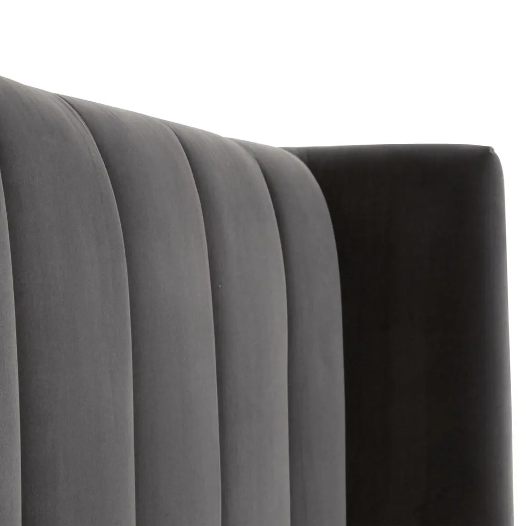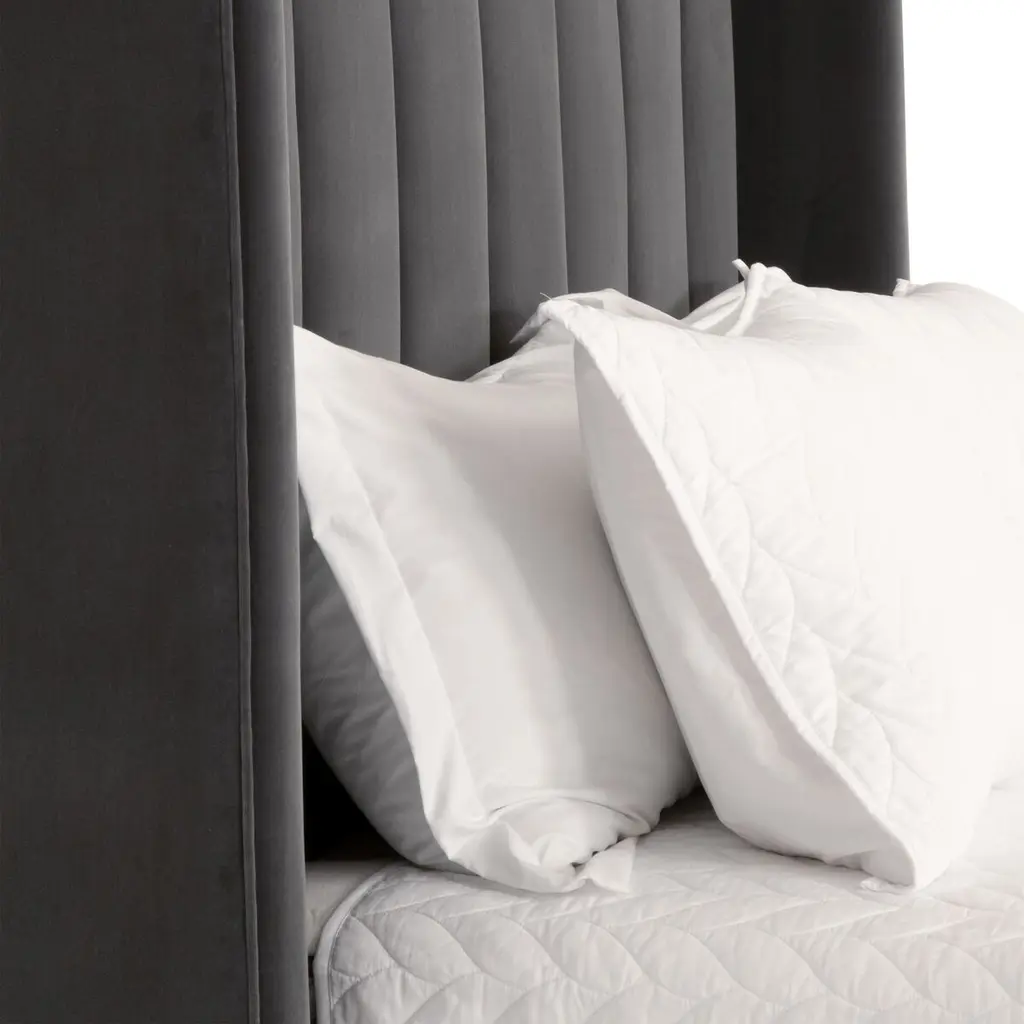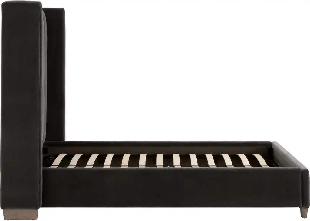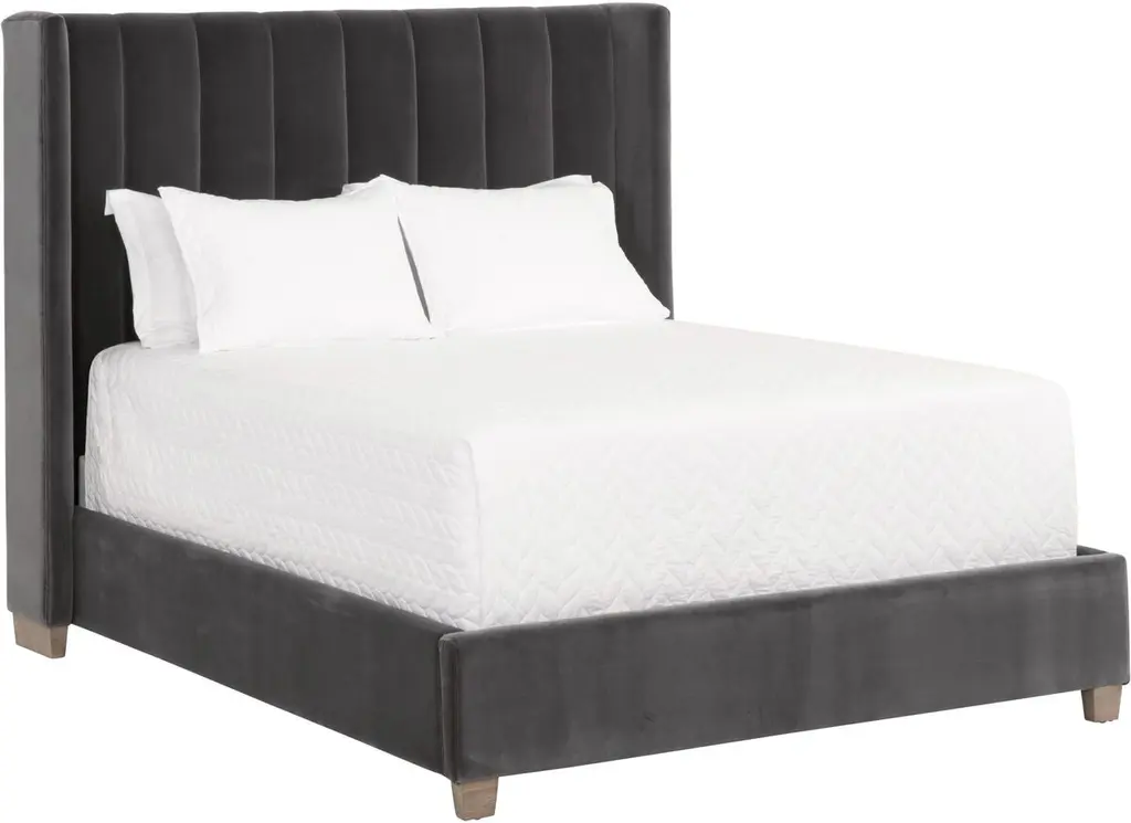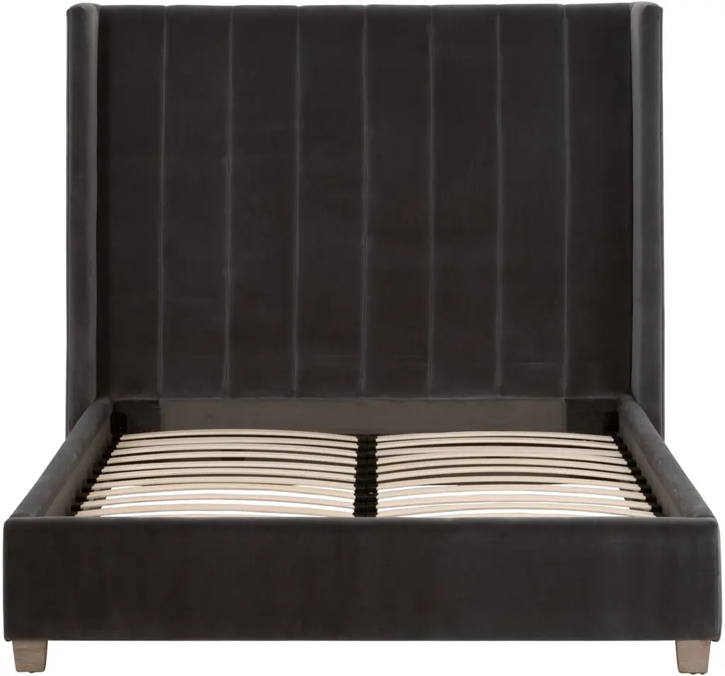 Bring home Hollywood Regency glamour with this luxurious bed. The durable oak frame, which features a streamlined wingback headboard, is upholstered in plush channeled velvet, ideal for leaning against when reading or watching TV. Comes with a removable European slat system, which provides exceptional support for shoulders, hips, knees, and backs.