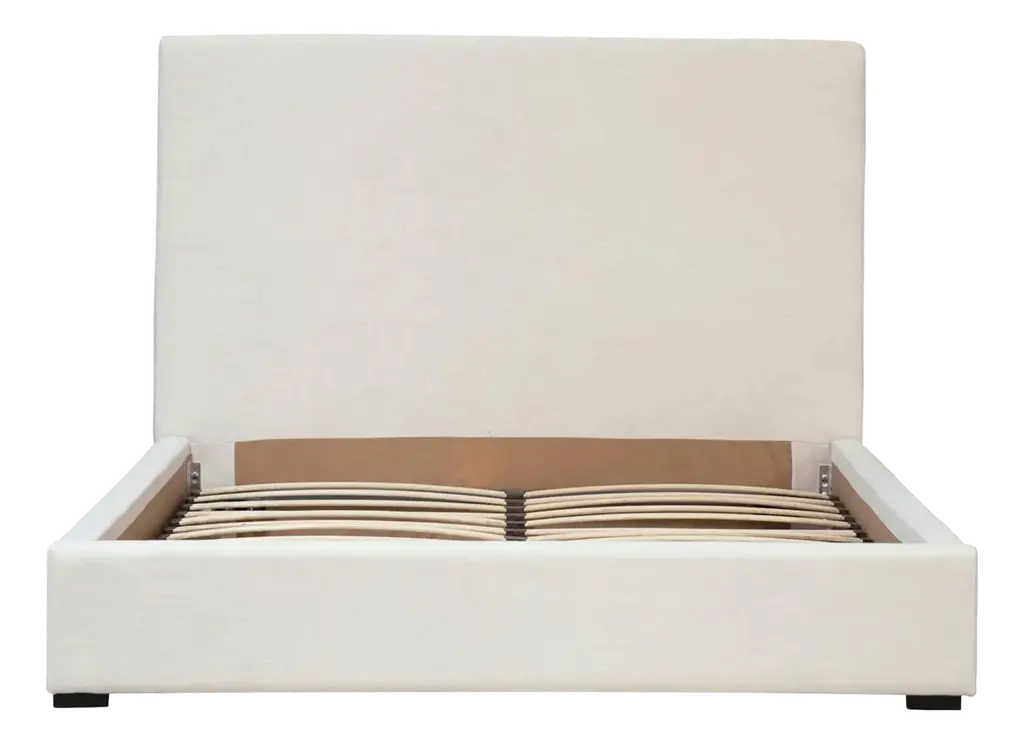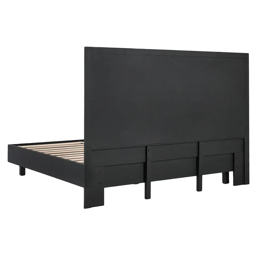 Modern black oak wood eastern king size bed frame with tan upholstered poly blend headboard. Handsome and easily styled in a variety of bedrooms. This bed weighs approx. 255 lbs.