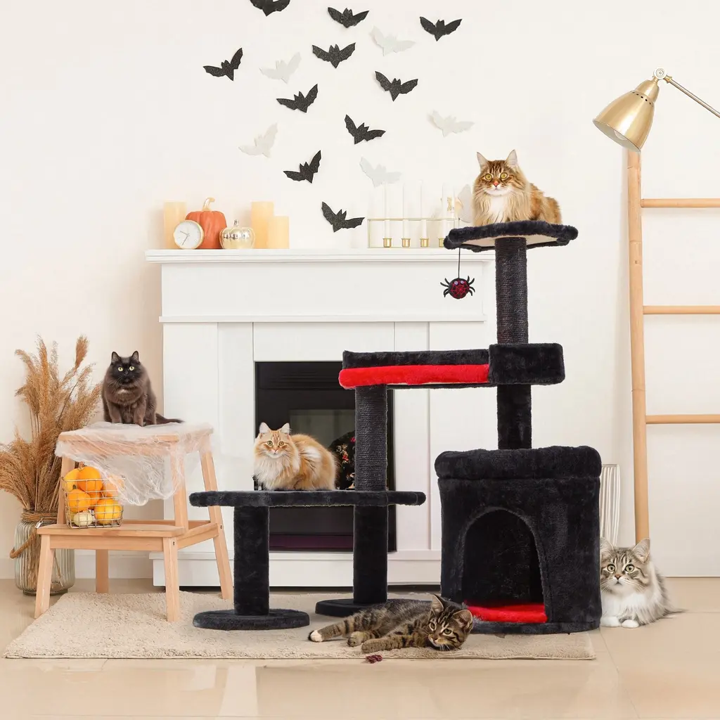 SpecificationsKey Features● Unleash Mysterious Ambience: With bat-shaped toys, a striking coffin-style beds, the versatile kitten tower exudes a sense of spookiness that is sure to capture cat's and people's attention. Its extra large back design adds to its allure, making it a statement piece in any room. ● Luxurious Resting Options: The large cat tree features a castle-style cat condo, providing your cats with a large kingdom to patrol. Moreover, the spacious condo, a cozy hammock, 2 oversized coffin beds and a basket bed allow furry friends to unwind and bask in different perspectives. ● Multi-level Playground: Designed to keep your cats entertained, the gothic kitty tree features 2 hanging toys for endless playtime. The multiple jumping platforms offer opportunities for your feline friends to engage in playful activities, promoting both physical and mental well-being. ● Sisal Scratching Posts: To release cats' natural scratching instincts, the multi-level activity center boasts multiple sisal scratching posts. Therefore, the kitty tower offers a perfect solution to protect your furniture from damage and promote a healthy outlet for cats' instincts.