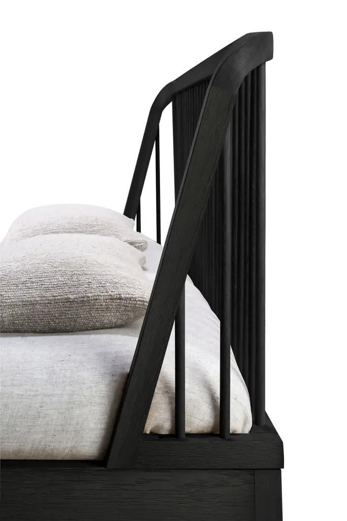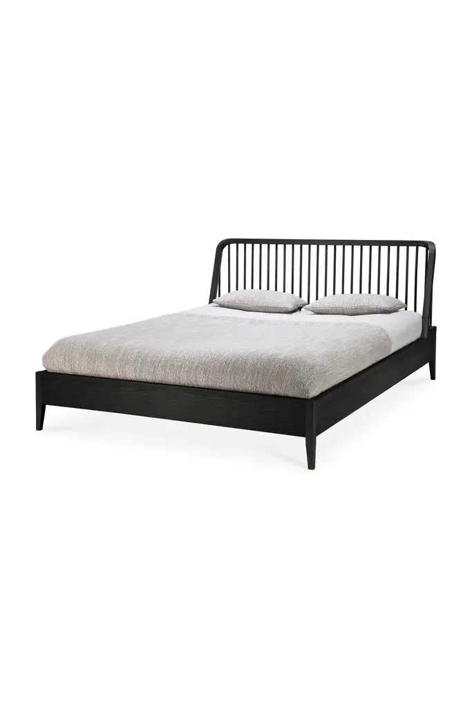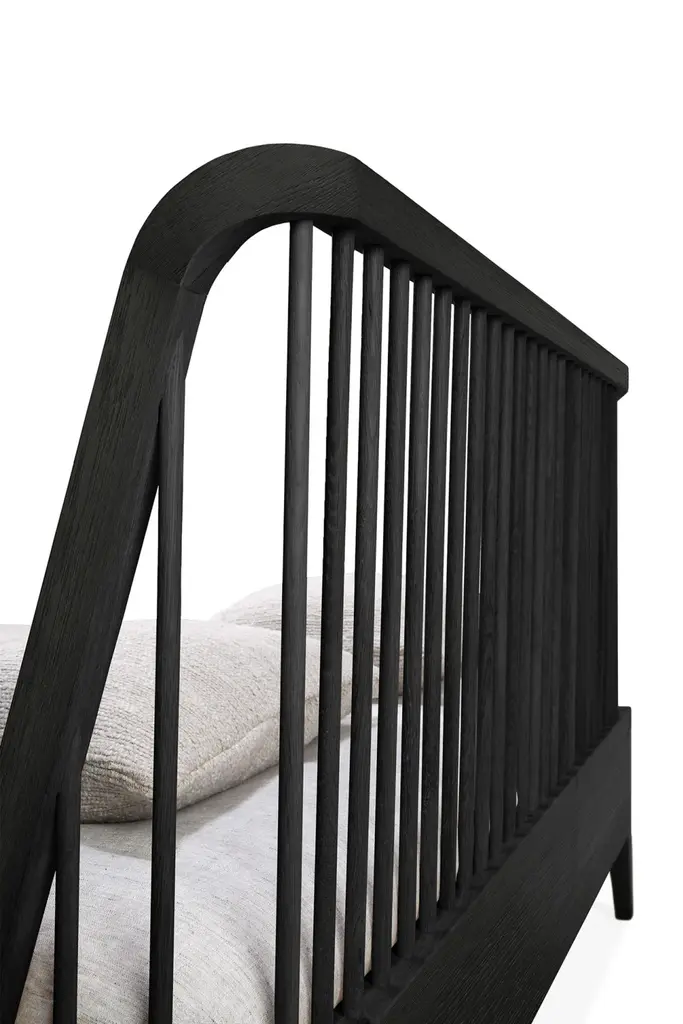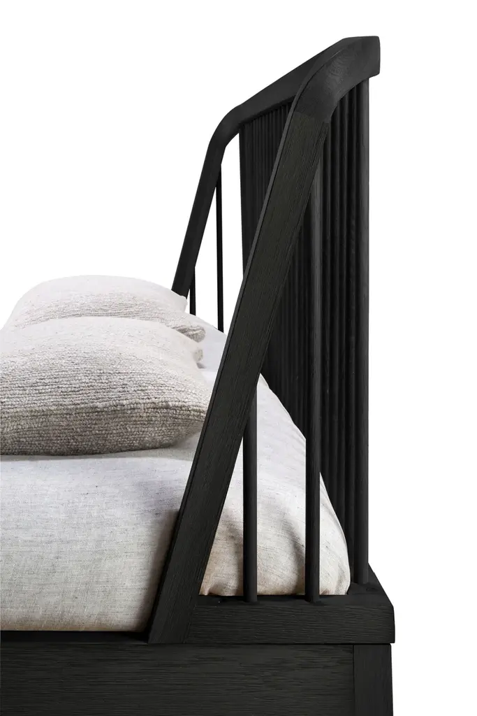 Drawing inspiration from the age-old spinning wheel, the Black Solid Oak Bed by Ethnicraft incorporates flawlessly aligned spokes into its headboard. Complete with sturdy bed slats, this Spindle bed has been crafted from black-tainted oak with a lustrous varnish finish. It boasts slightly tapered legs and rounded edges, adding a soft, sensual quality to its overall aesthetic. Transform your bedroom with the understated elegance of Spindle Oak Bed.