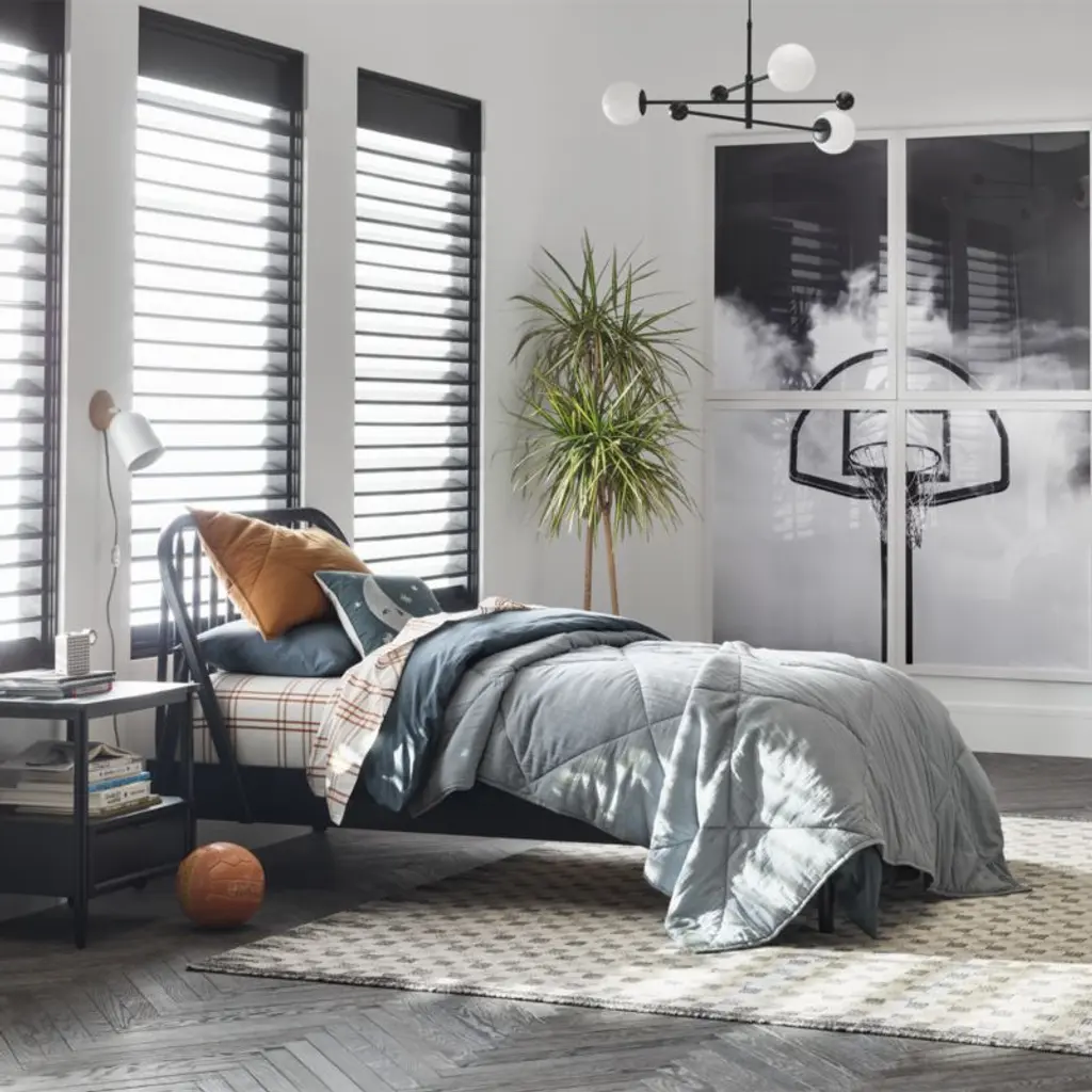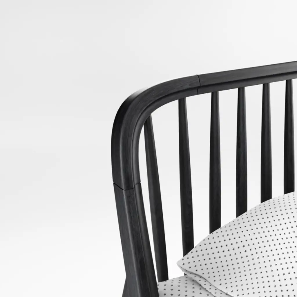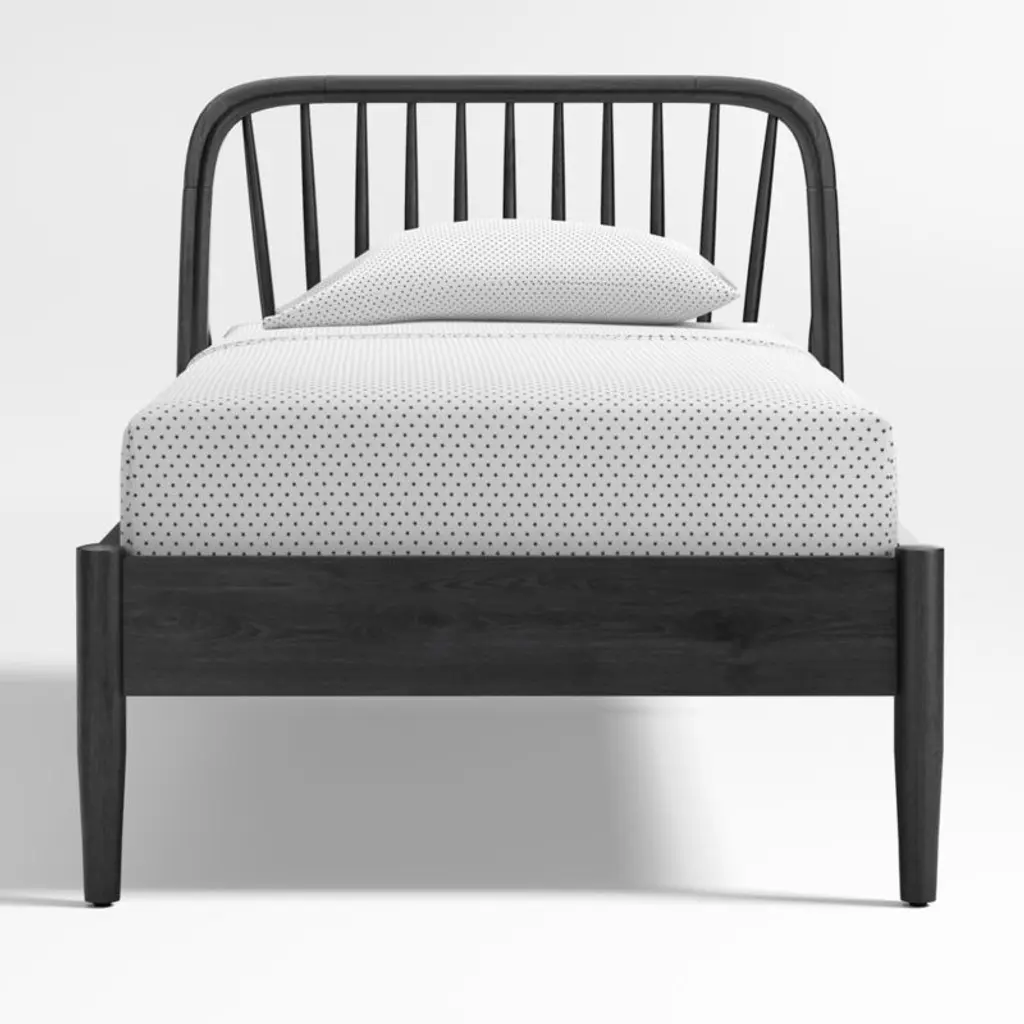 Our Bodie bed is a forever-stylish design with a right-now twist. From the subtle curves of the headboard to the slightly angled back legs, this piece gives classic spindle bed styling a modern update. Crafted to last through the years and grow with your family, it features solid poplar slats for support and durability. Its smooth black finish is a cinch to mix and match with any decor. Plus, a generously sized headboard gives little ones and grownups enough room for story time. Coordinates with other pieces from our Bodie collection.