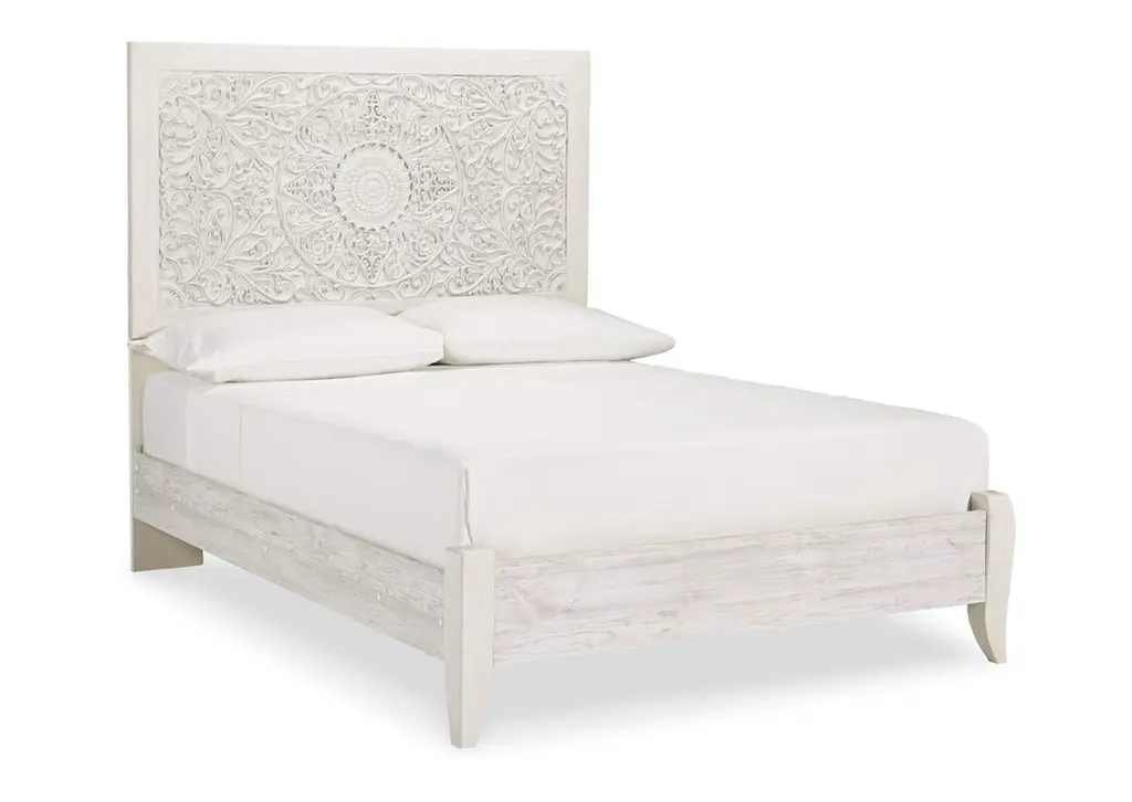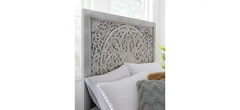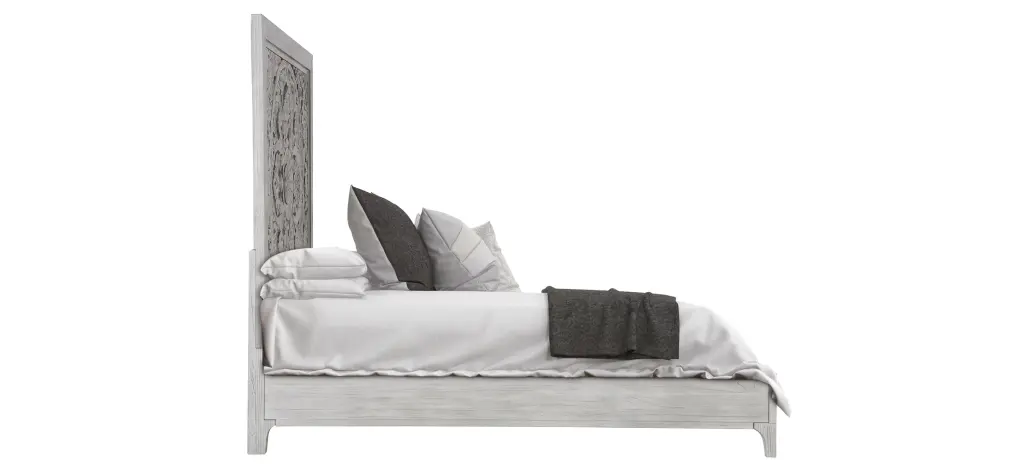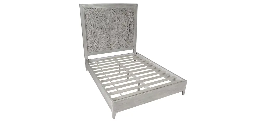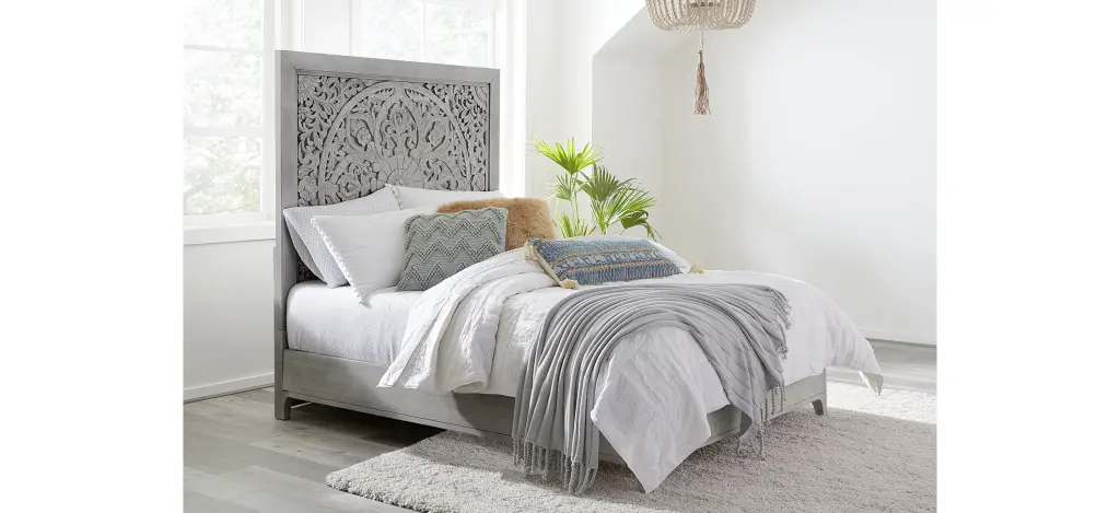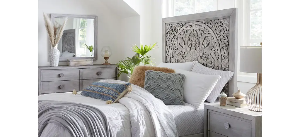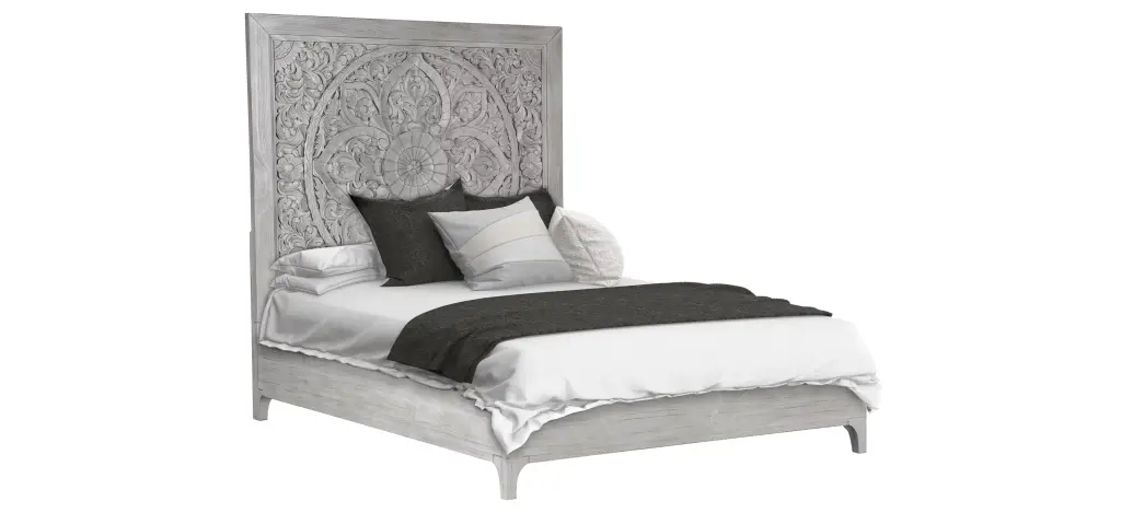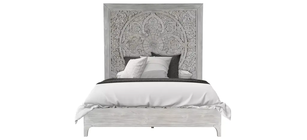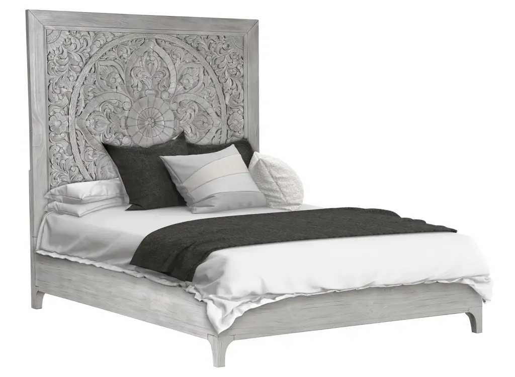 Add a Bohemian style to your bedroom with the globally inspired Boho Chic King Bed. The high headboard and gentlemans chest are intricately carved with a mandala pattern, a spiritual symbol that is said to establish a sacred space. Crisp edges, delicately curved feet and carved drawer pulls complete the look.