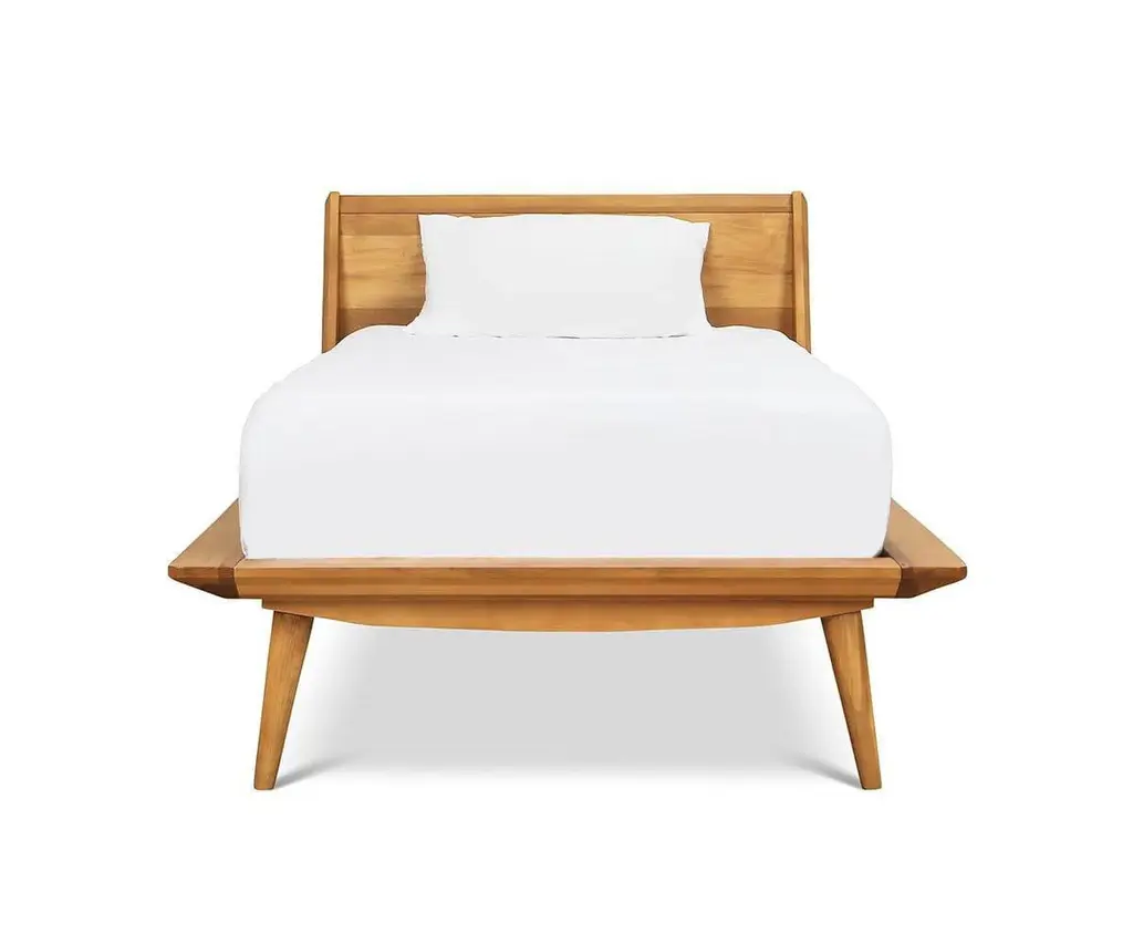 The Nordic-inspired Bolig Bed features a unique and iconic silhouette crafted from solid American poplar with a distressed finish. Weaving mid-century modern style into the design, this bed features pleasing angles and sturdy, tapered legs with reinforced design. The rustic-reclaimed look of this collection is achieved through an intentional distressing technique that applies burn and saw marks to the surface while retaining and highlighting natural characteristics in the wood. This technique results in a reclaimed driftwood appearance, which adds personality and a one-of-a-kind uniqueness to each piece. This item is intentionally distressed. Please view detailed photos showing range of distressing before adding to cart. Also available in a Walnut finish.