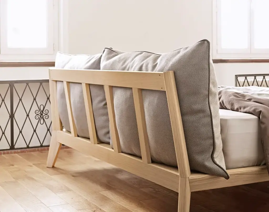 The Bora bed radiates comfort from every corner. It invites you to stretch out on it and read, resting on soft cushions, or to just lie back and rest, drifting into peaceful dreams. The cushion covers are removeable and there is a range of fabric and leather options. For the frame, you can select any of the woods from the Treku range.