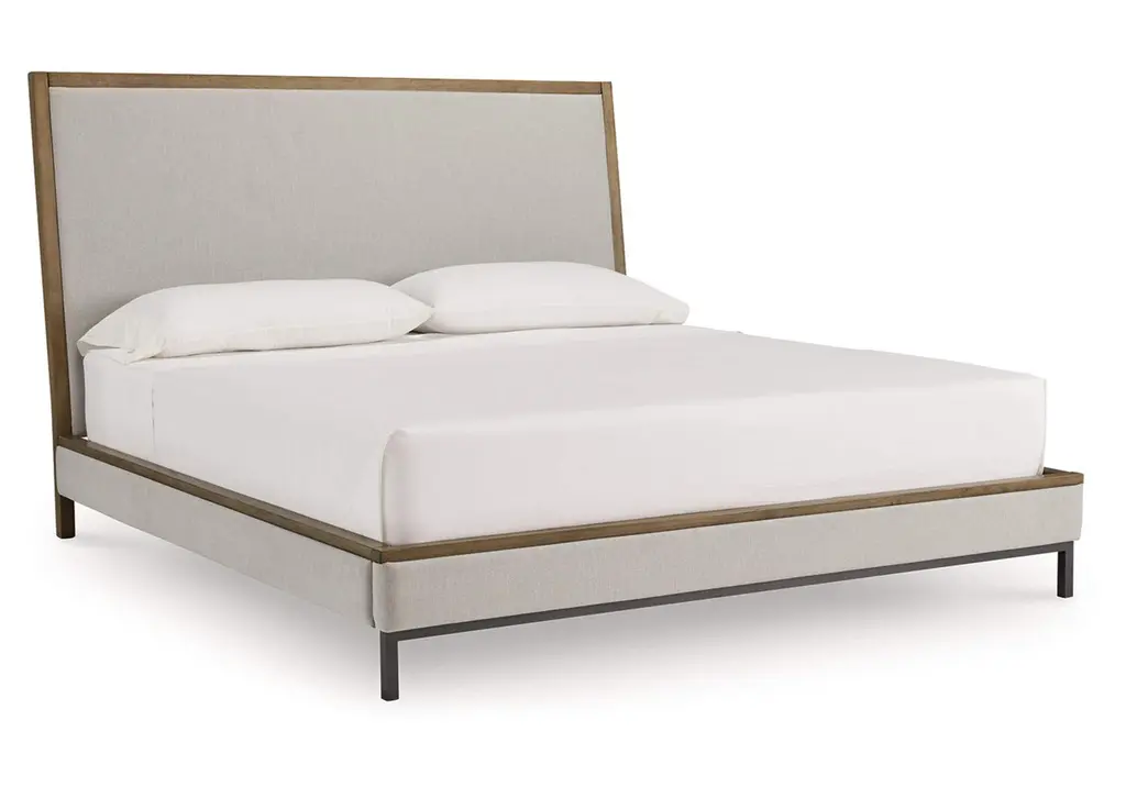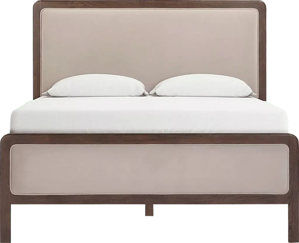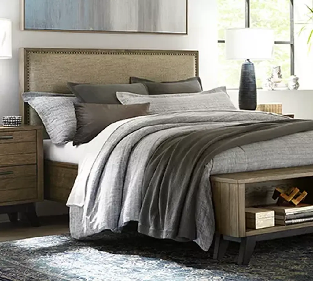 Our Boulder Creek upholstered bed mixes plush, light-colored fabric with a weathered oak wood finish and the added detail of nailhead trim. With clean lines in its silhouette, this piece will bring a sharp finish to your bedroom. Use the information below along with the height of your mattress to select the right foundation for your new bed. Our Havertys sleep experts can also help you select the perfect mattress for your sleep needs.
