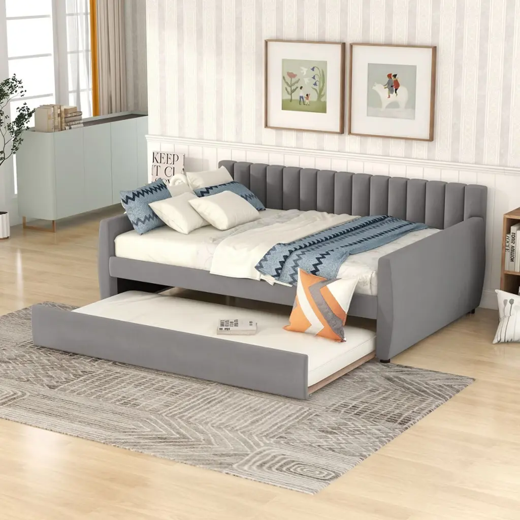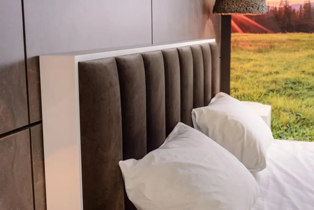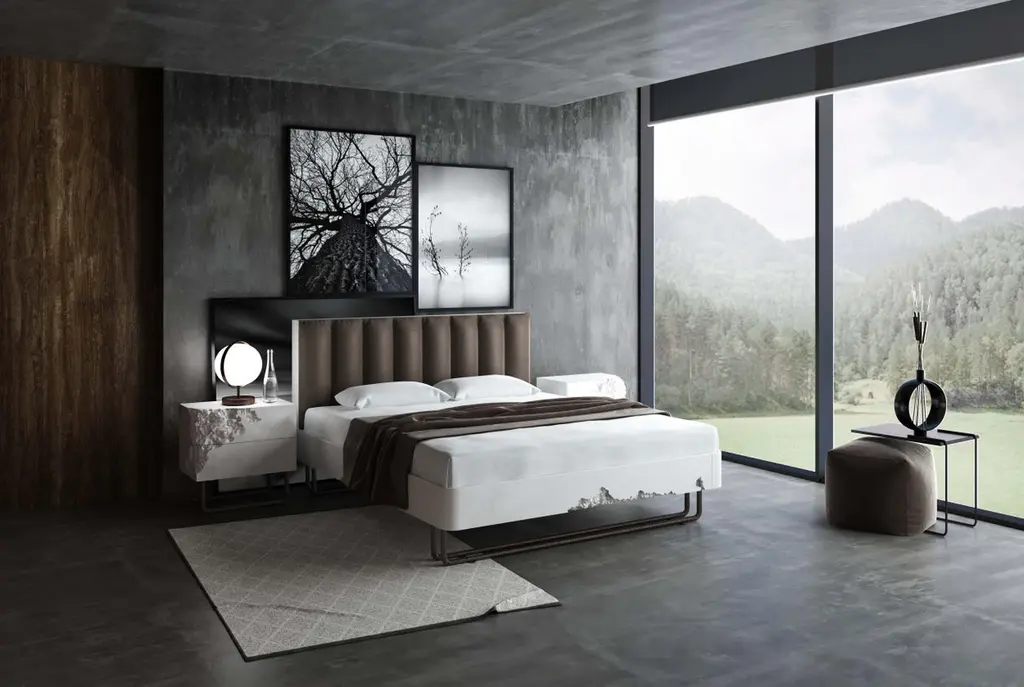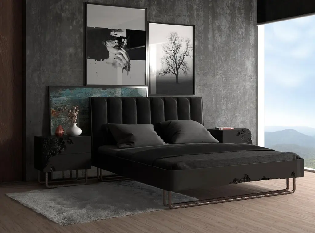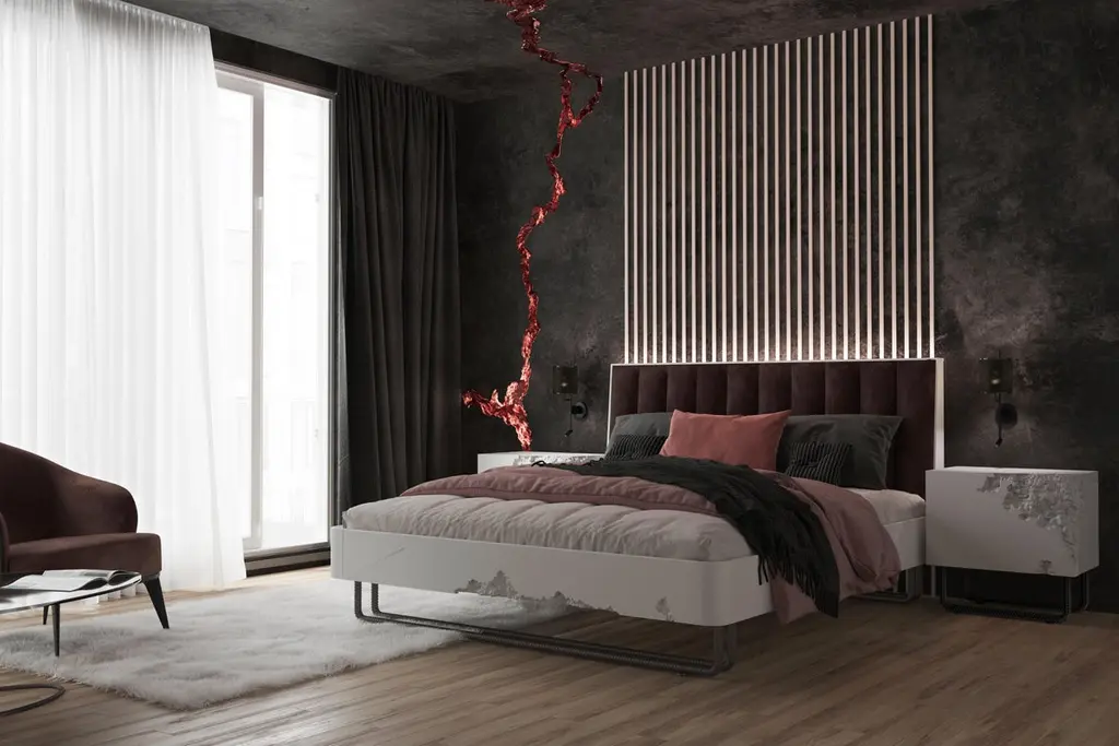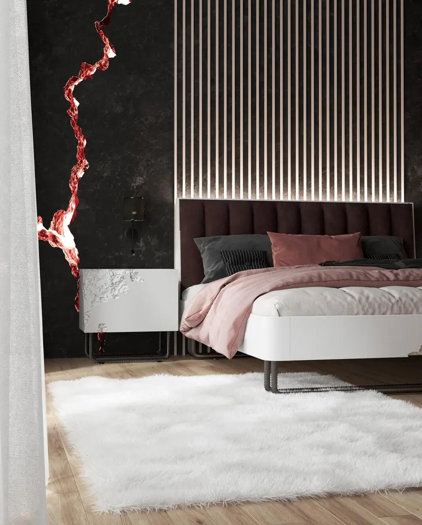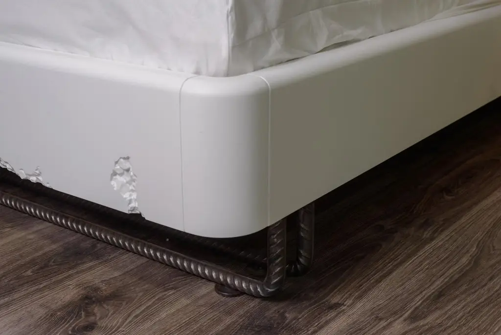 Break Free Double Bed by PANOPTIKUM COLLECTIONSDimensions: D 220 x W 190 x H 110 cm.Materials: Solid wood, plywood, JAB fabric, foam, and paint.A continuous aesthetic transformation of a recreation area. The bed seems to hover on the airy but sturdy legs that have gone from the construction industry to design. BreakFree Technology: a powerful demonstration of the embodiment of a technological idea that can be used in other individual interior and architectural solutions, art projects, and installations. The bed could be assembled with a mattress on request.PANOPTIKUM COLLECTIONS is proof of the feasibility of the materialization of ideas, even the most unusual ones, which were embodied in astonishing yet functional interior objects. We created this platform for experimentation with design objects, ideas, materials, shapes, and textures. This is a real collection of unusual objects, each of which was once just a reckless idea. The most expensive ideas are those whose implementation requires not only material resources but also courage, intuition, and skill.