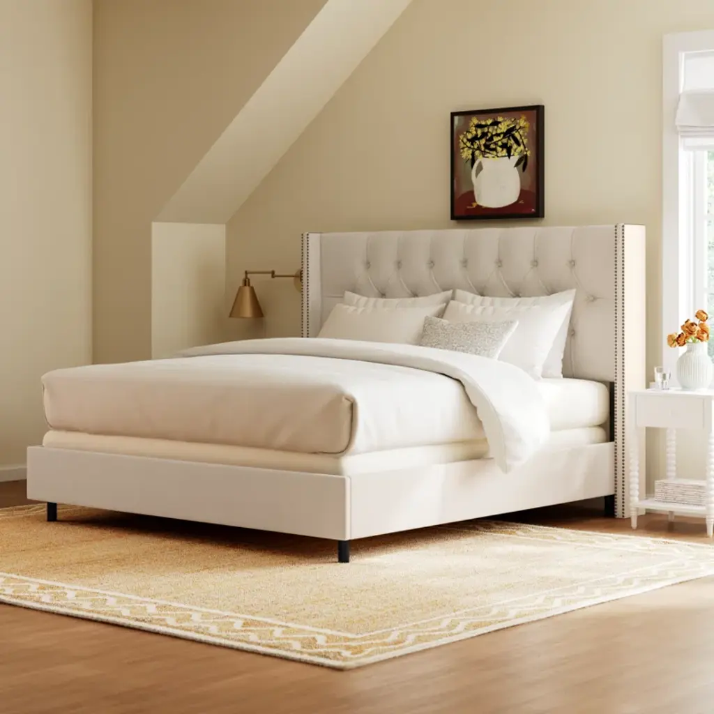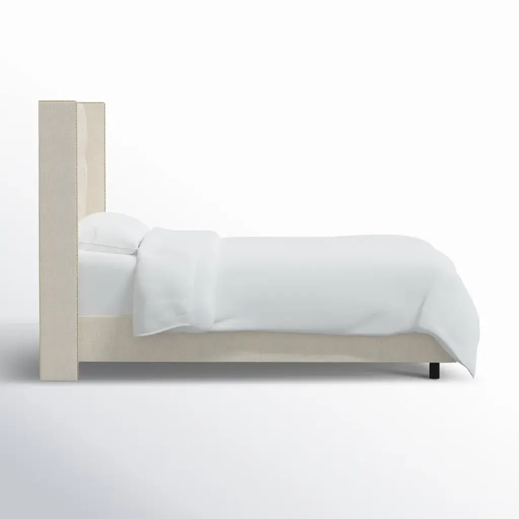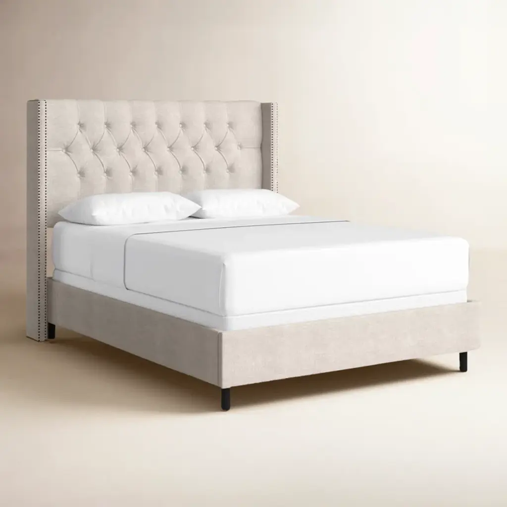 Create a dreamy sleepscape starting with this classic headboard. Crafted from solid pine wood, it features a high, wingback design that’s padded and upholstered. Nailhead trim and button tufting add visual texture. Top with the box spring and mattress of your choice (sold separately) and make up with crisp linens for your most restful retreat.