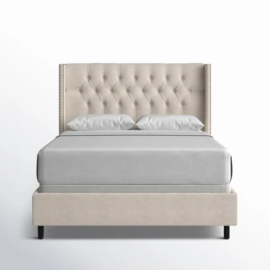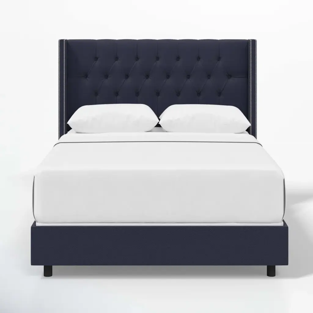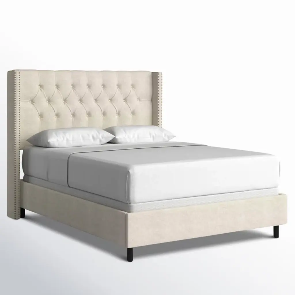 Create a dreamy sleepscape starting with this classic headboard. Crafted from solid pine wood, it features a high, wingback design that’s padded and upholstered. Nailhead trim and button tufting add visual texture. Top with the box spring and mattress of your choice (sold separately) and make up with crisp linens for your most restful retreat.