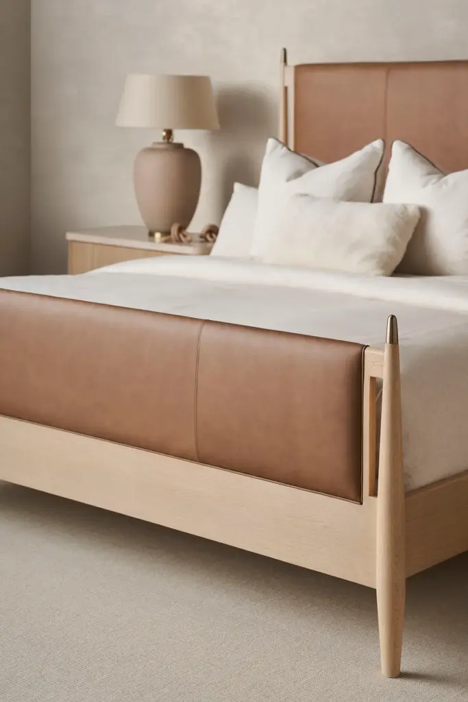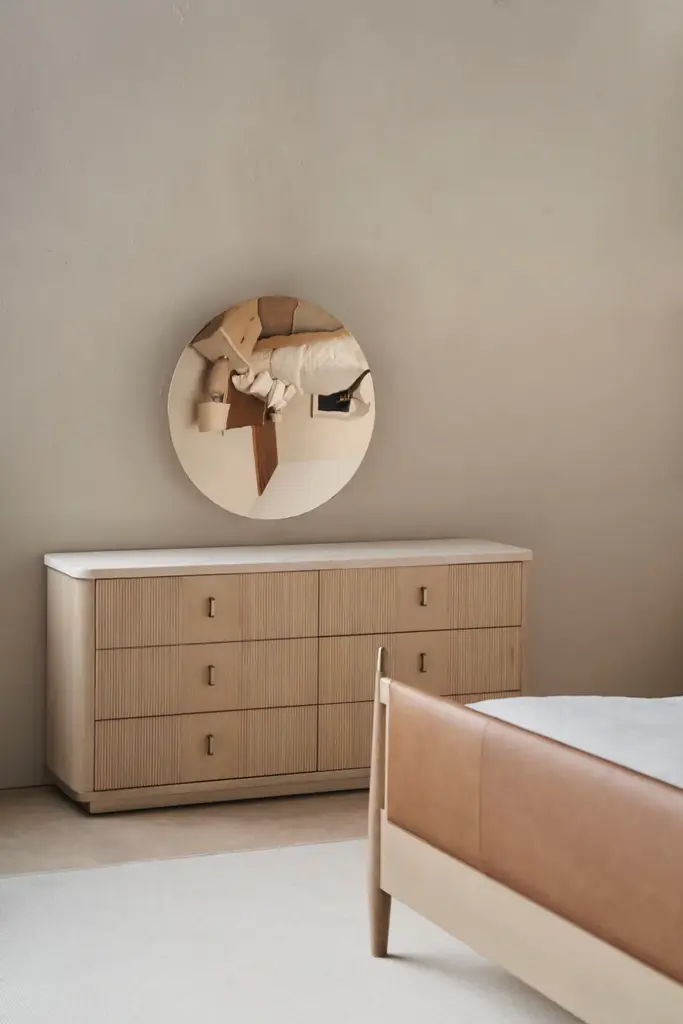 With flowing modern lines and rich use of material, the Rhythm queen and king bed bring a simple yet sophisticated cadence to bedroom interiors. Tailored in a lavish, camel-colored leather, its clean, parsons-style headboard warmly complements a Sun sun-drenched oak wood frame. Metal finials in a Lucent Bronze finish accentuate subtly tapered posts with a note of luxe.