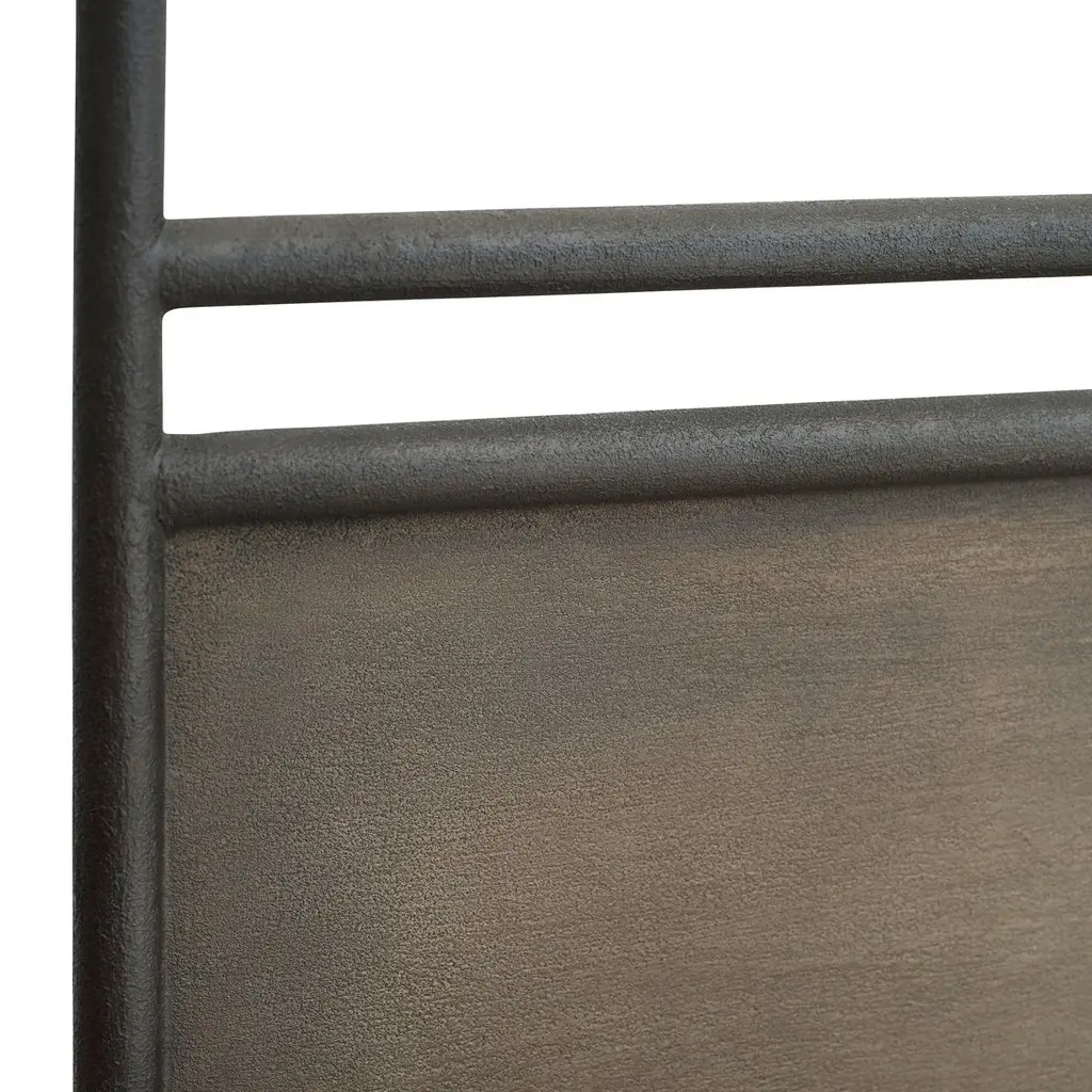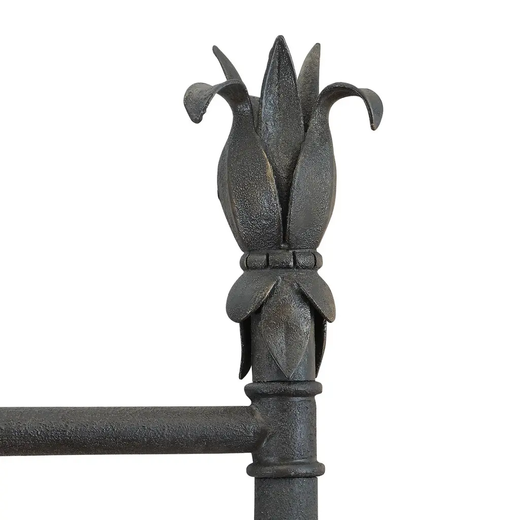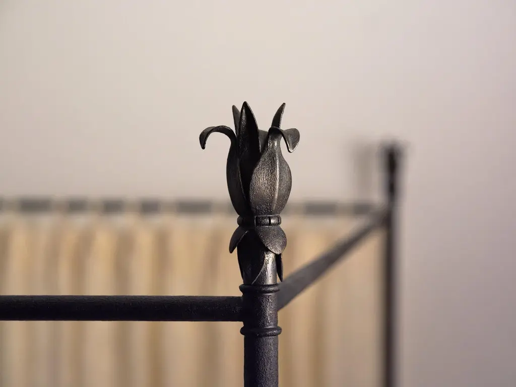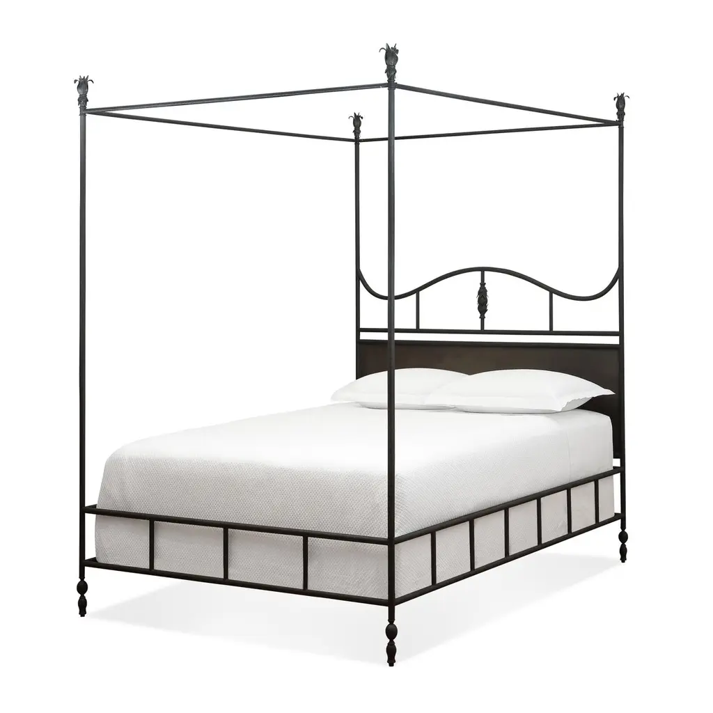 A canopy bed does wonders for a room—it not only creates a striking focal point but also elevates both your space and your spirits. You spend a third of your life asleep, so why not elevate that experience, too? Our Marlon Bed has a crisp, contemporary design—inspired by Italian Renaissance Revival style, with its strong forms—feels just as at home in a modern apartment as it would a classic villa. The Marlon Bed works wherever you want it, as long as your ceiling clears ninety-two inches (and a smidge more).Floor to top of slats: 9.5”Floor to bottom of side Rail: 8.5”Floor to top of Side Rail: 18.5”Slats to top of side rail: 9”Side rail height: 10”- Made of mild steel, with a heavily textured bronze finish.- Assembly hardware included.- We recommend a 9” boxspring.