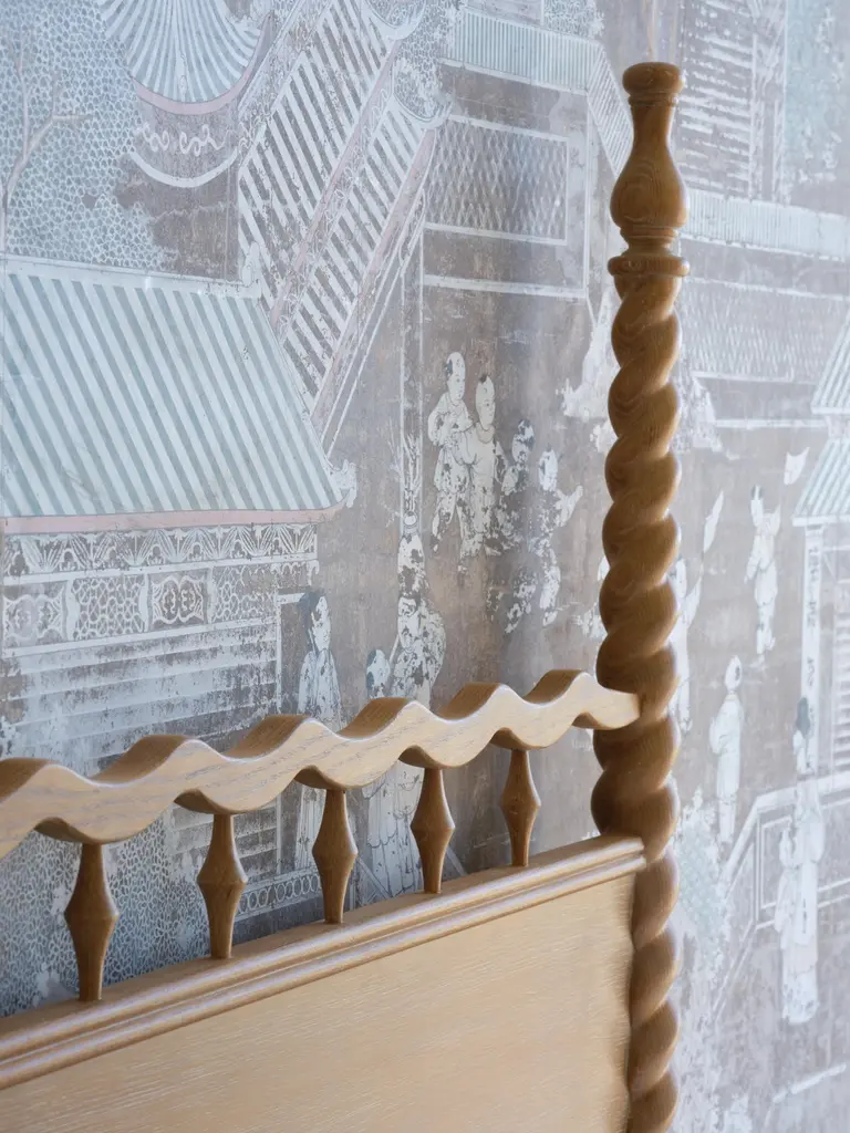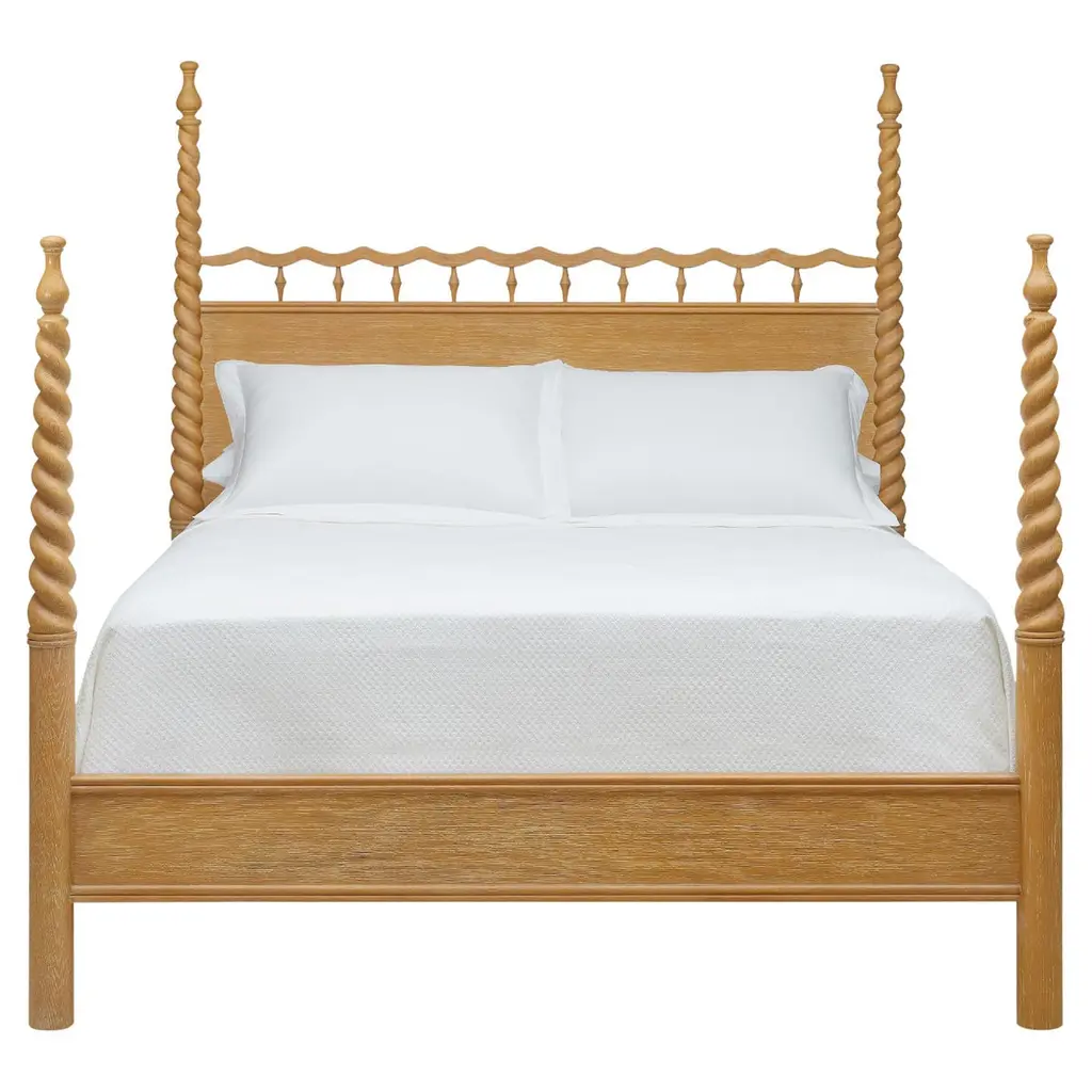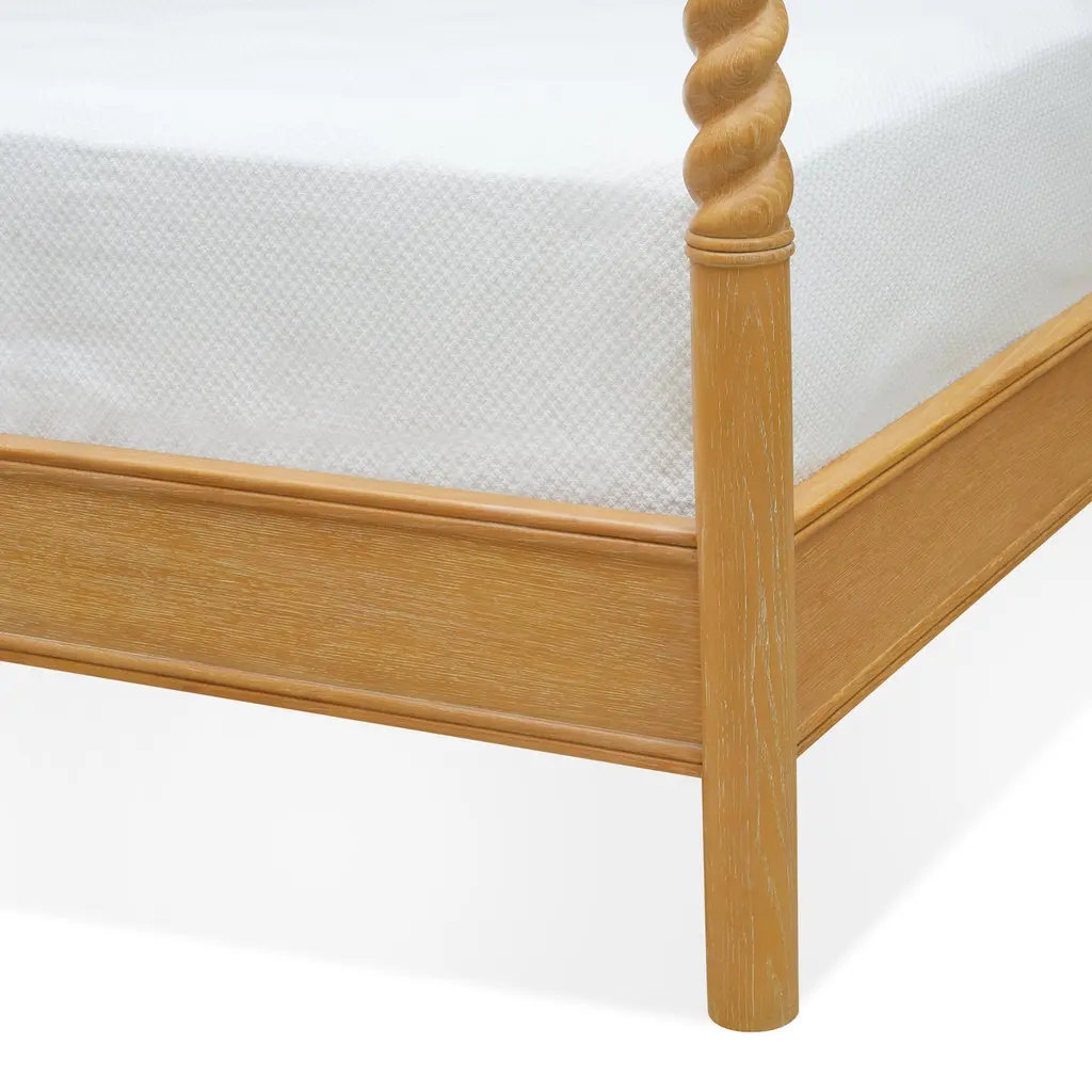 Don’t get it twisted—or actually, do. With carved, barley twist posts crowned by sculptural finials and a sinuous headboard detail, the Twisted Sister Bed brings a sense of movement to classic form. The cerused oak finish accentuates the wood’s natural grain, providing a perfect foundation for crisp white linens or a riot of patterned sheets. Available in King or Queen sizes.Queen: 66.75"H x 65.5"W x 85.31"DKing: 66.75"H x 81.5"W x 85.31"DBed slats to top of rail: 5.86"Recommend 5" low profile box springAdditional Information- Hand-carved hardwood- Hand-applied bamboo finish- Assembly hardware included- We recommend a low profile, 6” boxspring