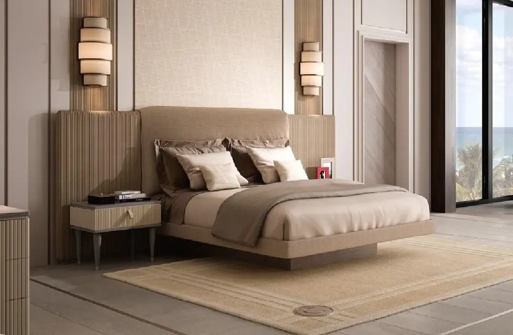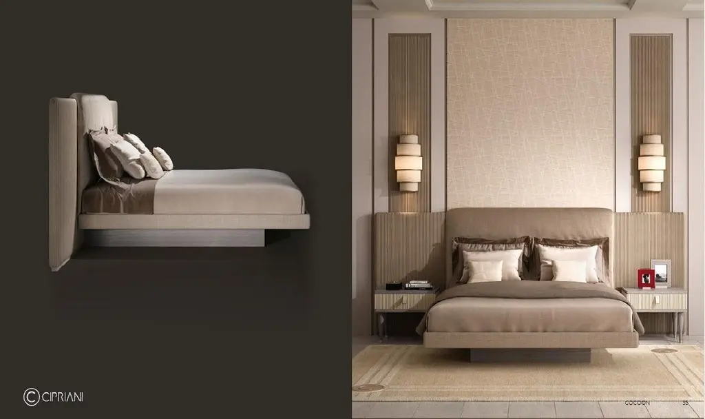 The Cocoon bed, available in different sizes, is a very sophisticated piece where different materials are perfectly harmonized.The iconic Cocoon pattern is here presented on the parts in nabuk, while the recessed wooden basement gives the perception that the bed is floating in the air.The bed is available also with side panels, to embrace the night tables and create an all-in-one solution for your bedroom.