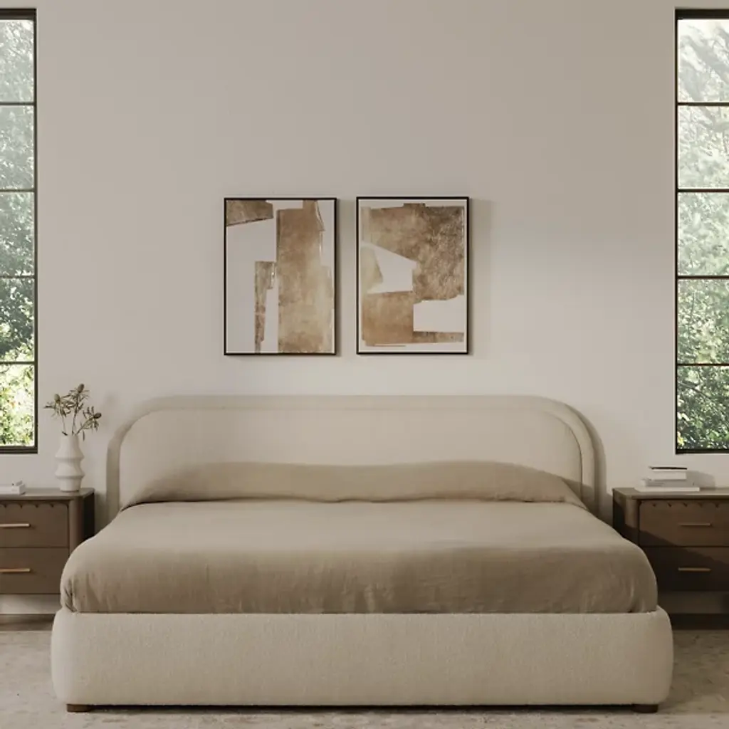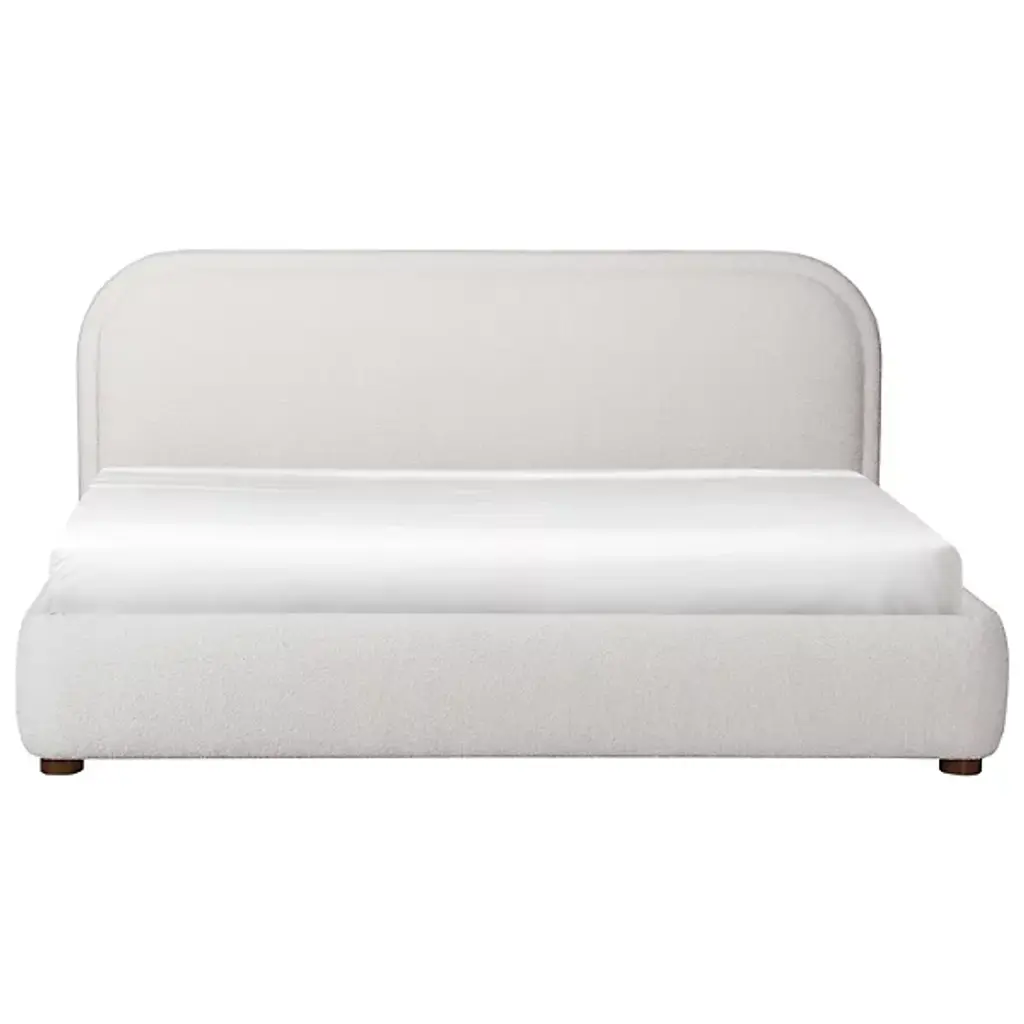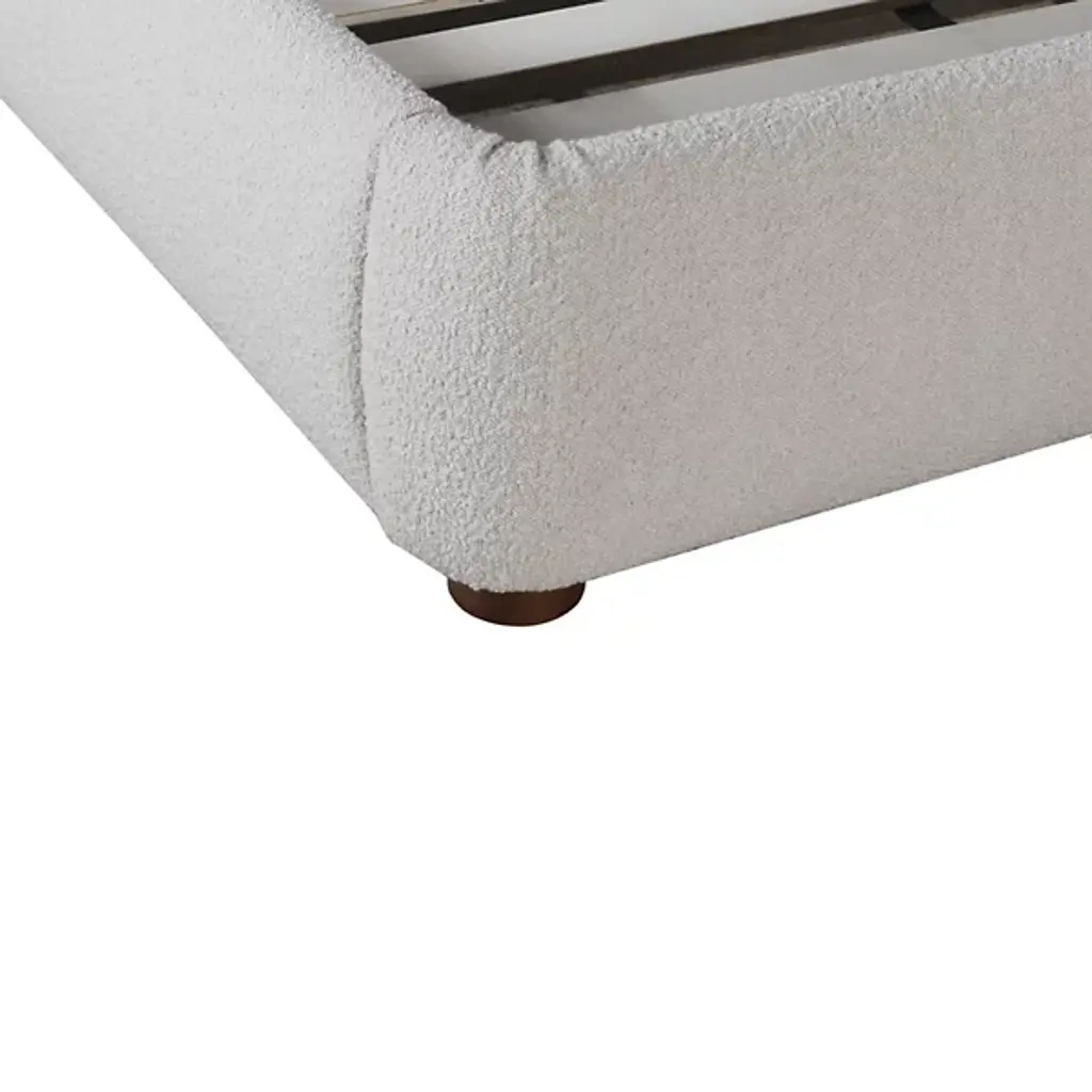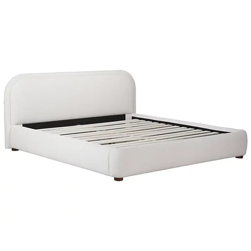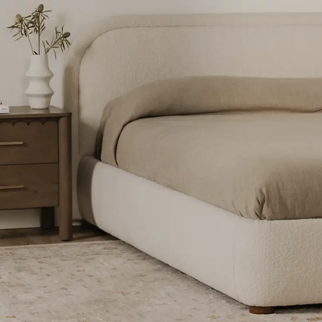 Rest and de-stress in the comfortable confines of the Cancilla Bed from Huxe. This considered creation features a distinct silhouette; it has no angular lines or sharp edges and instead expresses a mellow contemporary presence with enduring strength. A curve-cornered headboard ascends from a pine frame, resting mattresses on strong support slats, with every exposed surface padded and surfaced in bouclé upholstery that invites sitting and sleeping. The only non-padded sections are the dark wooden post-style legs that expose slightly from its cloudlike construction.