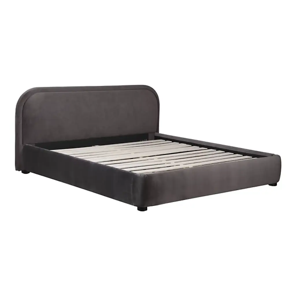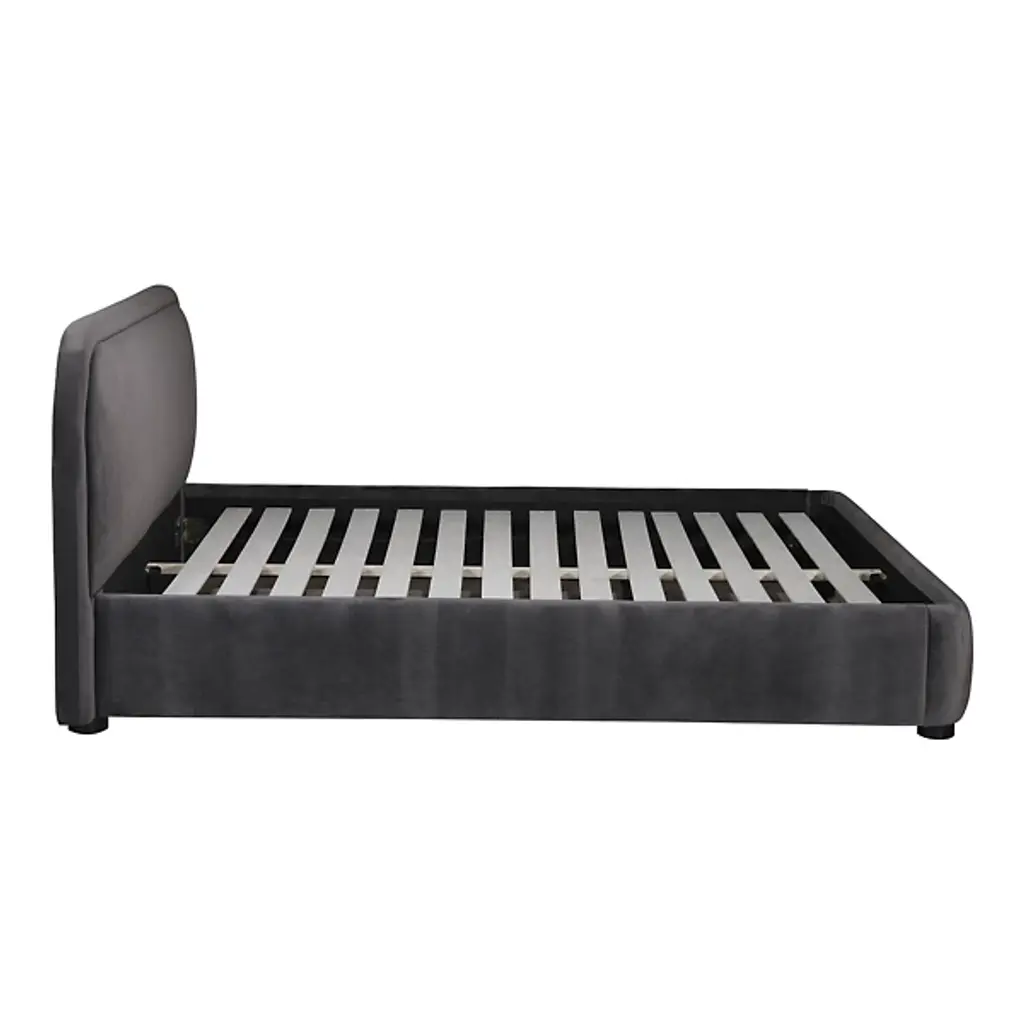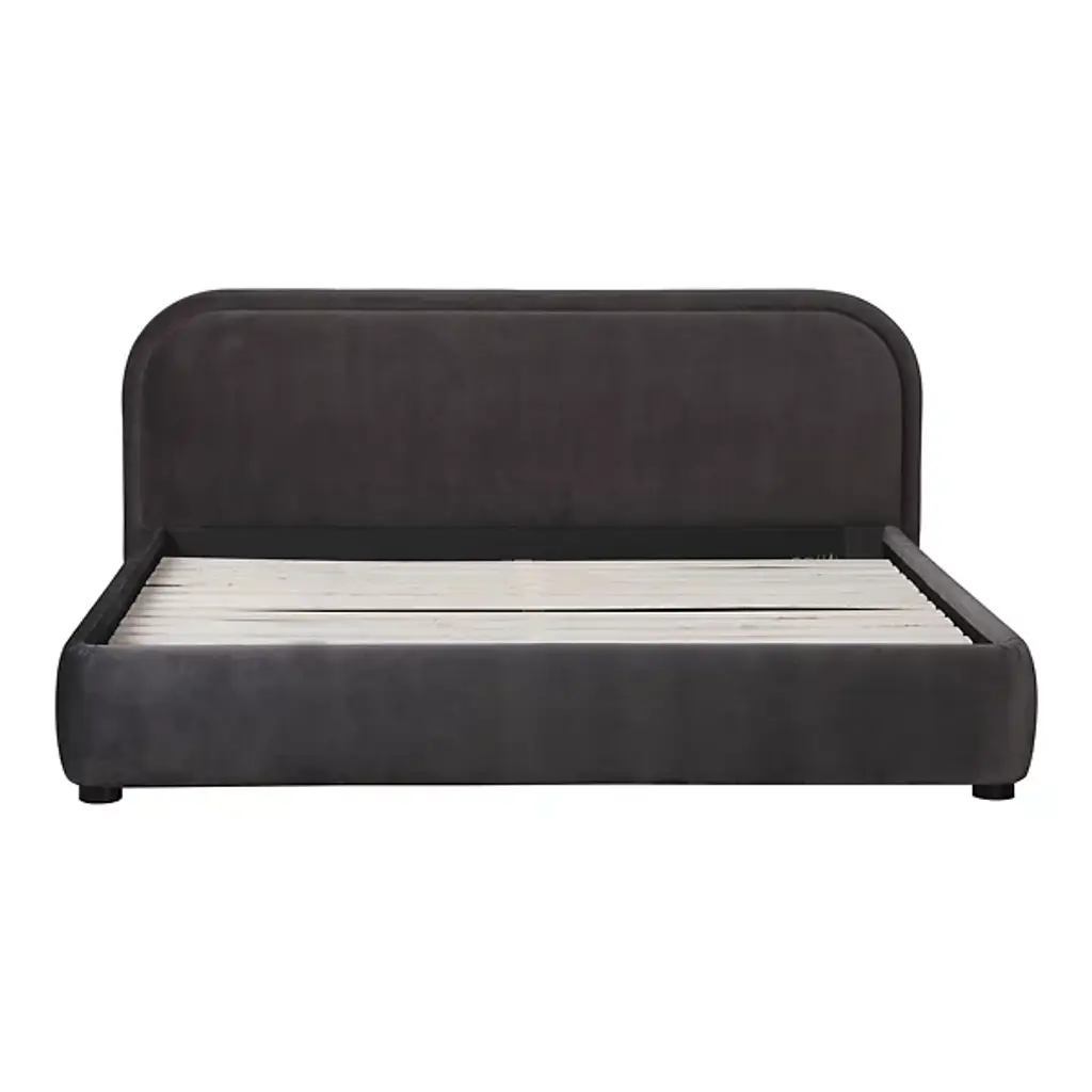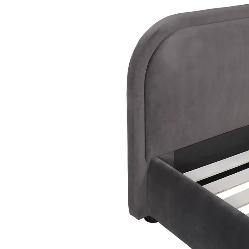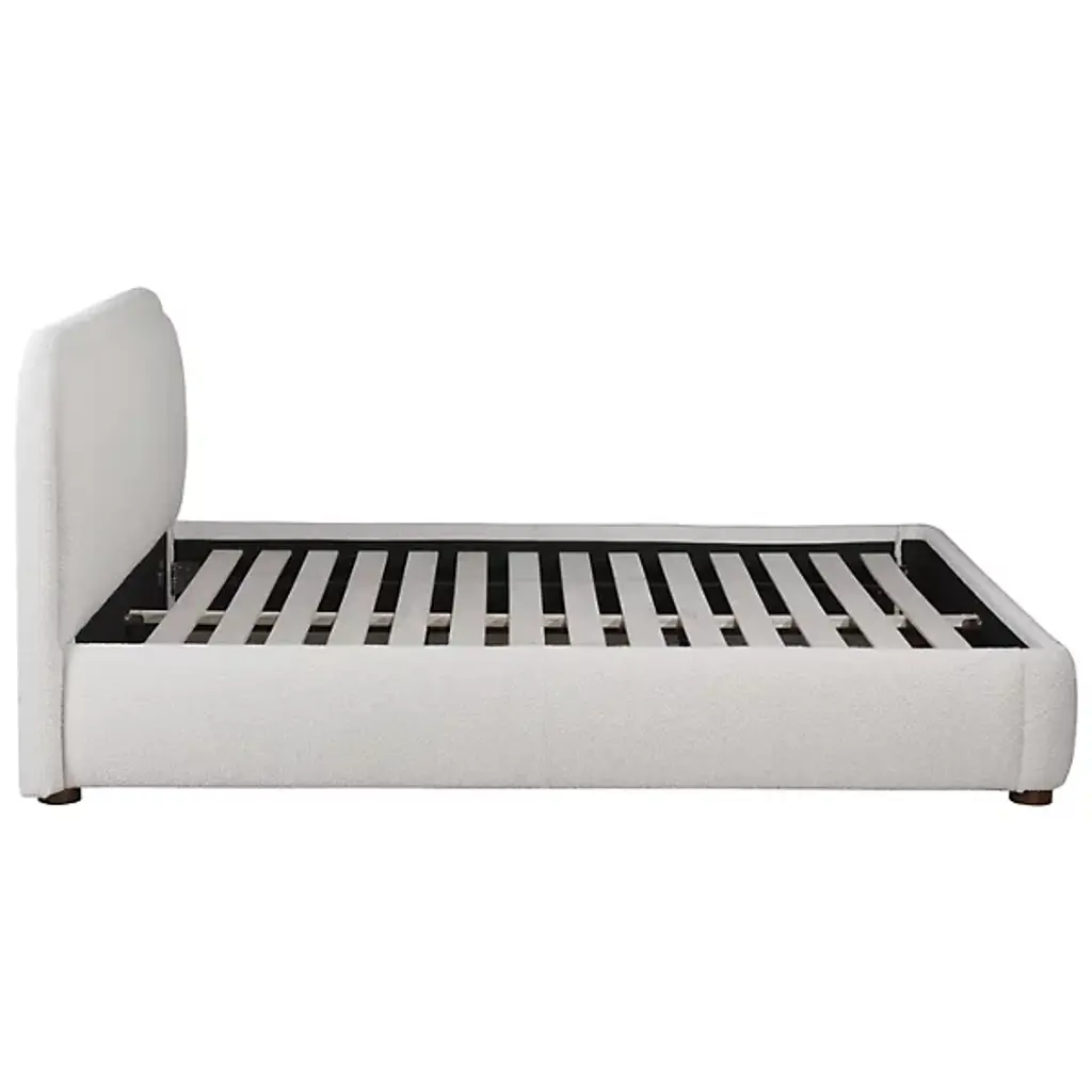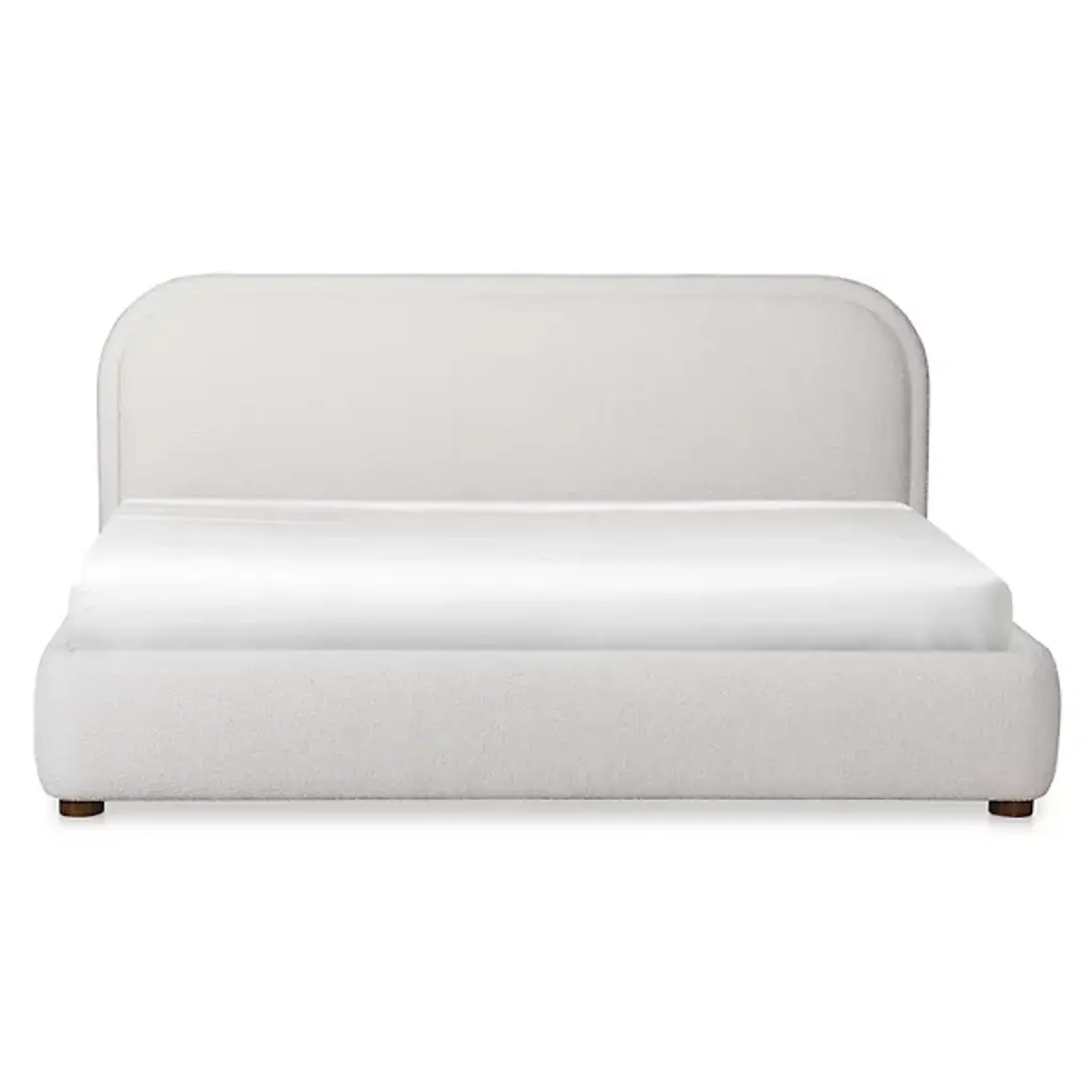 Rest and de-stress in the comfortable confines of the Cancilla Bed from Huxe. This considered creation features a distinct silhouette; it has no angular lines or sharp edges and instead expresses a mellow contemporary presence with enduring strength. A curve-cornered headboard ascends from a pine frame, resting mattresses on strong support slats, with every exposed surface padded and surfaced in bouclé upholstery that invites sitting and sleeping. The only non-padded sections are the dark wooden post-style legs that expose slightly from its cloudlike construction.