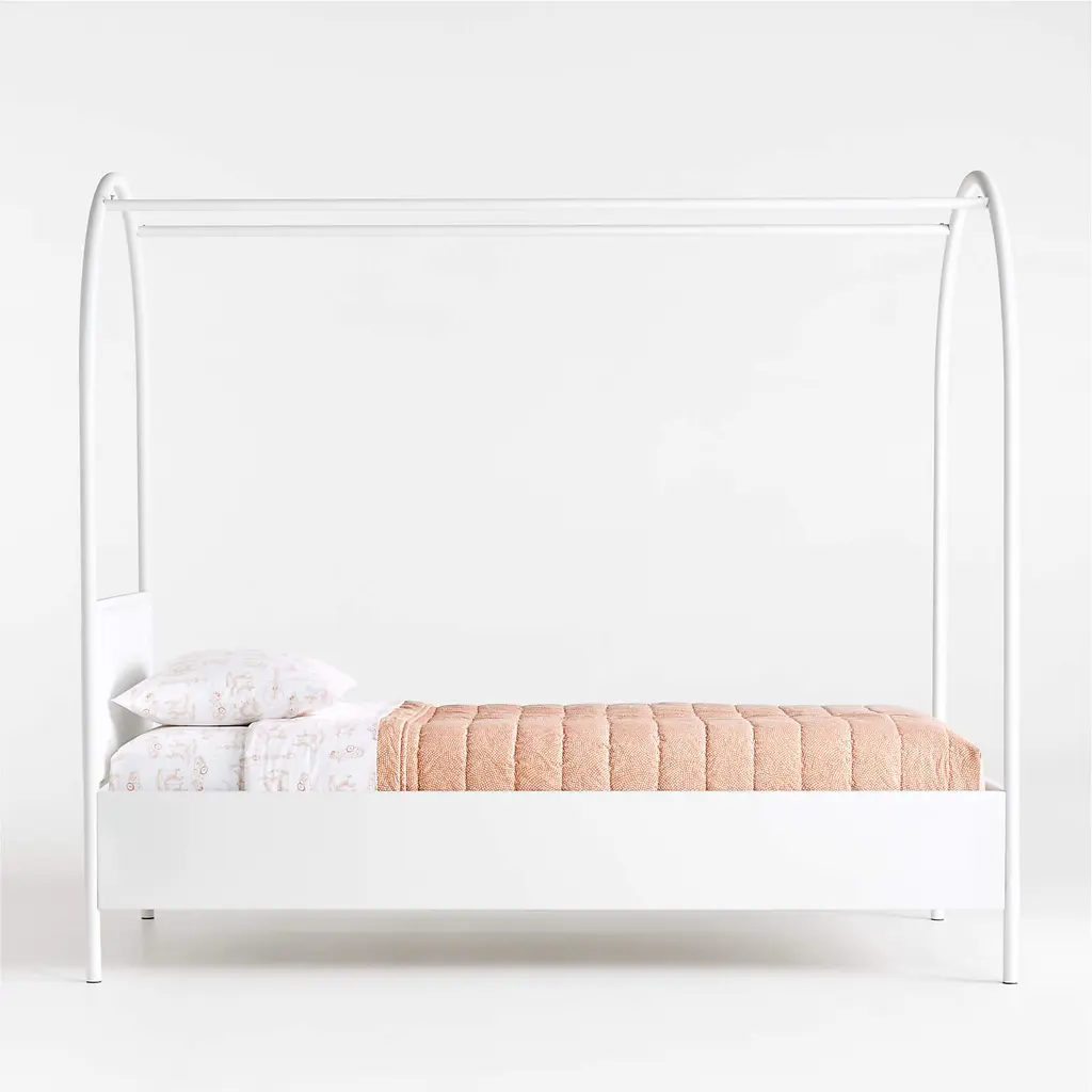 Sleek and sheltering, our exclusive Canyon canopy bed arcs a dreamy, modern sleep statement in white tubing. Solid metal bed rails launch the dramatic, barrel-shaped canopy with rods at the top. Sized down for kids, the twin bed frame designed by Leanne Ford squares off a headboard neatly upholstered in white fabric.