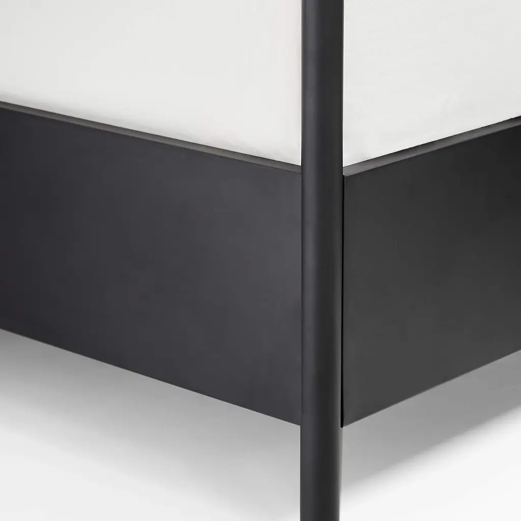 Sleek and sheltering, our exclusive Canyon canopy arcs a modern sleep statement in black metal tubing. Solid metal bed rails launch the dramatic, barrel-shaped canopy with rods at the top for gauzy draping. Designed by Leanne Ford, the bed frame squares off a headboard neatly upholstered in neutral polyester.
