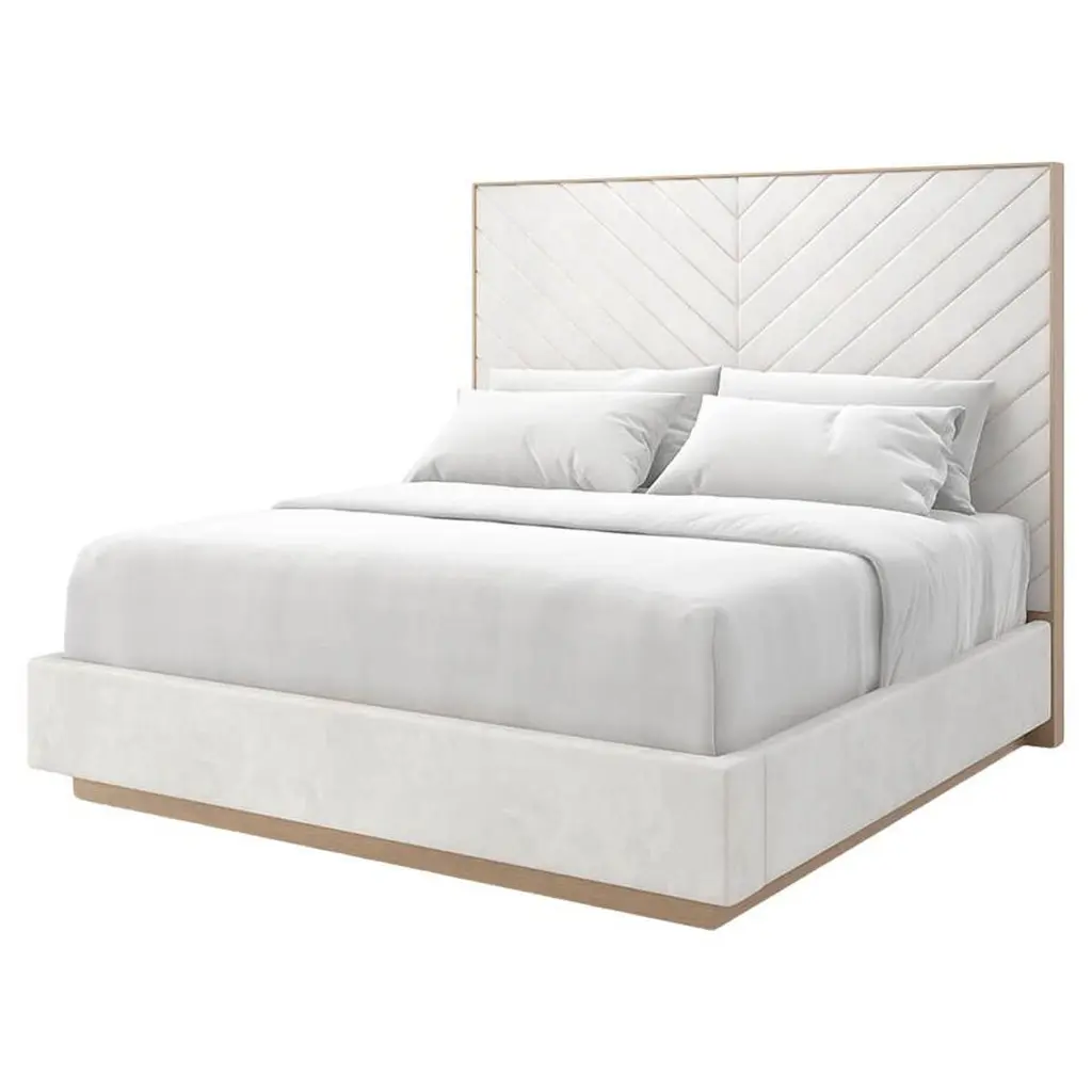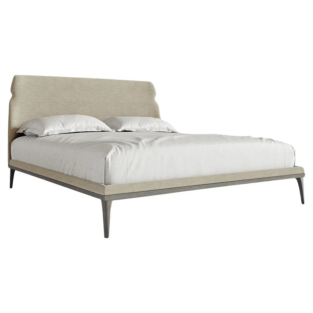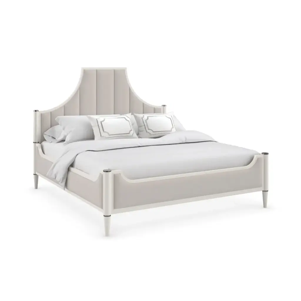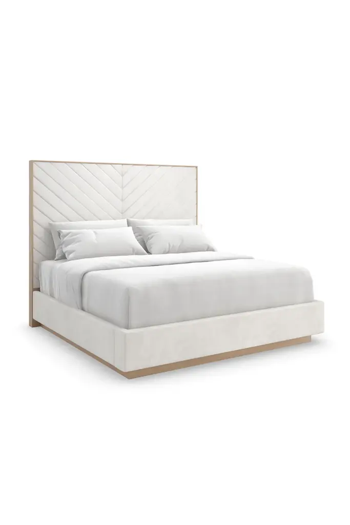 Handcrafted king bed features modern channel tufting design of converging angles that create a mesmerizing chevron pattern Fully upholstered headboard, footboard, and sidereal Wood trim around headboard and base in ash driftwood Made of hardwood solids, viscose, and cotton Adjustable slat roll bedding Hardware included Finished back Plint base Overall, approx. 84.25"W x 82"D x 67.75"T Imported Weight, 370.0lbs Boxed weight, approximately 400.0lbs Shipping Direct from Vendor, usually ships within 120 business days. About Caracole: Caracole redefines luxury with its innovative and fashion-forward furniture designs. Blending modern aesthetics with traditional craftsmanship, each piece exudes elegance and comfort. Caracole invites you to embrace a lifestyle where style is a celebration of personal expression.