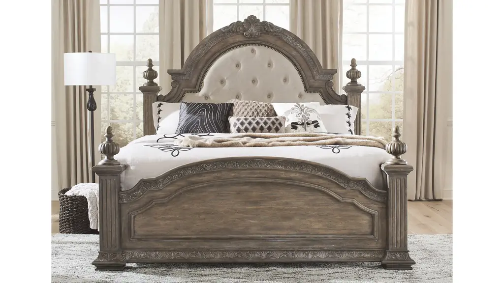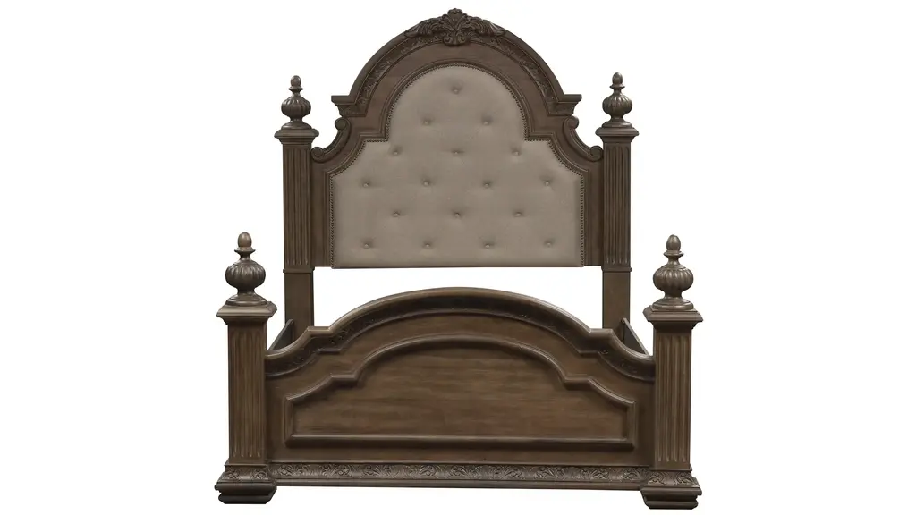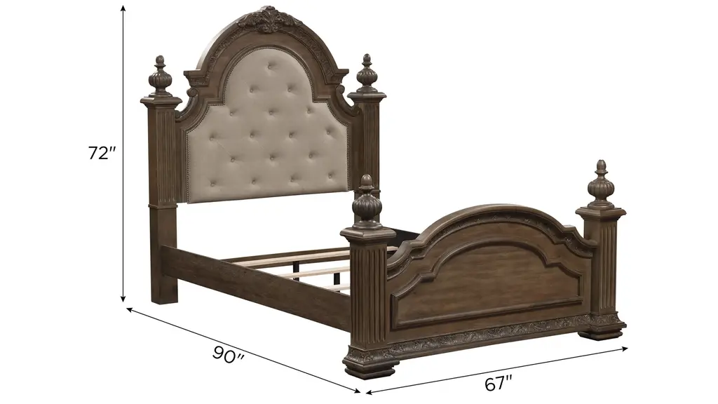 Indulge in luxury with the Carlisle Court Upholstered Poster Bed. Crafted with excellence using rubberwood solids and rustic hickory veneers, this bed features a Chestnut with Gray Dusty Wax finish. Fluted square turned posts are framed with acanthus leaf carved accents along with decorative top finials. The headboard has an arched crown and is upholstered in a button tufted Sand Linen chenille fabric with a nail head trim. The top center crown is highlighted with a carved pediment. The poster footboard is arched and features bead molding and carved acanthus leaves. Use the poster bed rails which feature bolt-on support to complete the bed.