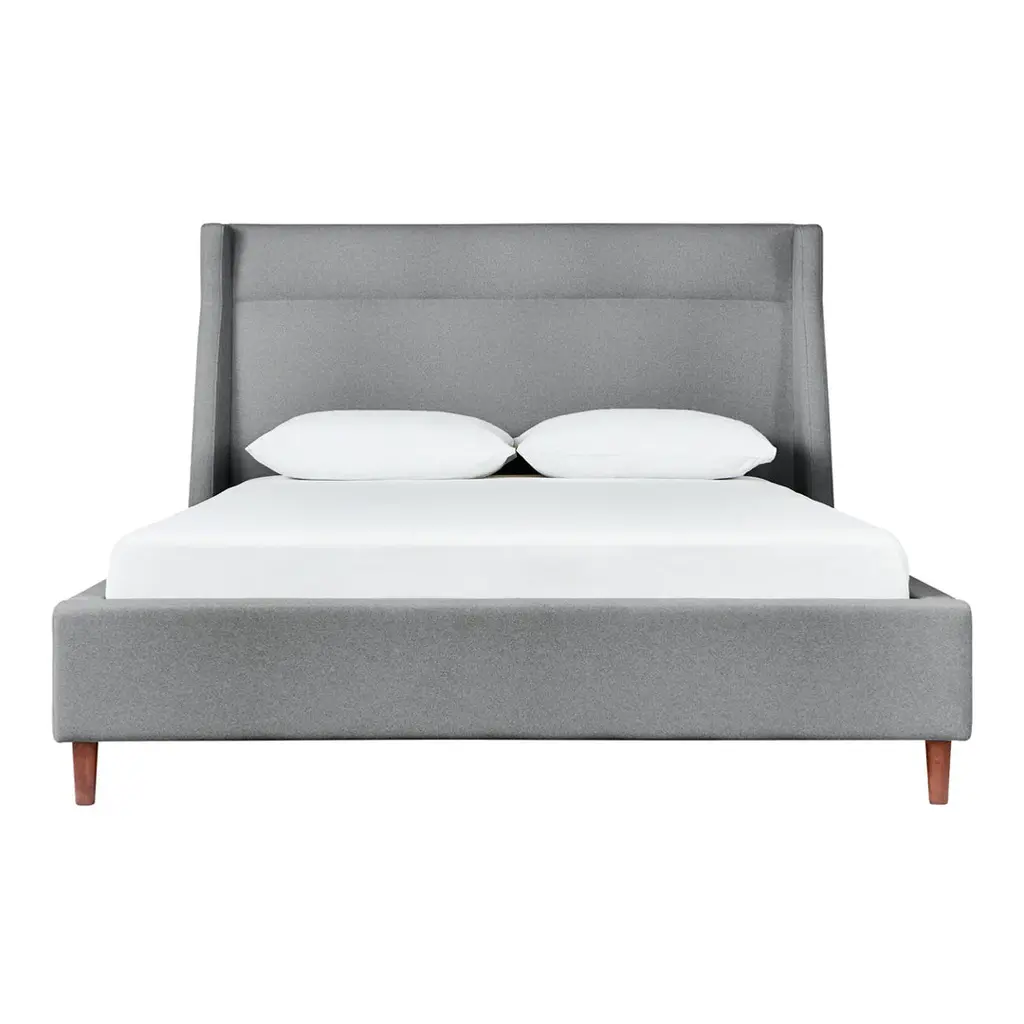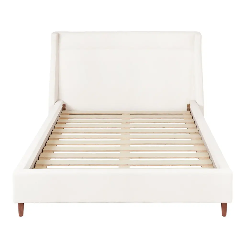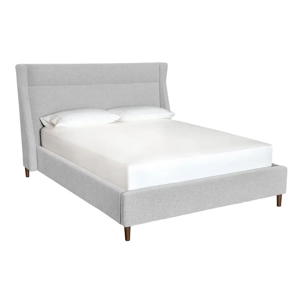 The Carmichael Bed fuses traditional and contemporary sensibilities, bringing clean, modern lines to a classic style. The design features a fully upholstered headboard, footboard and side rails, with elegant, tapered solid wood legs. The bed includes a sturdy mattress suspension system which eliminates the need for a box spring. All wood used in the frame and legs is FSC®-Certified, in support of responsible forest management.