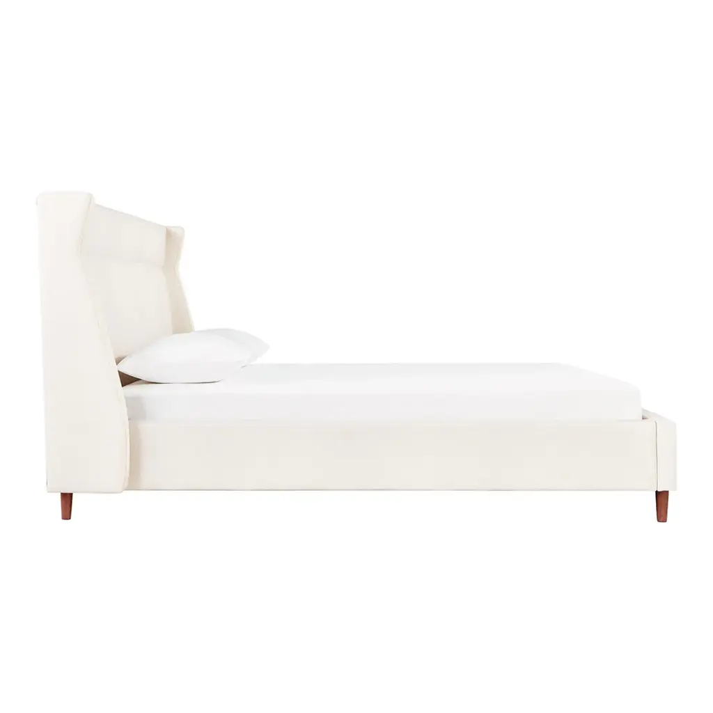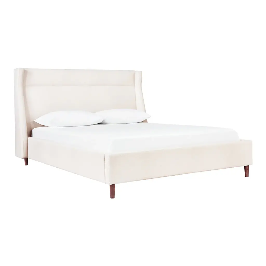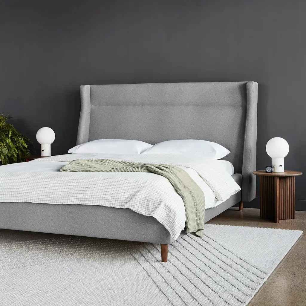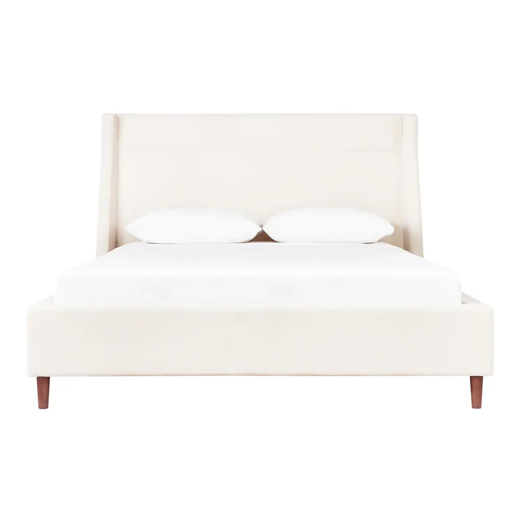 The Carmichael Bed fuses traditional and contemporary sensibilities, bringing clean, modern lines to a classic style. The design features a fully upholstered headboard, footboard and side rails, with elegant, tapered solid wood legs. The bed includes a sturdy mattress suspension system which eliminates the need for a box spring. All wood used in the frame and legs is FSC®-Certified, in support of responsible forest management.