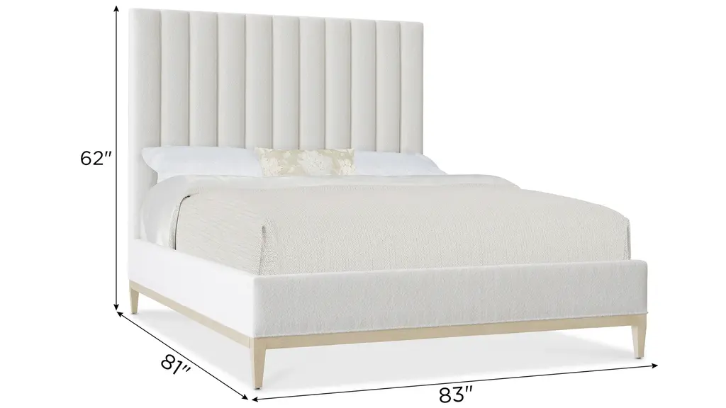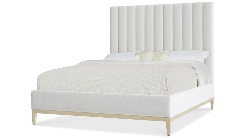 Create a serene and stylish bedroom retreat with the Cascade Upholstered Bed. Upholstered in soft, durable Wolf Pearl fabric, this bed offers a channeled fabric headboard and a wood base with tapered legs, bringing a modern, transitional feel to any space. The bed's light taupe finish on oak veneers, accented by subtle distressing, adds texture and tranquility. Its clean lines and neutral palette make it a versatile choice for a range of interior styles. Includes headboard, footboard, and rails for a cohesive look.