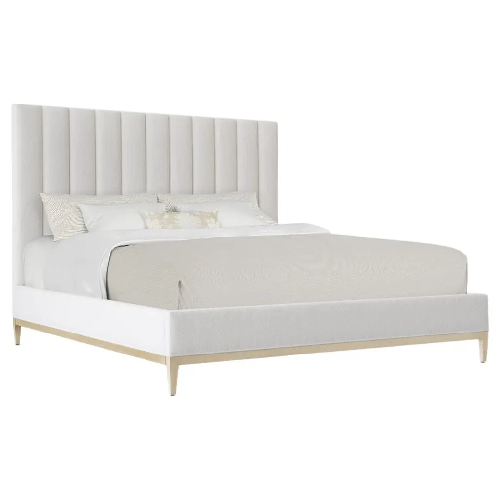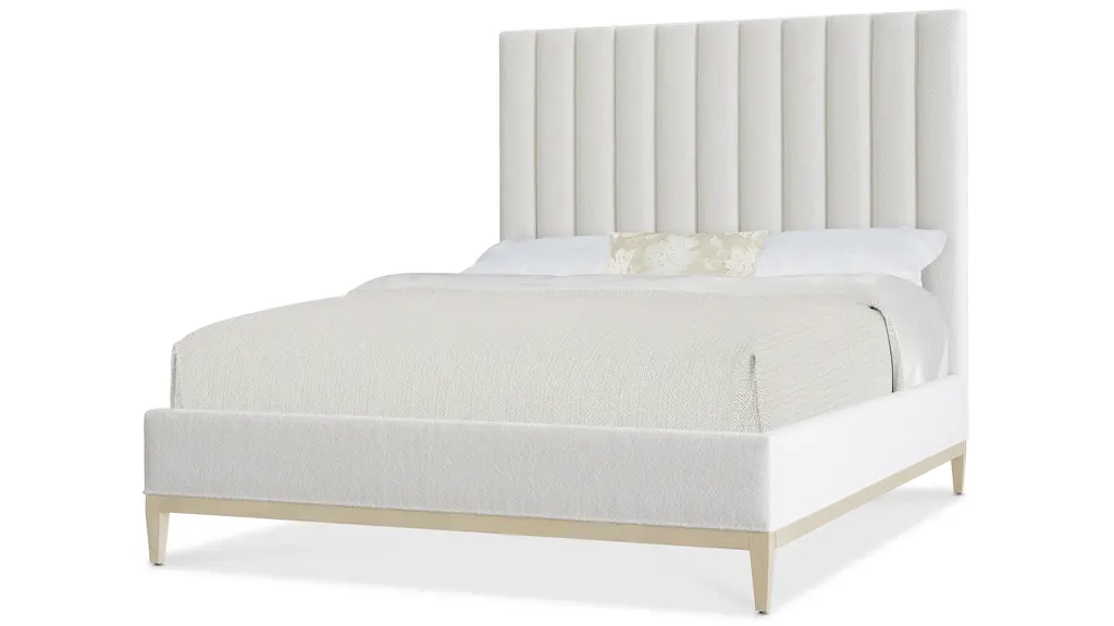 Create a serene and stylish bedroom retreat with the Cascade Upholstered Bed. Upholstered in soft, durable Wolf Pearl fabric, this bed offers a channeled fabric headboard and a wood base with tapered legs, bringing a modern, transitional feel to any space. The bed's light taupe finish on oak veneers, accented by subtle distressing, adds texture and tranquility. Its clean lines and neutral palette make it a versatile choice for a range of interior styles. Includes headboard, footboard, and rails for a cohesive look.