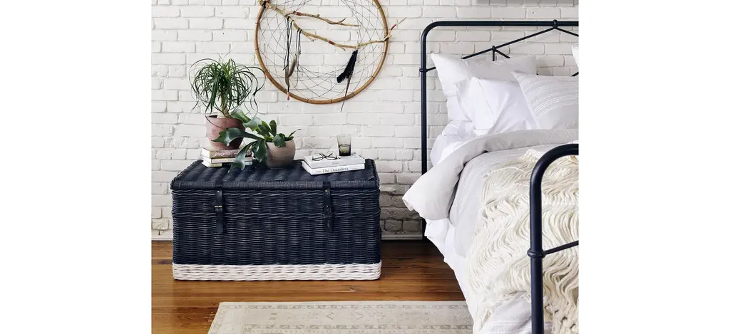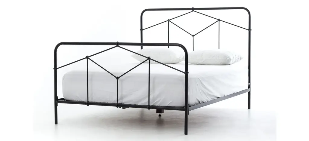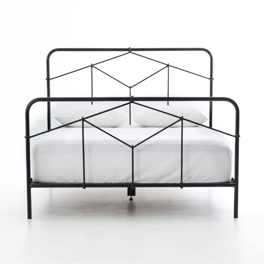 Modern geometric patterns update a design inspired by vintage European hospital beds. Simple iron tubing looks airy and feels substantial. Low-profile box spring recommended.