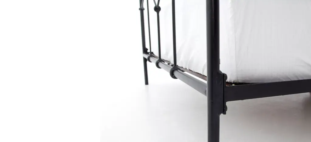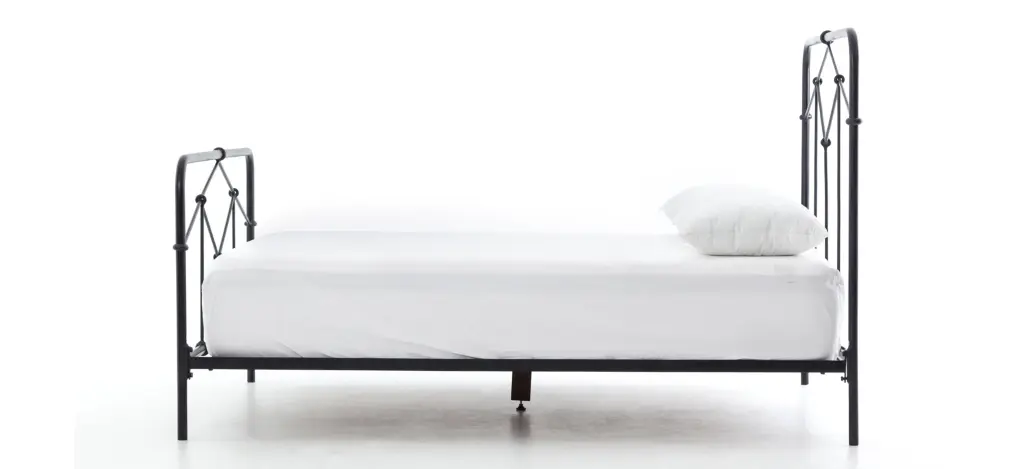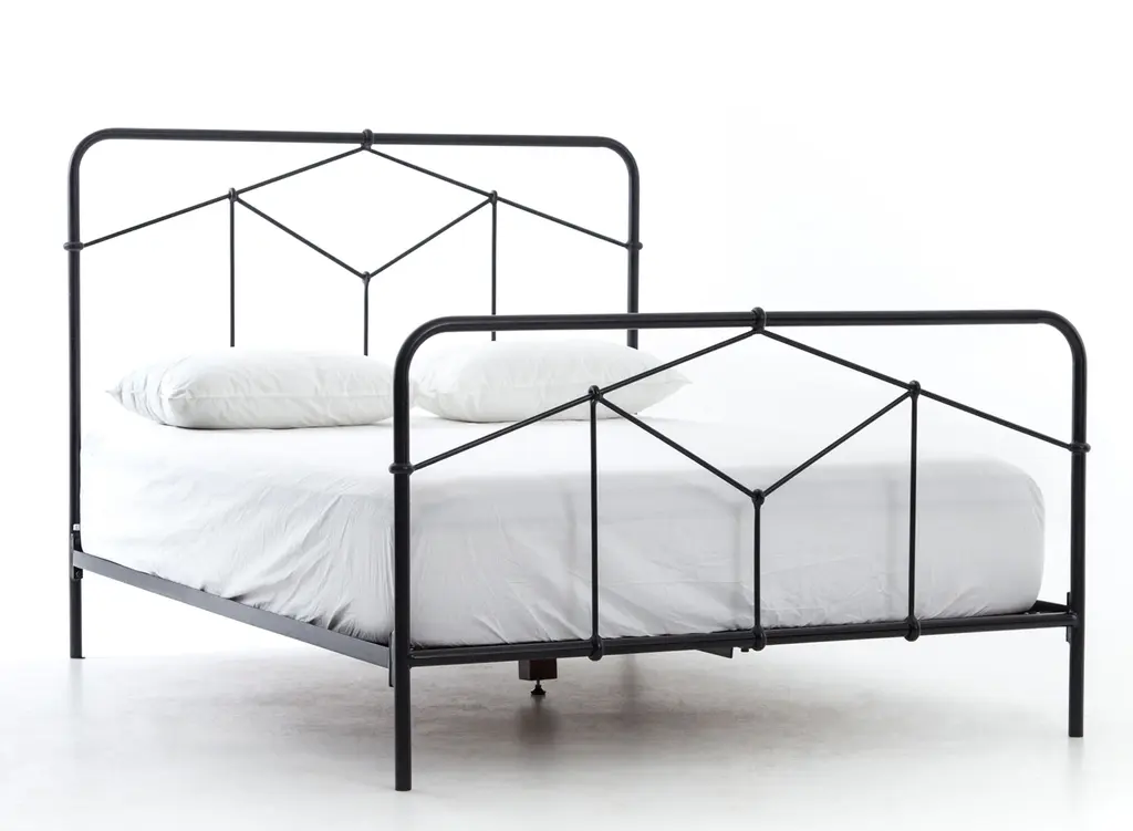 Modern geometric patterns update a design inspired by vintage European hospital beds. Simple iron tubing looks airy and feels substantial. Low-profile box spring recommended.