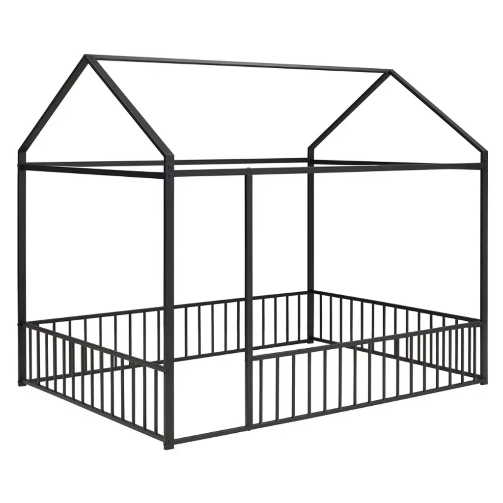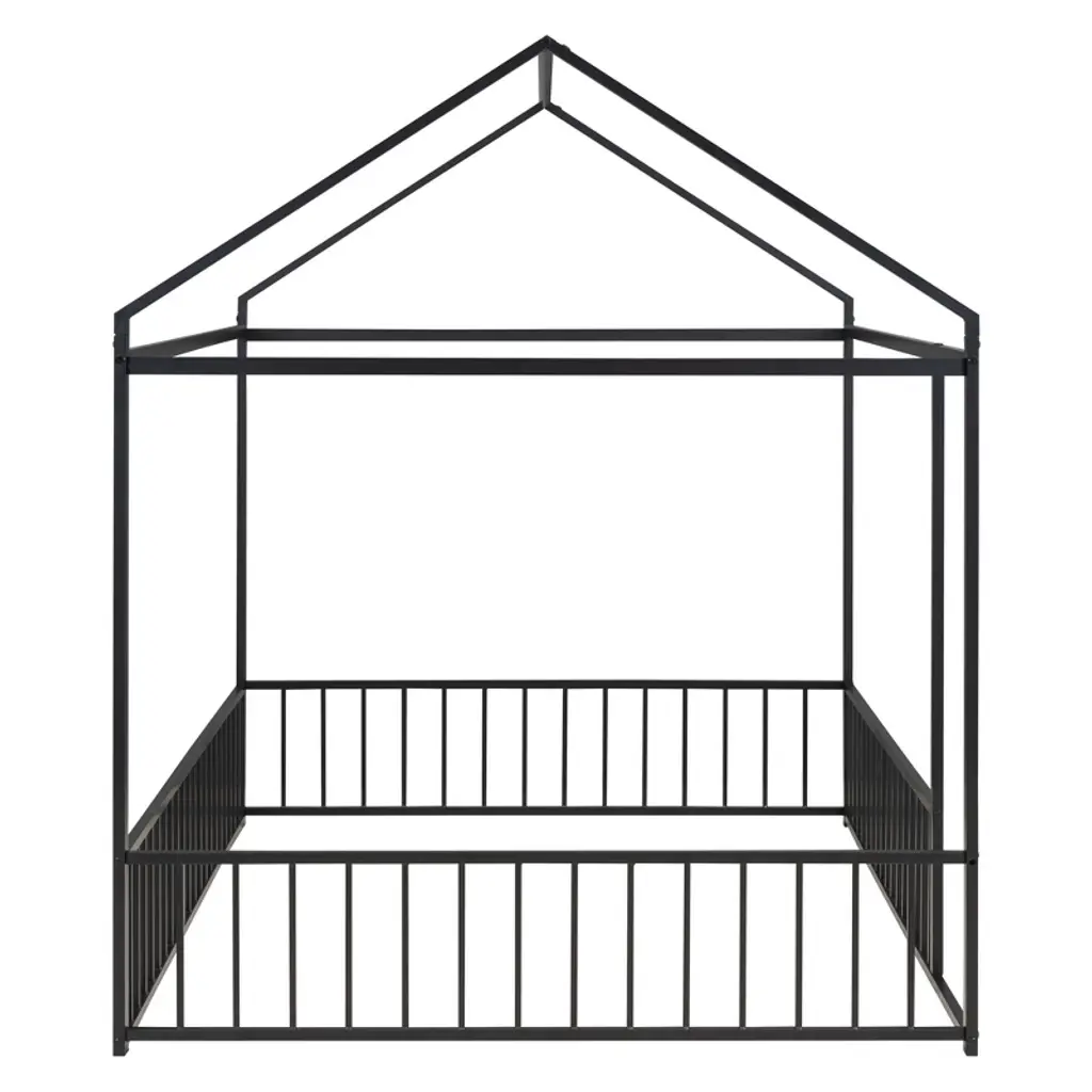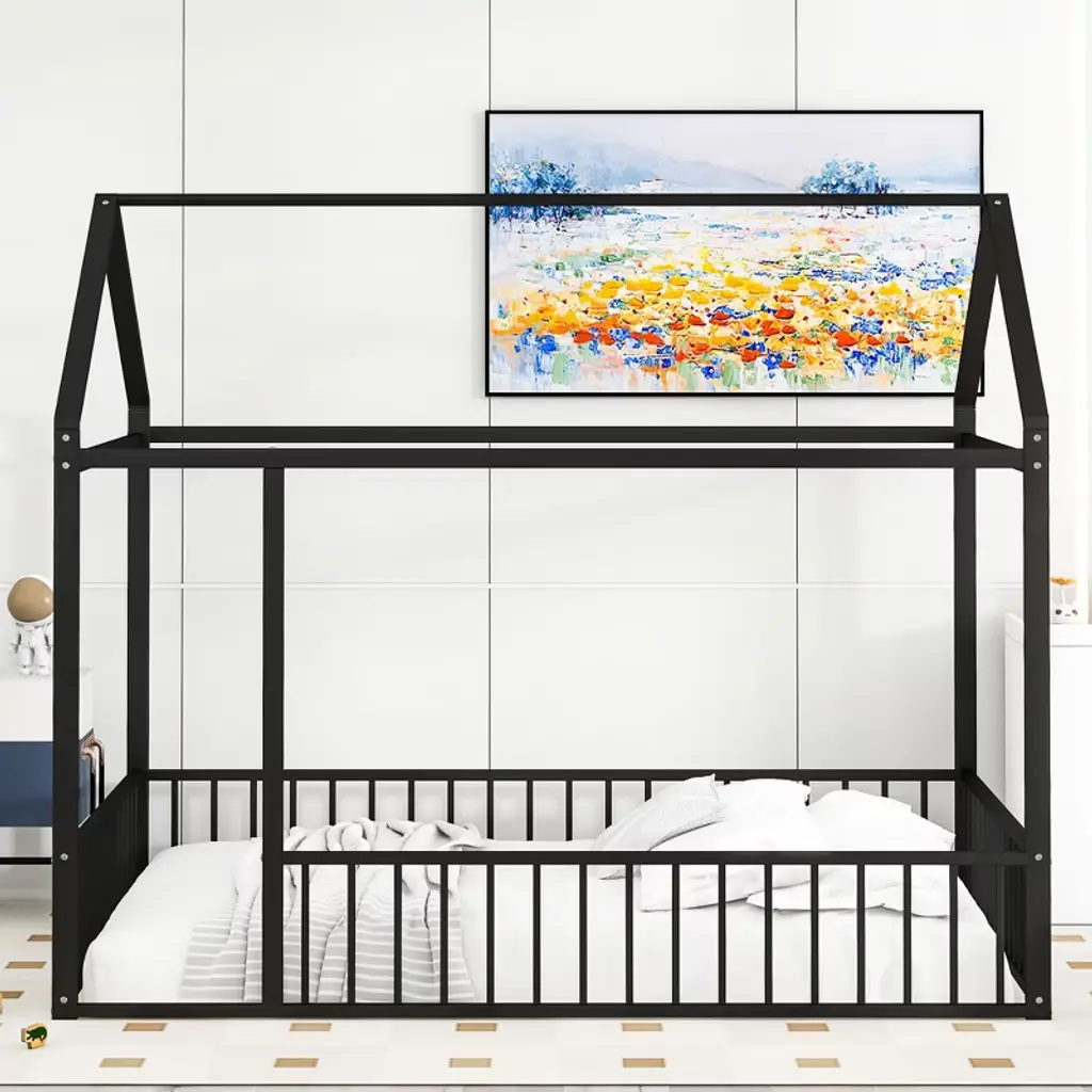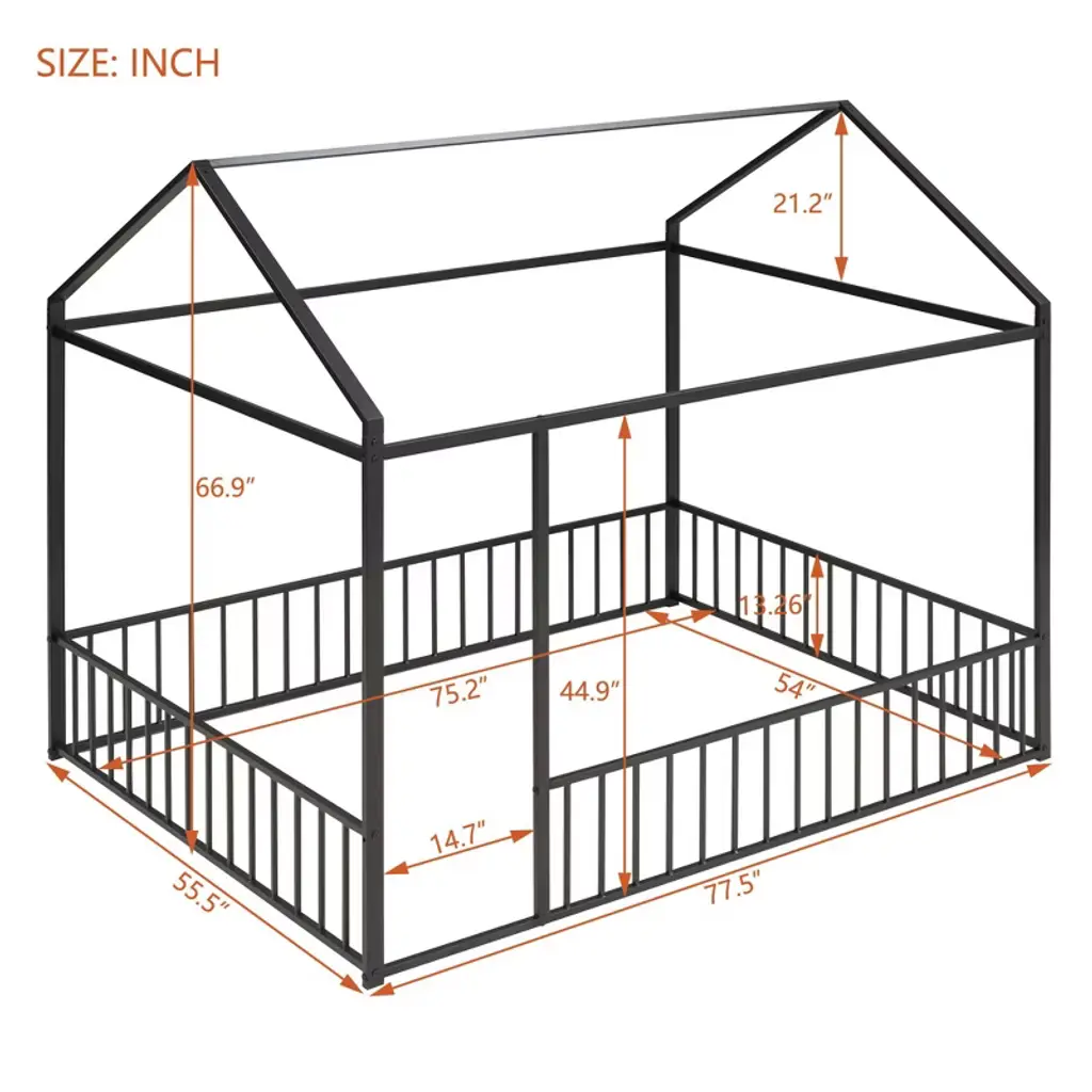 This full-size house bed features a playful roof and fence design, creating a cozy sleeping and play space. Built with a sturdy metal frame, it ensures durability. Easy to assemble with included instructions and hardware. Mattress not included.