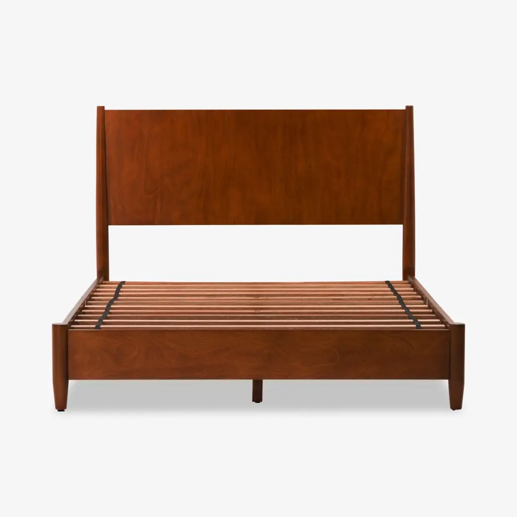 The Cheney Bed instantly elevates any bedroom into a mid-century modern oasis. Expertly crafted with mahogany solids and okoume wood veneer, this platform bed frame is as sturdy as it is stunning. The sumptuous acorn finish keeps the vintage-inspired piece looking modern and fresh.