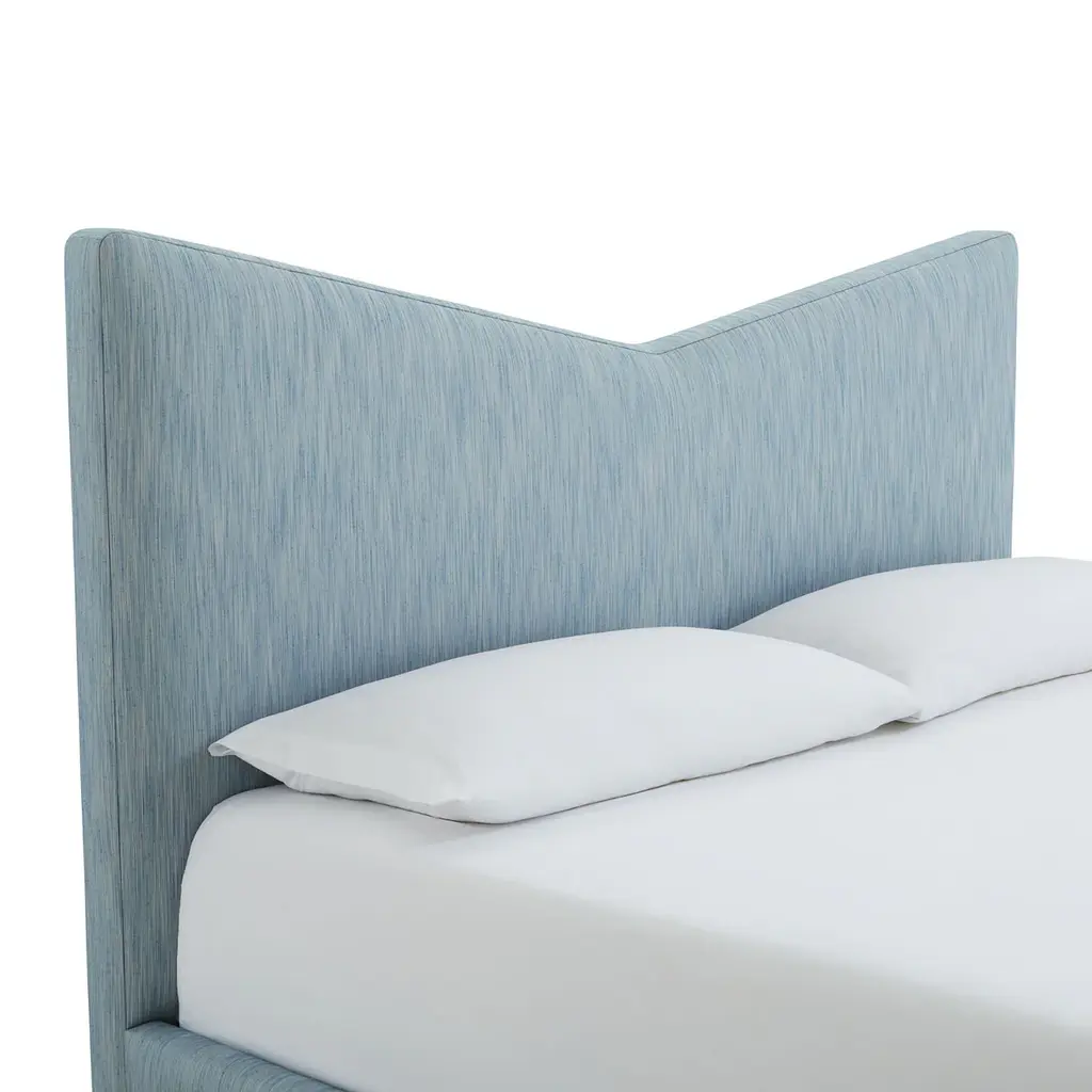 Check Mark. Minimalist and modern, our Chevron Bed features a simple bow tie inspired silhouette wrapped in a striated oceanic blue tone with a slight iridescent sheen—cool and chic. Bold, oversized brass orb feet at the base bring the perfect amount of glamour to the mix. The perfect blend of simplicity and sizzle, guys and gals will agree on this one.