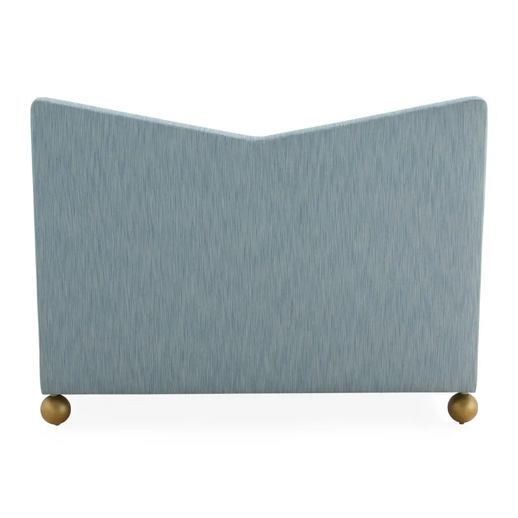 Check Mark. Minimalist and modern, our Chevron Bed features a simple bow tie inspired silhouette wrapped in a striated oceanic blue tone with a slight iridescent sheen—cool and chic. Bold, oversized brass orb feet at the base bring the perfect amount of glamour to the mix. The perfect blend of simplicity and sizzle, guys and gals will agree on this one.