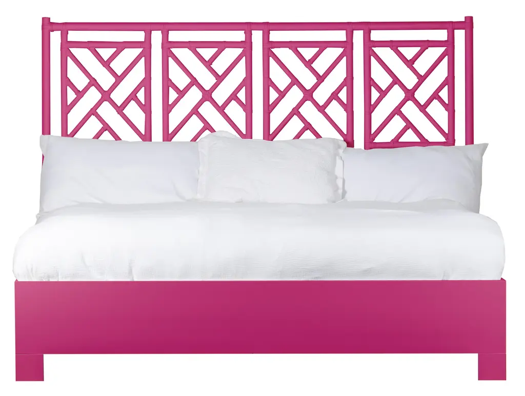 A timeless design, this Chinoiserie styled bed features a Rattan headboard with a Maple Bed Frame. The Rattan headboard is hand-wrapped with Rawhide Bindings to add a beautiful contrast and strength. The Maple Bed Frame, which accepts a box spring and mattress, is built in the USA. The Rattan headboard easily attaches to the Bed Frame. Each bed is custom made and finished to order. This bed is an artistic centerpiece and will make a statement in any bedroom.