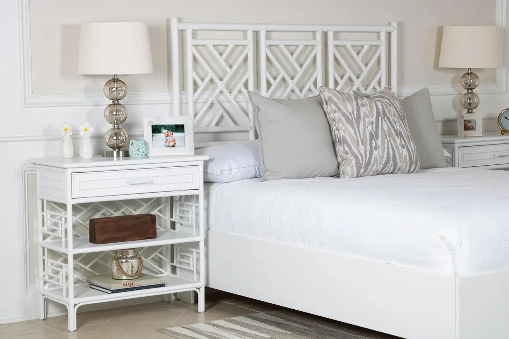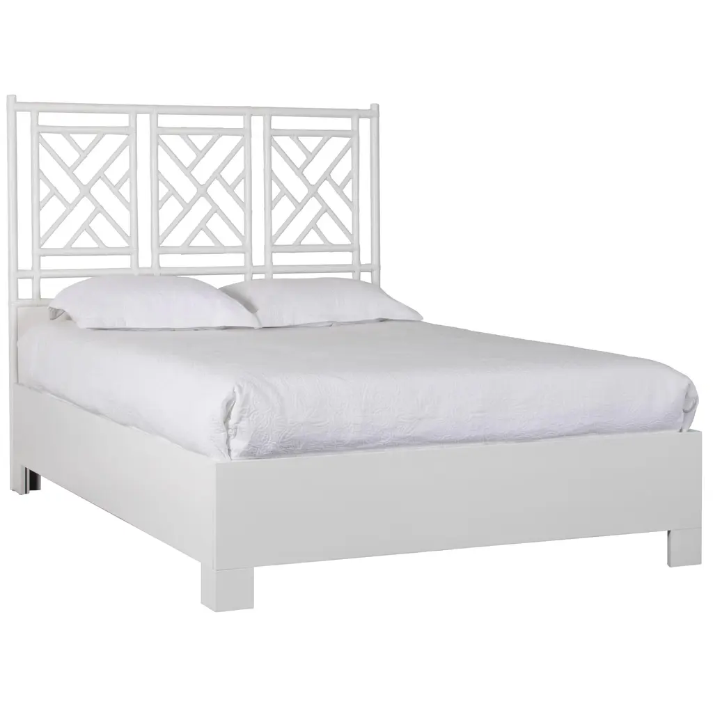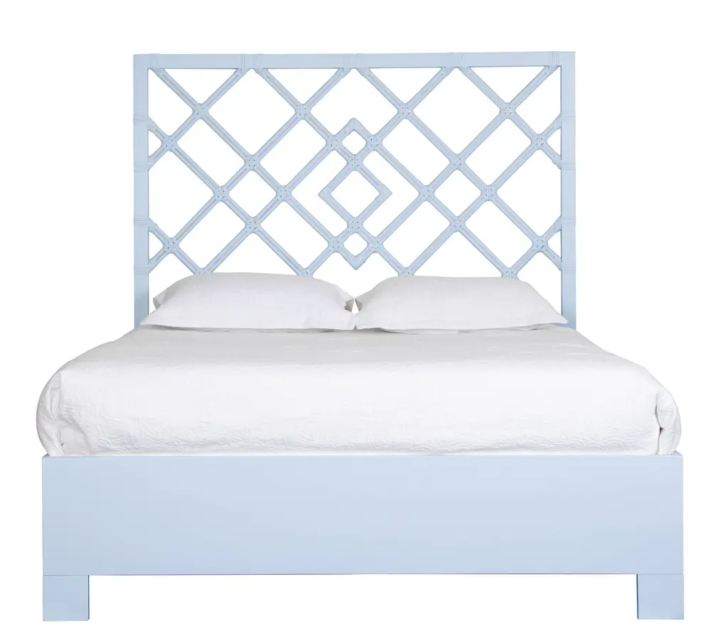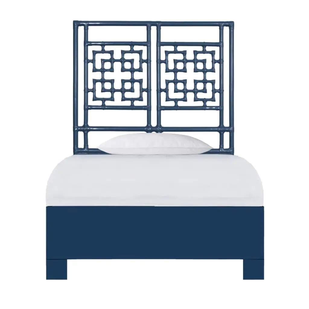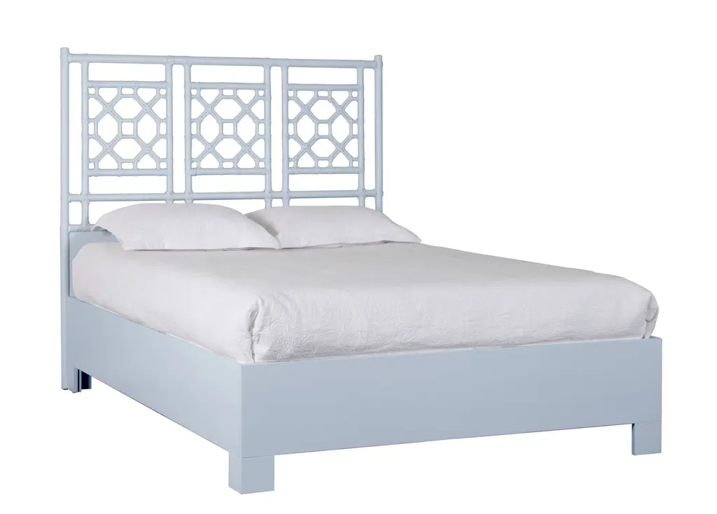 A timeless design, this Chinoiserie styled bed features a Rattan headboard with a Maple Bed Frame. The Rattan headboard is hand-wrapped with Rawhide Bindings to add a beautiful contrast and strength. The Maple Bed Frame, which accepts a box spring and mattress, is built in the USA. The Rattan headboard easily attaches to the Bed Frame. Each bed is custom made and finished to order. This bed is an artistic centerpiece and will make a statement in any bedroom.