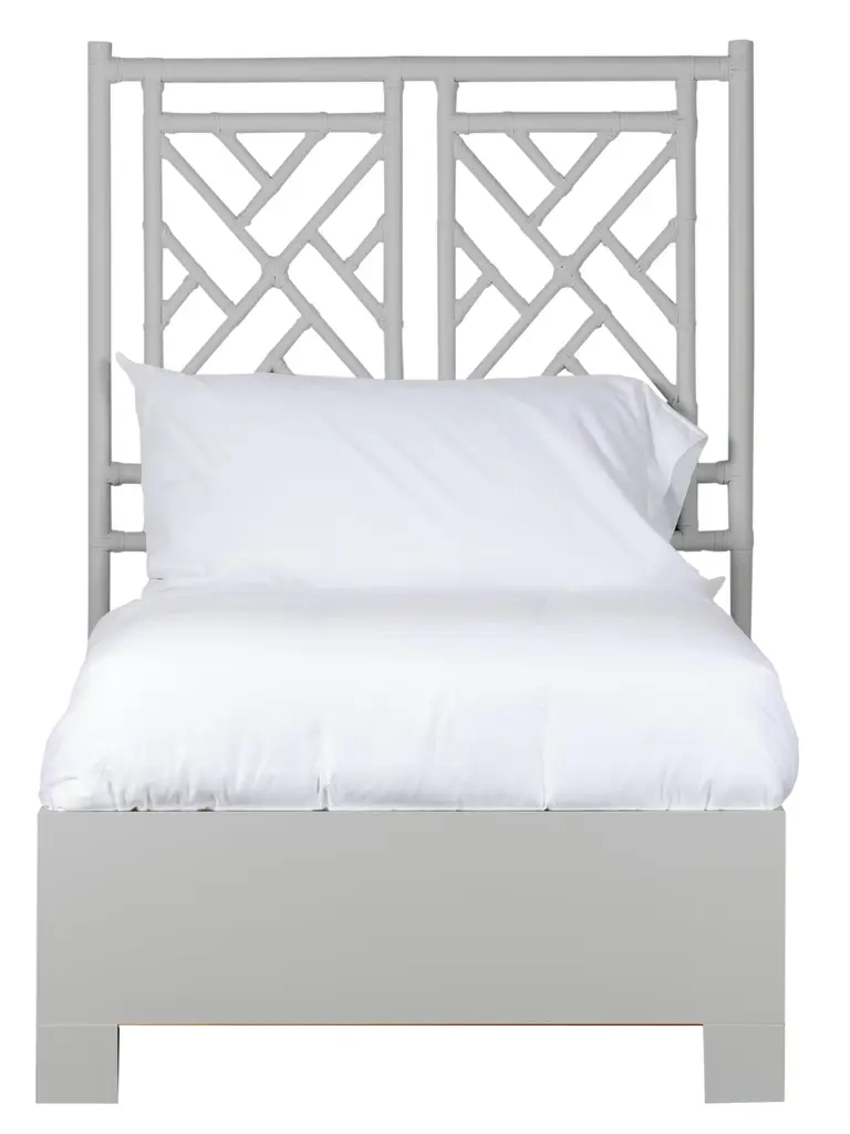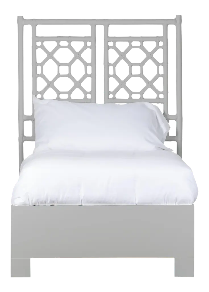 A timeless design, this Chinoiserie styled bed features a Rattan headboard with a Maple Bed Frame. The Rattan headboard is hand-wrapped with Rawhide Bindings to add a beautiful contrast and strength. The Maple Bed Frame, which accepts a box spring and mattress, is built in the USA. The Rattan headboard easily attaches to the Bed Frame. Each bed is custom made and finished to order. This bed is an artistic centerpiece and will make a statement in any bedroom.
