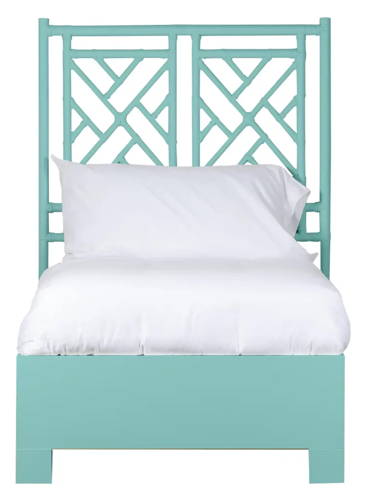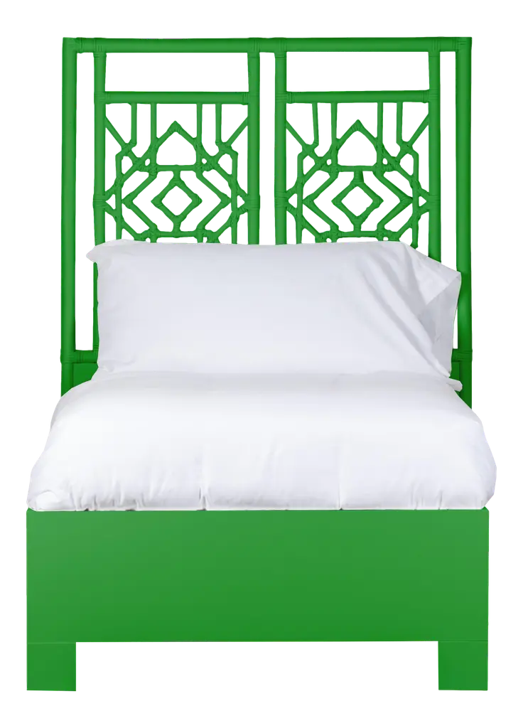A timeless design, this Chinoiserie styled bed features a Rattan headboard with a Maple Bed Frame. The Rattan headboard is hand-wrapped with Rawhide Bindings to add a beautiful contrast and strength. The Maple Bed Frame, which accepts a box spring and mattress, is built in the USA. The Rattan headboard easily attaches to the Bed Frame. Each bed is custom made and finished to order. This bed is an artistic centerpiece and will make a statement in any bedroom.