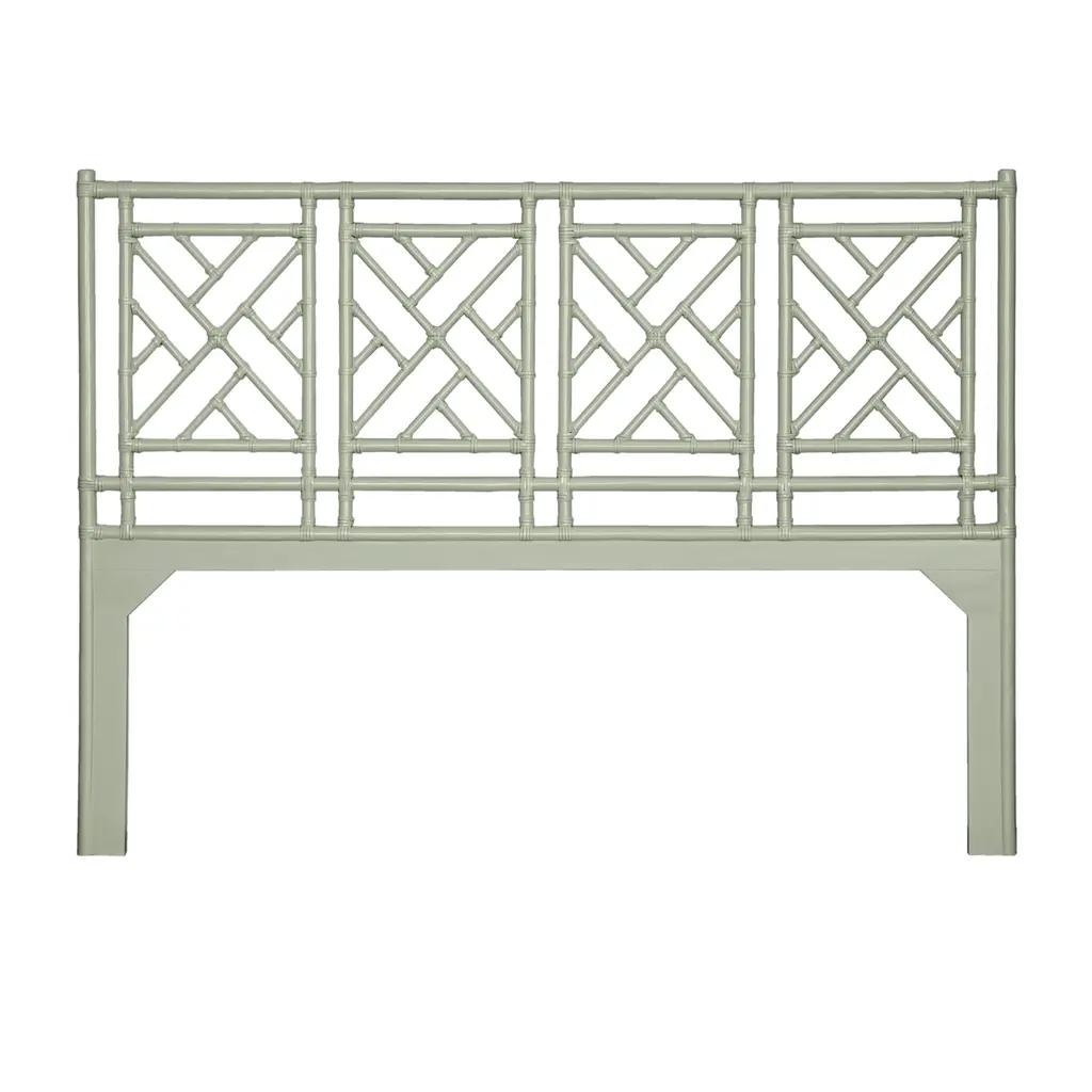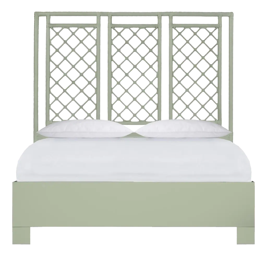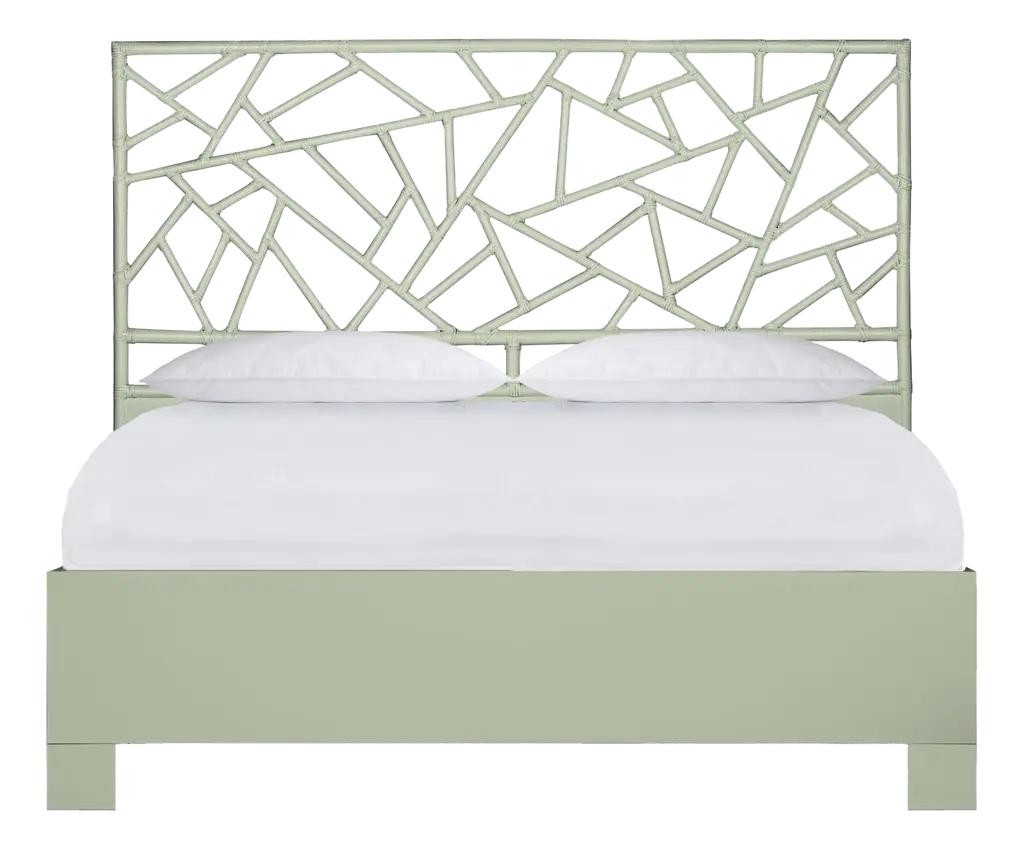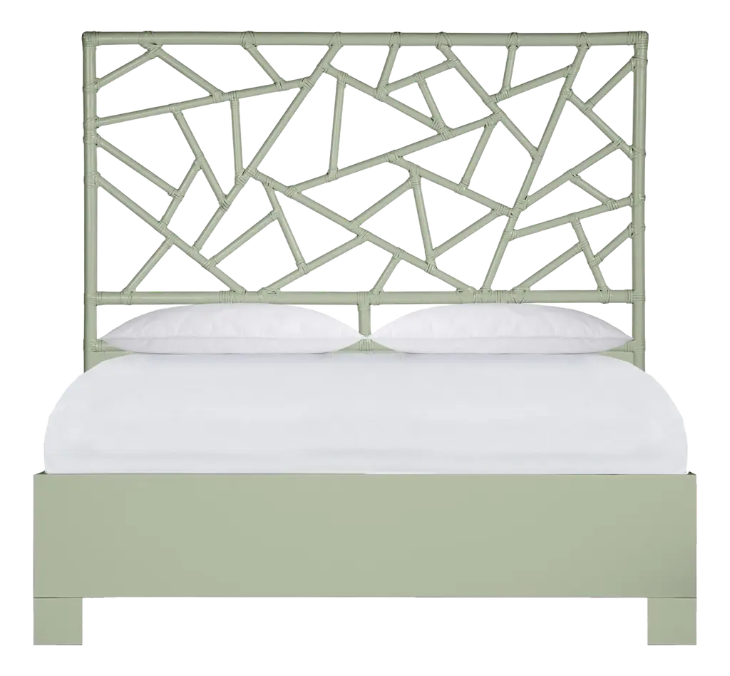 The timeless elegance of our Chippendale bed will elevate any room with its sophisticated charm. A headboard expertly crafted from hand-shaped natural rattan, each joint is meticulously wrapped with leather bindings, making this bed by David Francis Furniture a true statement piece. The standard maple bed frame is designed to accept a mattress and box spring. Bring your unique taste to the forefront with this beautifully crafted bed that blends tradition and style effortlessly. This piece is made to order, so please allow time for delivery.