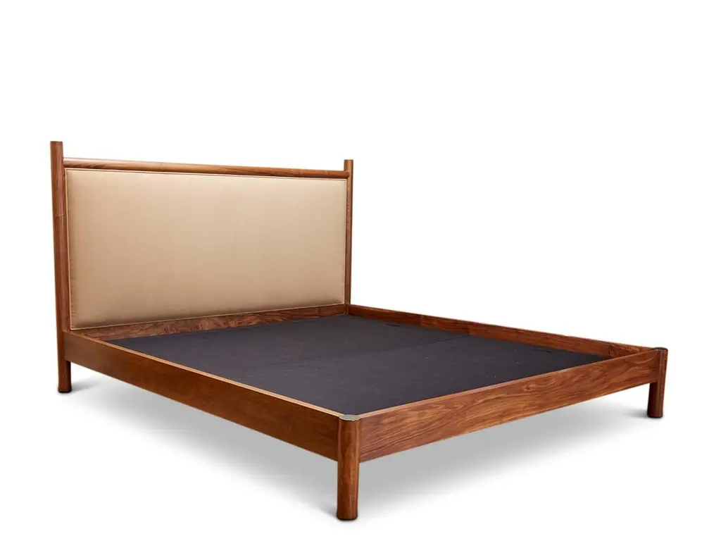 The Chiselhurst bed is an upholstered bed with a solid American walnut or white oak frame finished with brass caps. Slats are provided. Available with or without footboard. The Lawson-Fenning Collection is designed and handmade in Los Angeles, California. Reach out to discover what options are currently in stock.