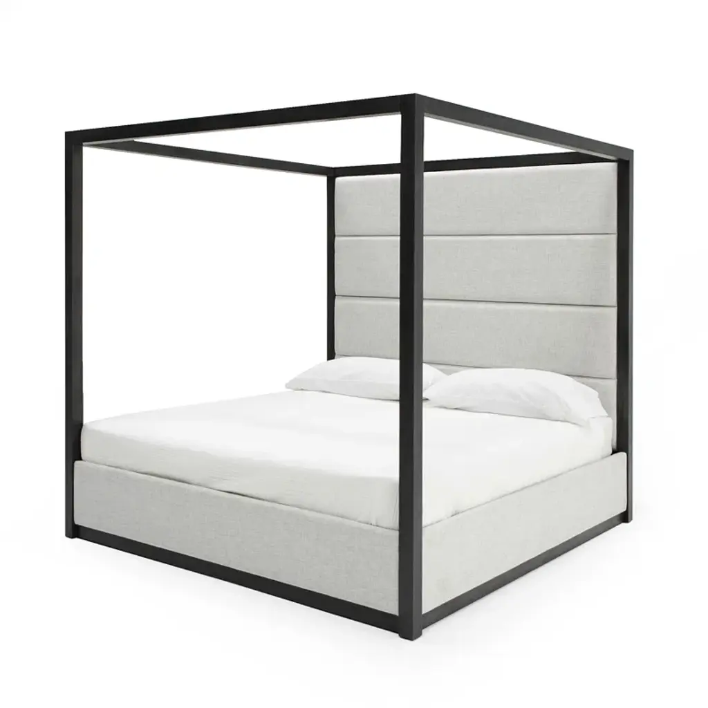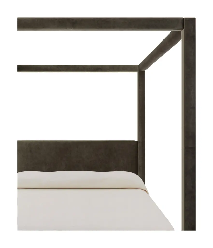 The ultimate retreat at the end of the day, our dreamy Clarke Bed is a contemporary take on the classic canopy bed. But unlike its ornate predecessors, Clarke is clean-lined and simple, fully upholstered from its bedposts to its headboard. The perfect place to prop up for some evening reading or breakfast in bed, Clarke would be especially inviting piled high with a collection of our luxe pillows. As Shown •upholstered in tulum-metal velvet•fabric content: 50% acrylic, 26% cotton, 24% polyester •sustainable construction Dimensions •overall: 69"W x 88.5"D x 86"H•headboard height: 48.5"H•includes three metal horizontal cross rails COM yardage needed is 12 yards. If using a patterned fabric please contact us at info@jaysonhome.com or 1-800-472-1885 for yardage requirements.