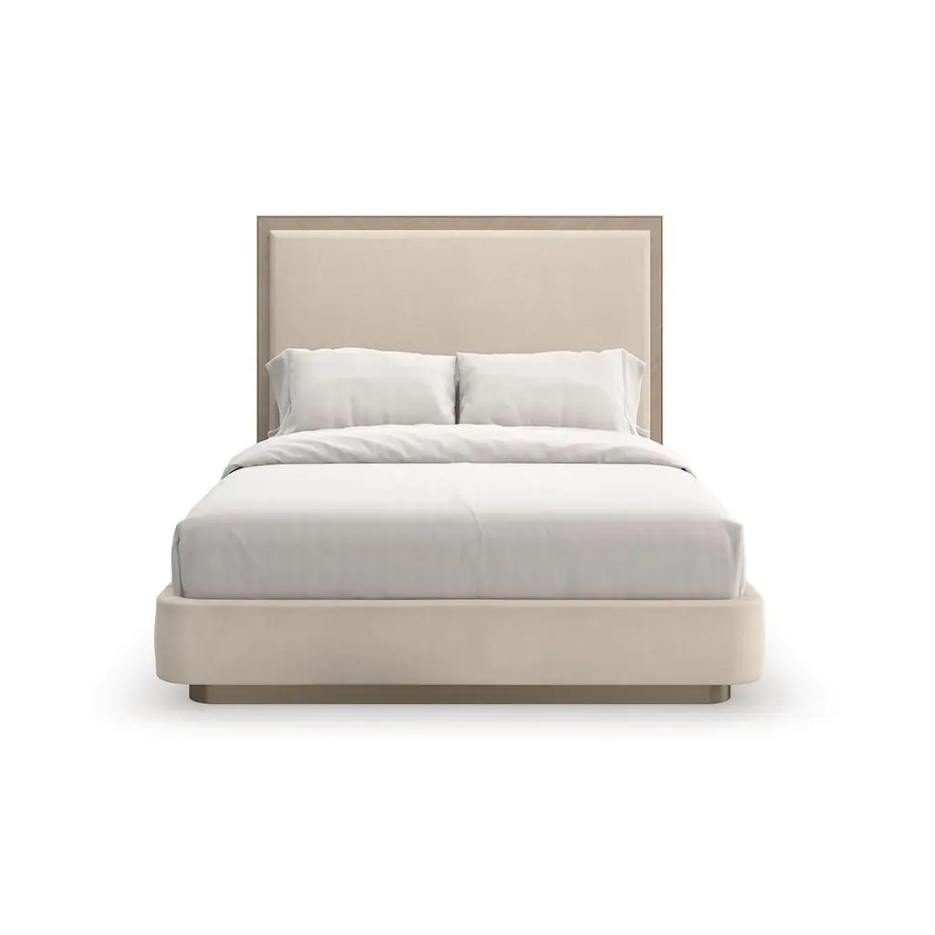 This classic bed introduces a calming neutral palette that is warm and inviting. Framed in Koto veneers with a subtle Chevron pattern inspired by early Greek motifs, its parsons-style headboard is dressed in a wool-like flannel that is soft yet durable and capped on all three sides in glinting Brushed Gold metal.Seemingly floating on a Brushed Gold plinth base, its sophisticated silhouette brings effortless elegance to bedroom interiors and guest suites. Also available with paneled, chevron-patterned headboard wings for added drama.Dimensions: 67" W x 88" D x 57" H2955-34CC-P Performance