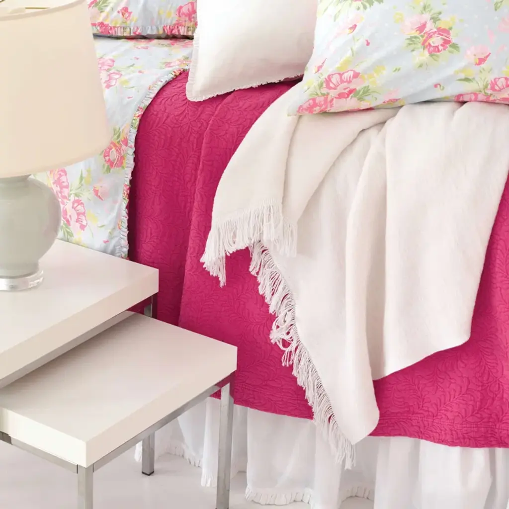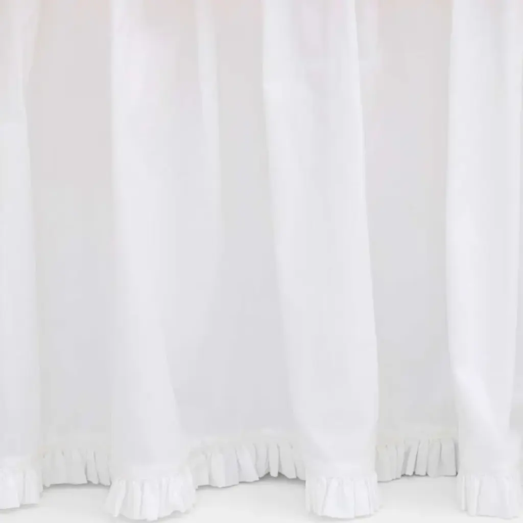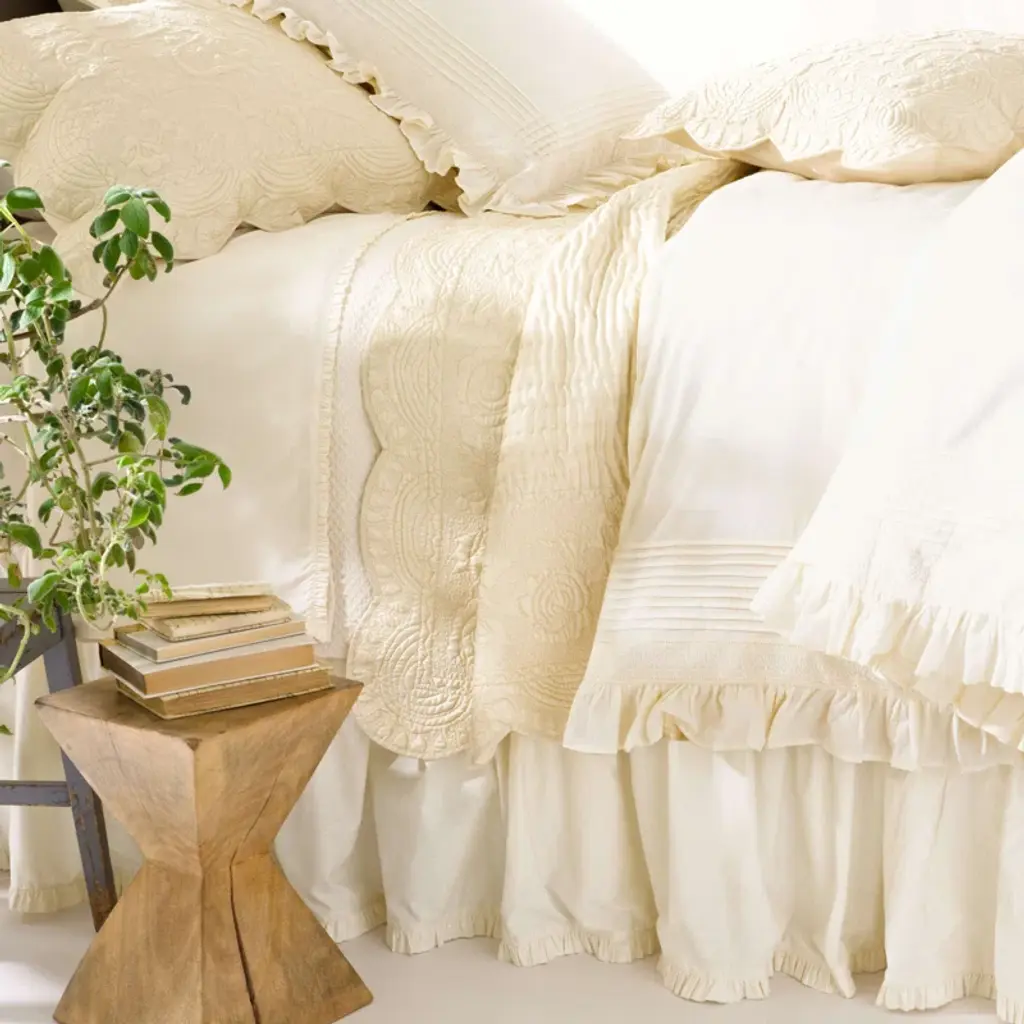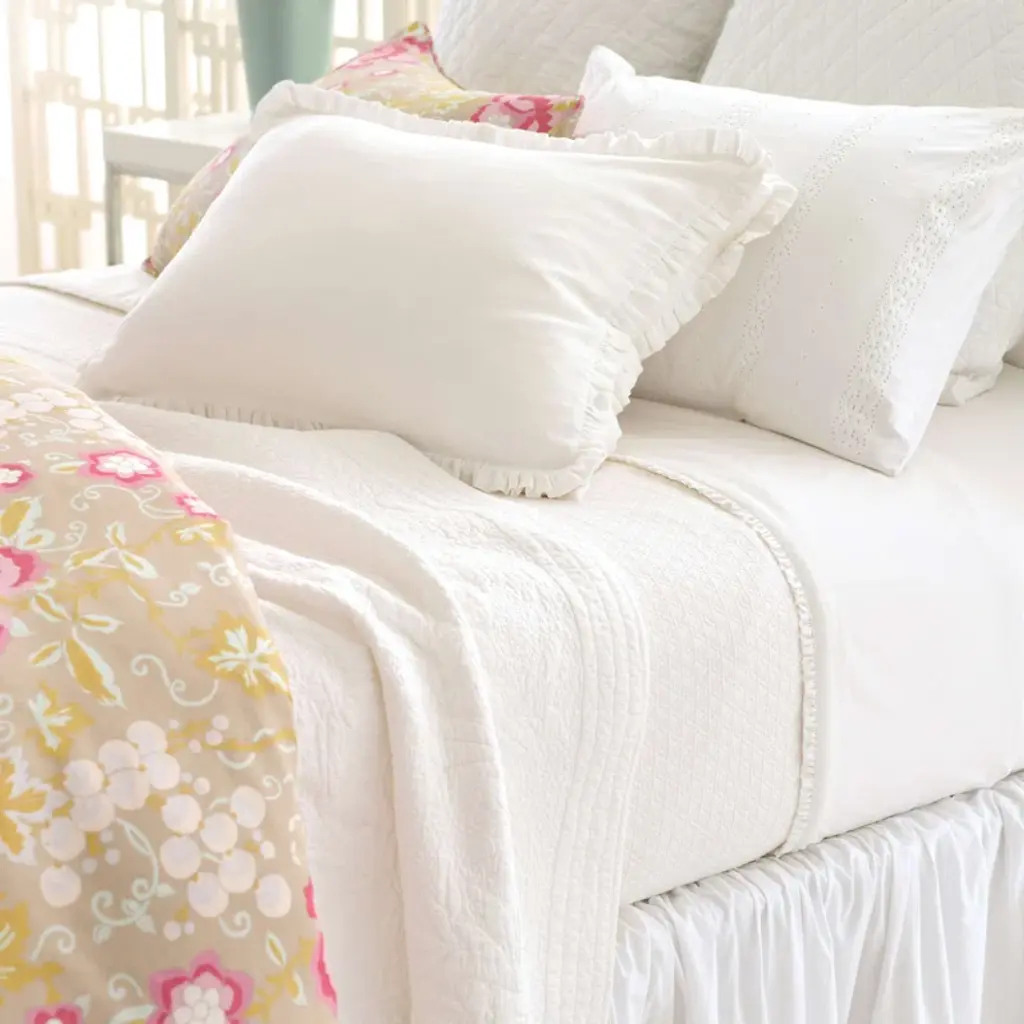 Decorative stitching at the hem adds detail to the classic elegance of our cotton bed skirt. Gathered, split corners, 18" drop.