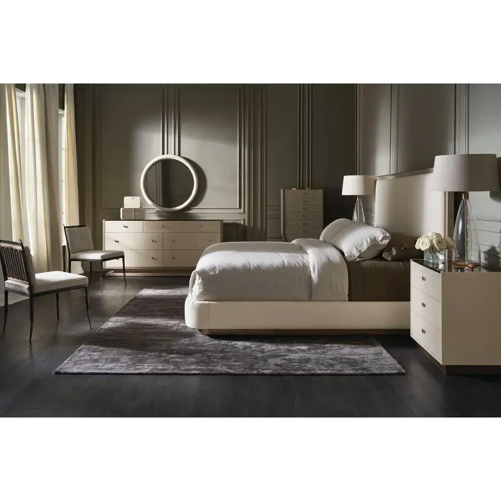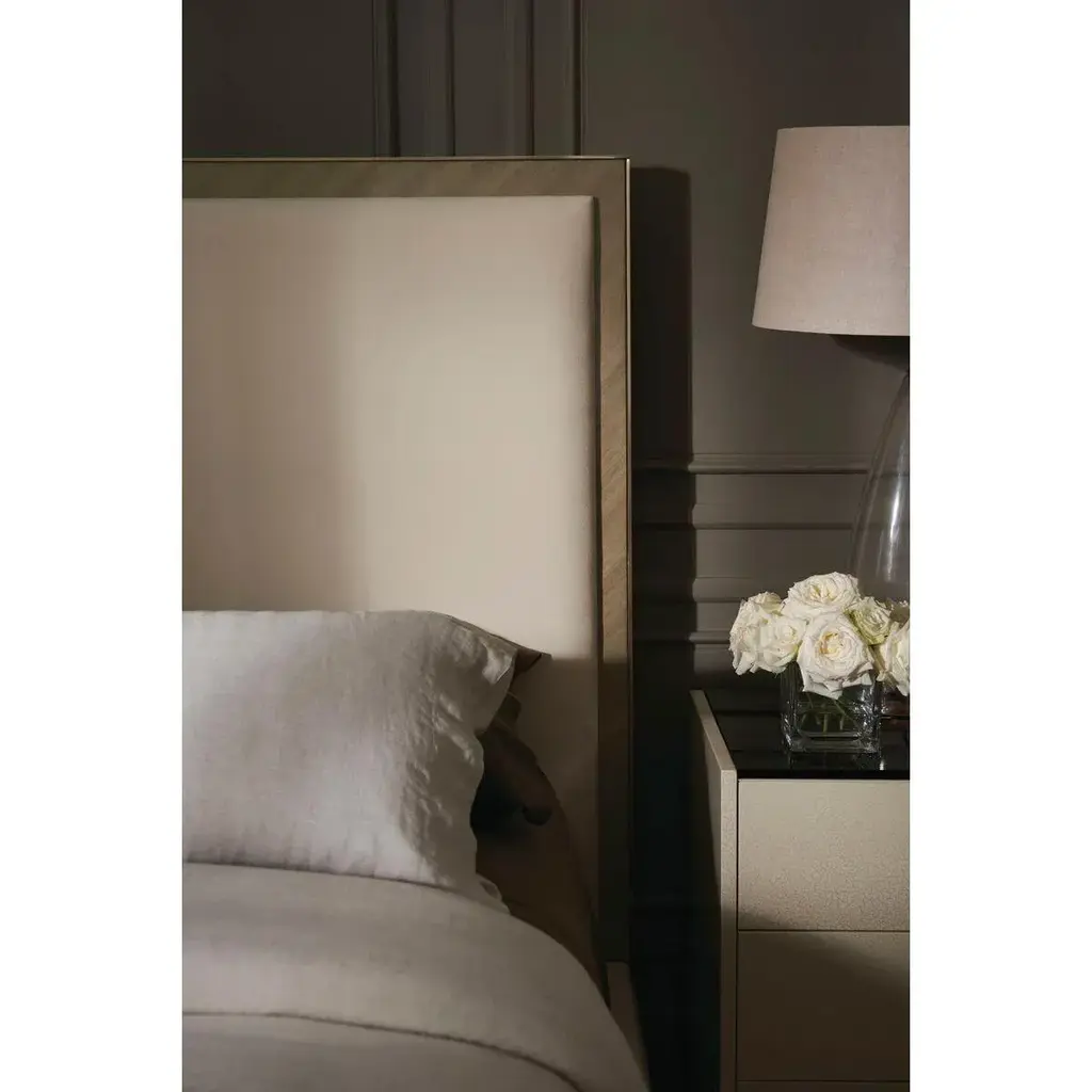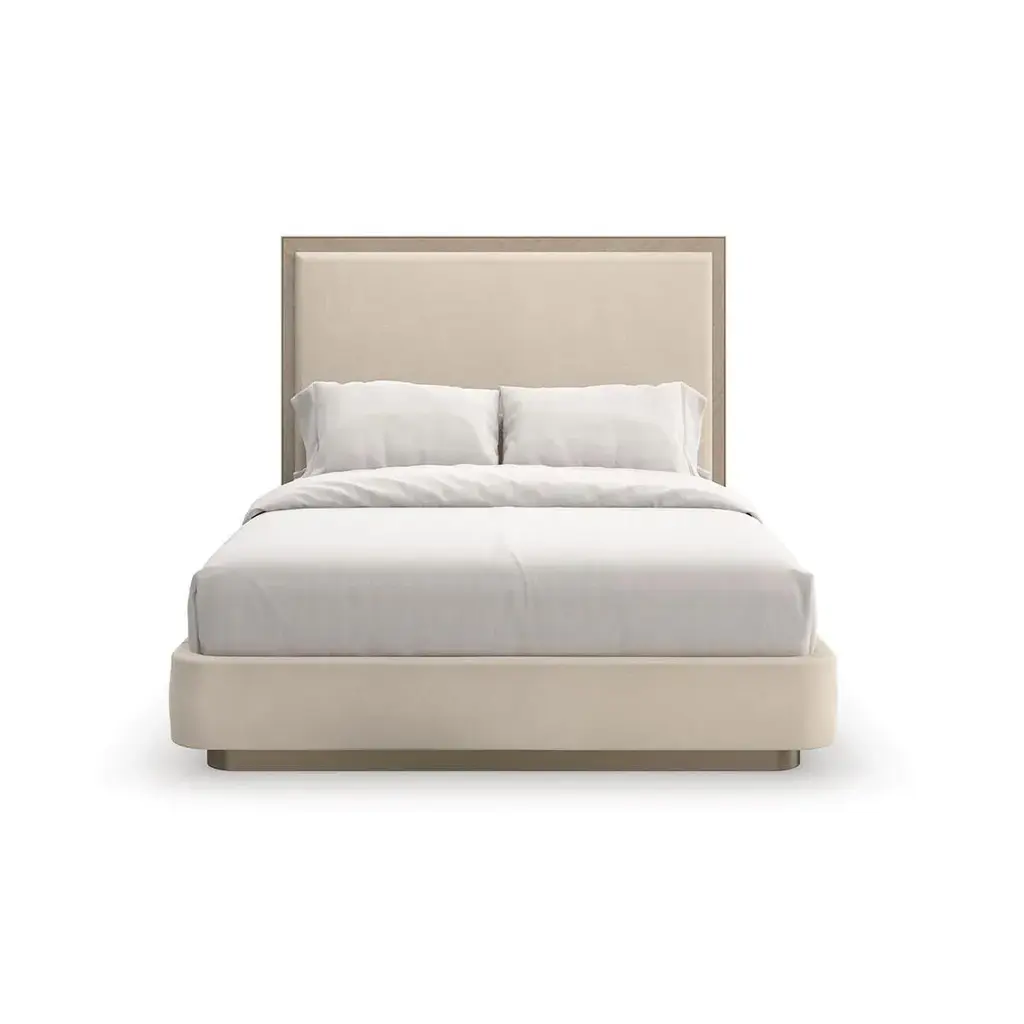This classic bed introduces a calming neutral palette that is warm and inviting. Framed in Koto veneers with a subtle Chevron pattern inspired by early Greek motifs, its parsons-style headboard is dressed in a wool-like flannel that is soft yet durable and capped on all three sides in glinting Brushed Gold metal. Seemingly floating on a Brushed Gold plinth base, its sophisticated silhouette brings effortless elegance to bedroom interiors and guest suites. Also available with paneled, chevron-patterned headboard wings for added drama. Dimensions: 67" W x 88" D x 57" H 2955-34CC-P Performance
