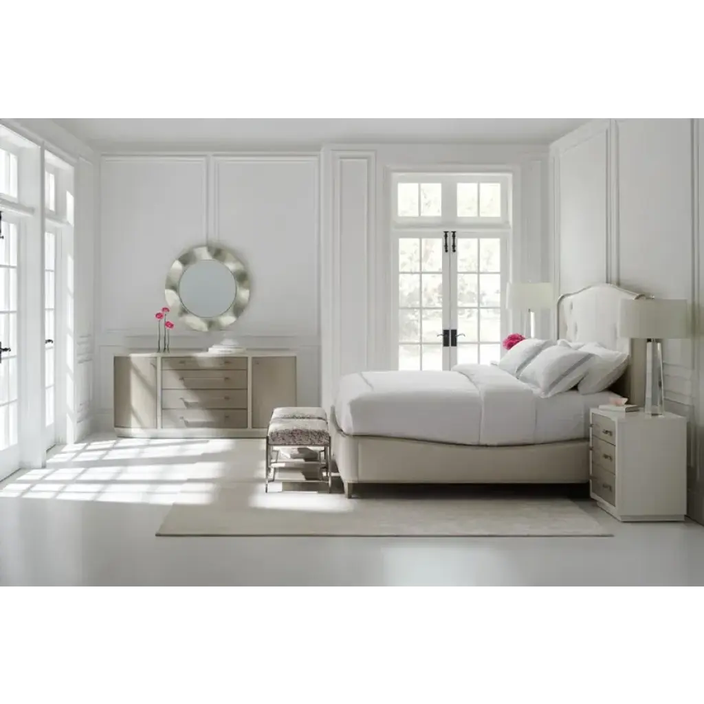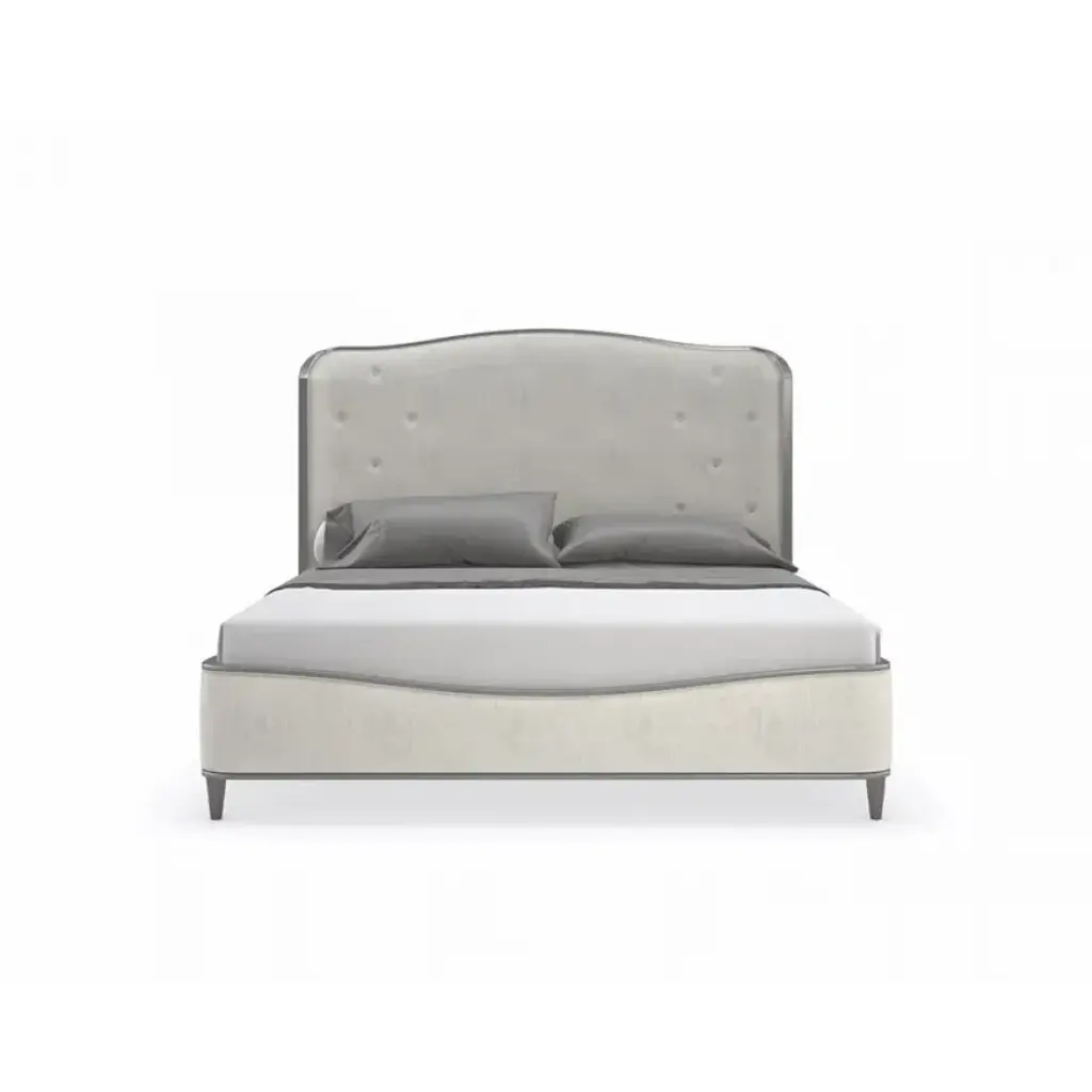 Soft, flowing lines and gentle curves make this upholstered bed complementary to many styles, while having an influential presence of its own. Button-pull details and an exposed wood frame in Silver Charm paint accentuate the headboard’s slight wing shape. Exquisitely tailored in a neutral performance linen for a luxurious look that’s easy to care for. Features adjustable slats to allow for a range of mattress and box spring thicknesses.