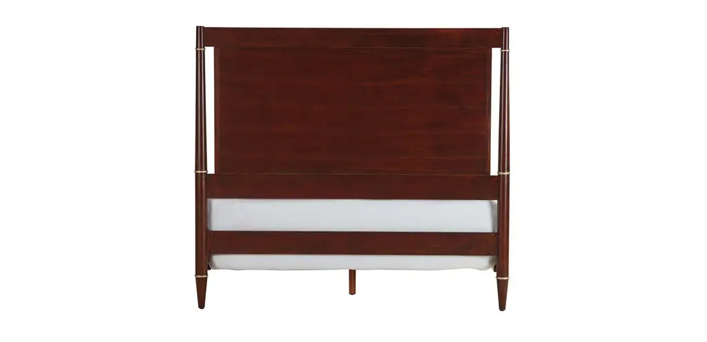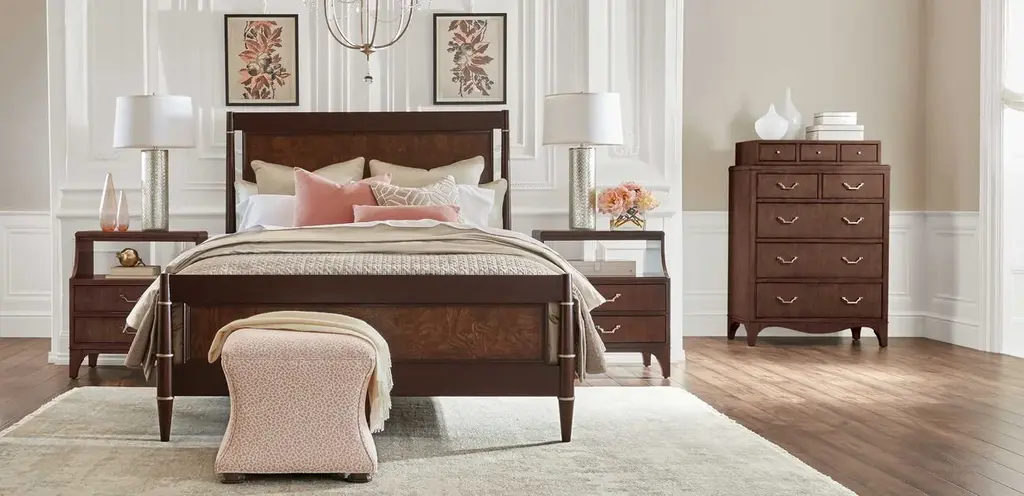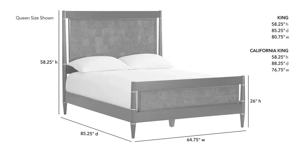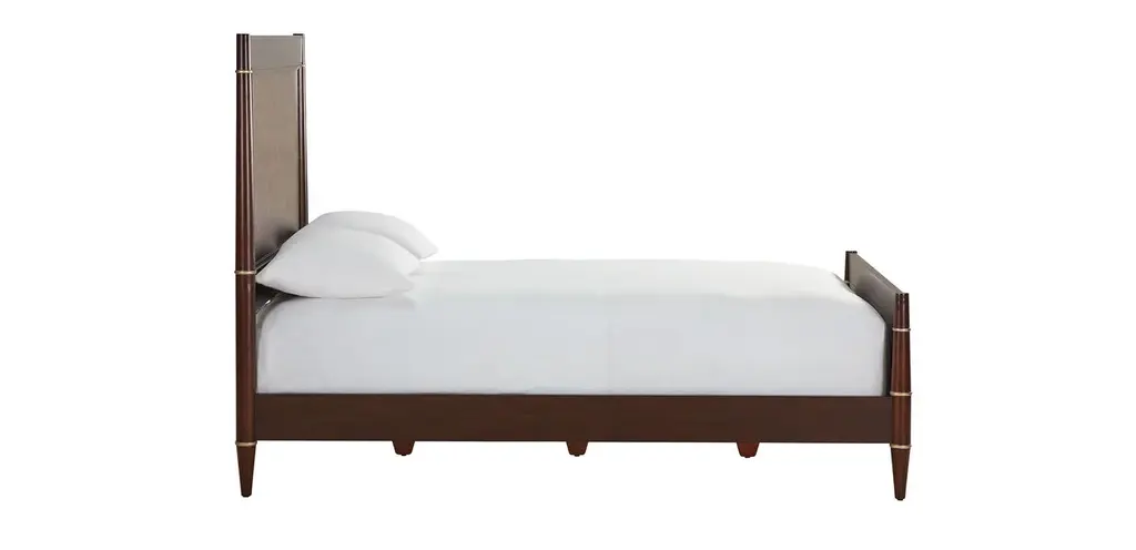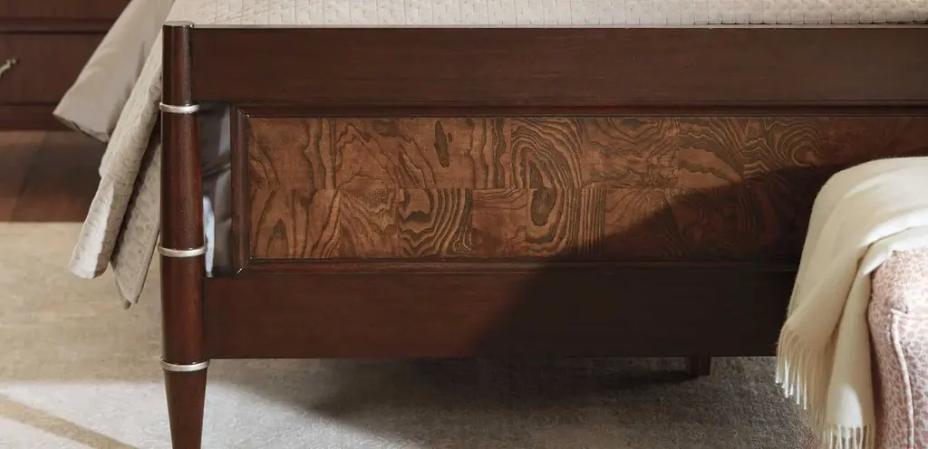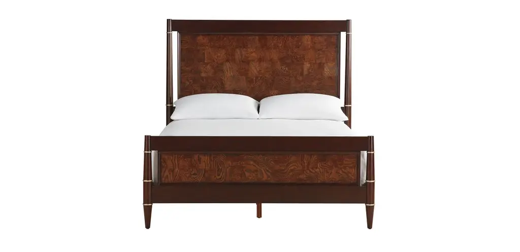 The Clement bed channels inspiration from regal four-poster beds to create a foundation for luxurious evenings in today's homes. Its inset head- and footboard are crafted with exquisite random-matched olive ash burl veneer panels; they truly shine between low-profile tapered posts, each of which is adorned with hand-painted gold-toned collar details.