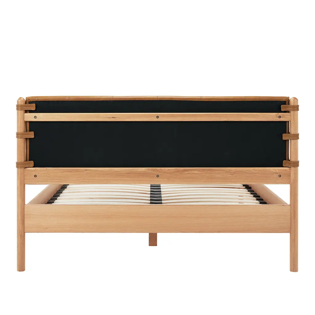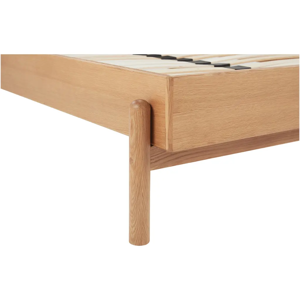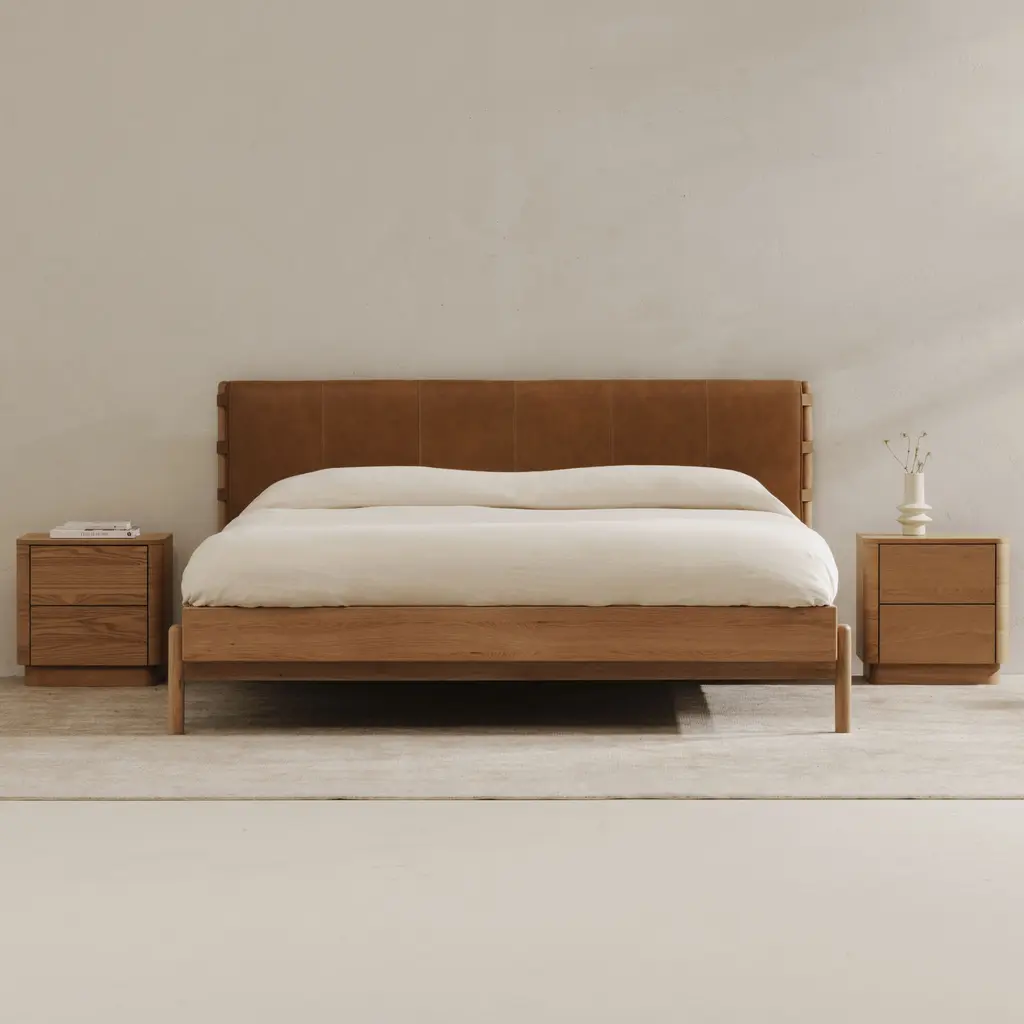 Crafted with a high-quality leather headboard and rounded solid oak legs, the Colby King bed frame elegantly brings understated luxury with superb craftsmanship. The soft curves of the leather headboard provide a sense of warmth and coziness, while the rounded legs add a touch of organic form to the overall design. The clean lines and natural materials create a harmonious and sophisticated piece, fitting seamlessly into any contemporary space.