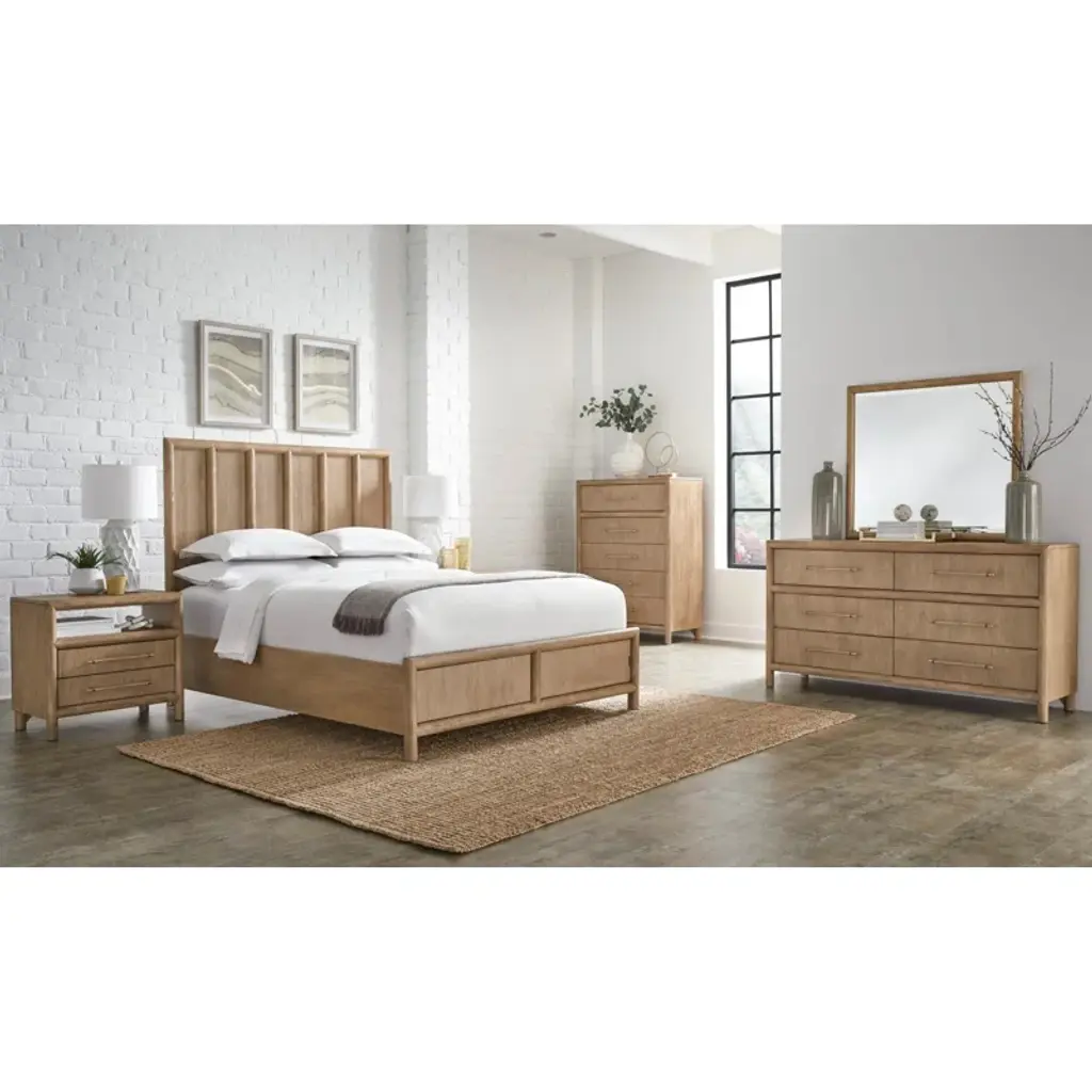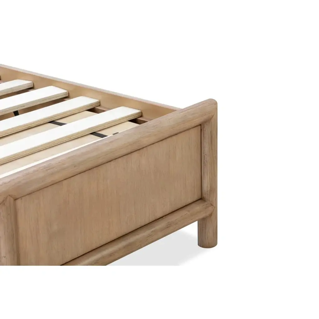 With thick round framing, vertical wood grain and a soft natural finish, the bedroom is an updated take on modern design. Made from acacia solid wood and acacia wood veneer, wire brushed wood surfaces simulate the patina of naturally weathered wood. Elongated wooden bar pulls complete the look.
