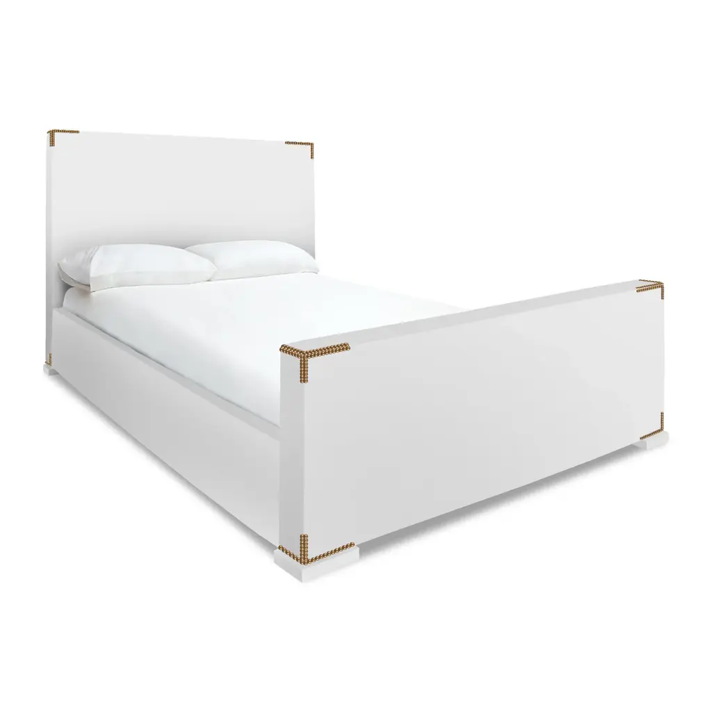 Stately Slumber. Perfectly minimalist and modern—with a subtle layer of glamour. We've arranged nailheads in a pattern to simulate campaign corners, adding subtle ornamentation to a simple upholstered silhouette. The regal frame rests on chunky solid brass or nickel feet, cultivating a stately presence. Finally, a bed husbands and wives will agree on. See More About This Style for more customization options. *Our shipping ETAs may be longer than usual, but safely delivering the looks you love is always our priority.