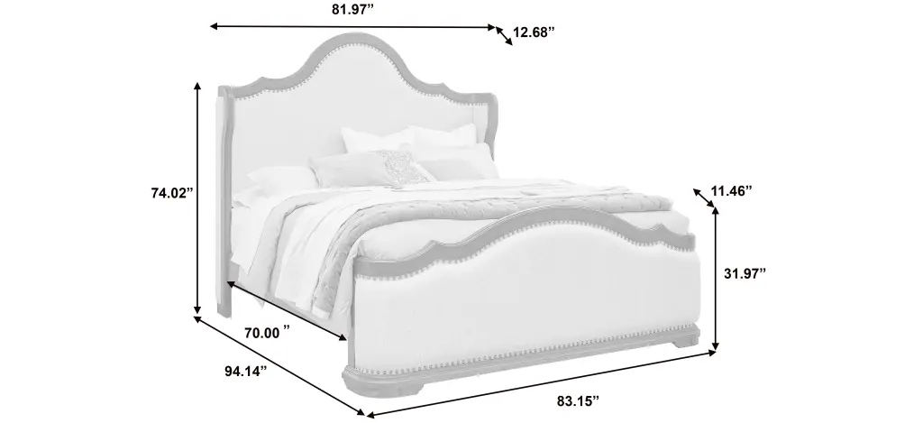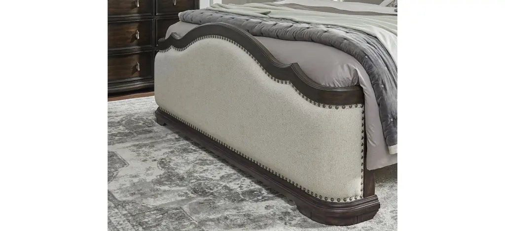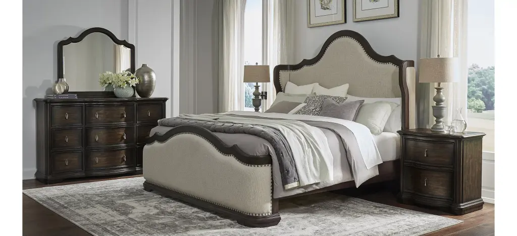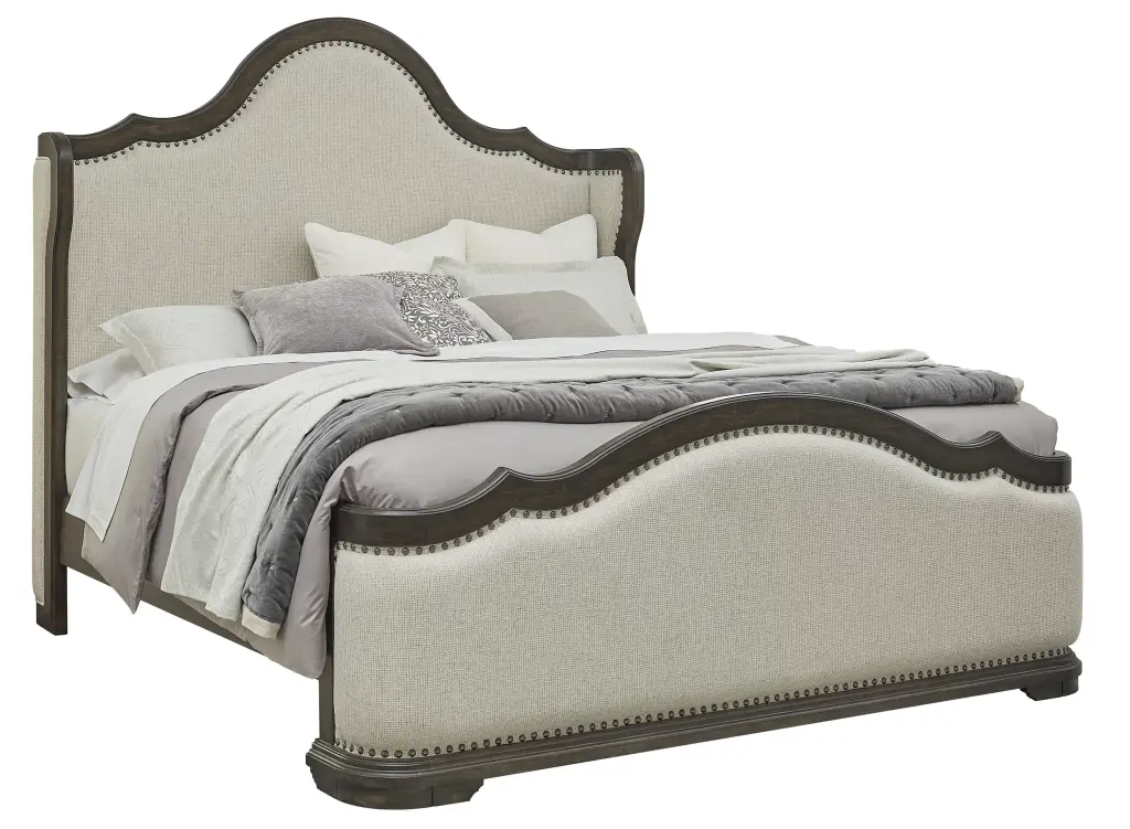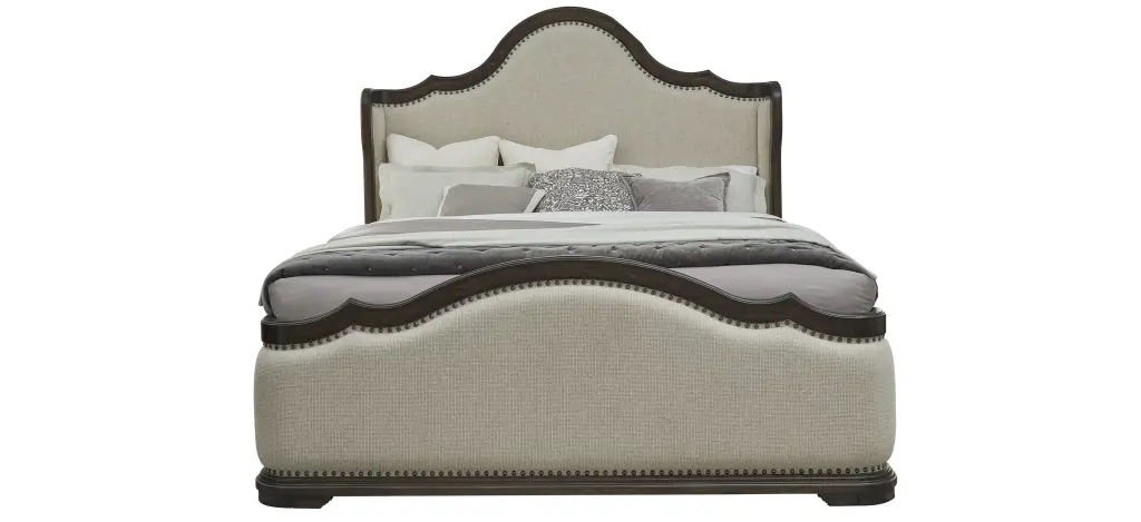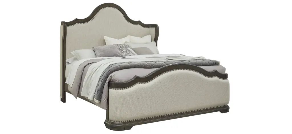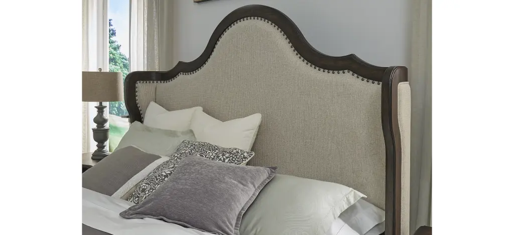 The Cooper Falls Shelter-Back Upholstered Bed provides a comfortable place to sleep but also serves as a statement piece, evoking a sense of grandeur and sophistication.