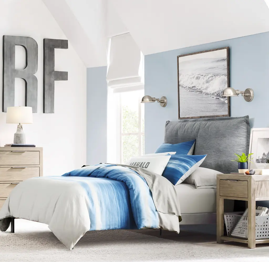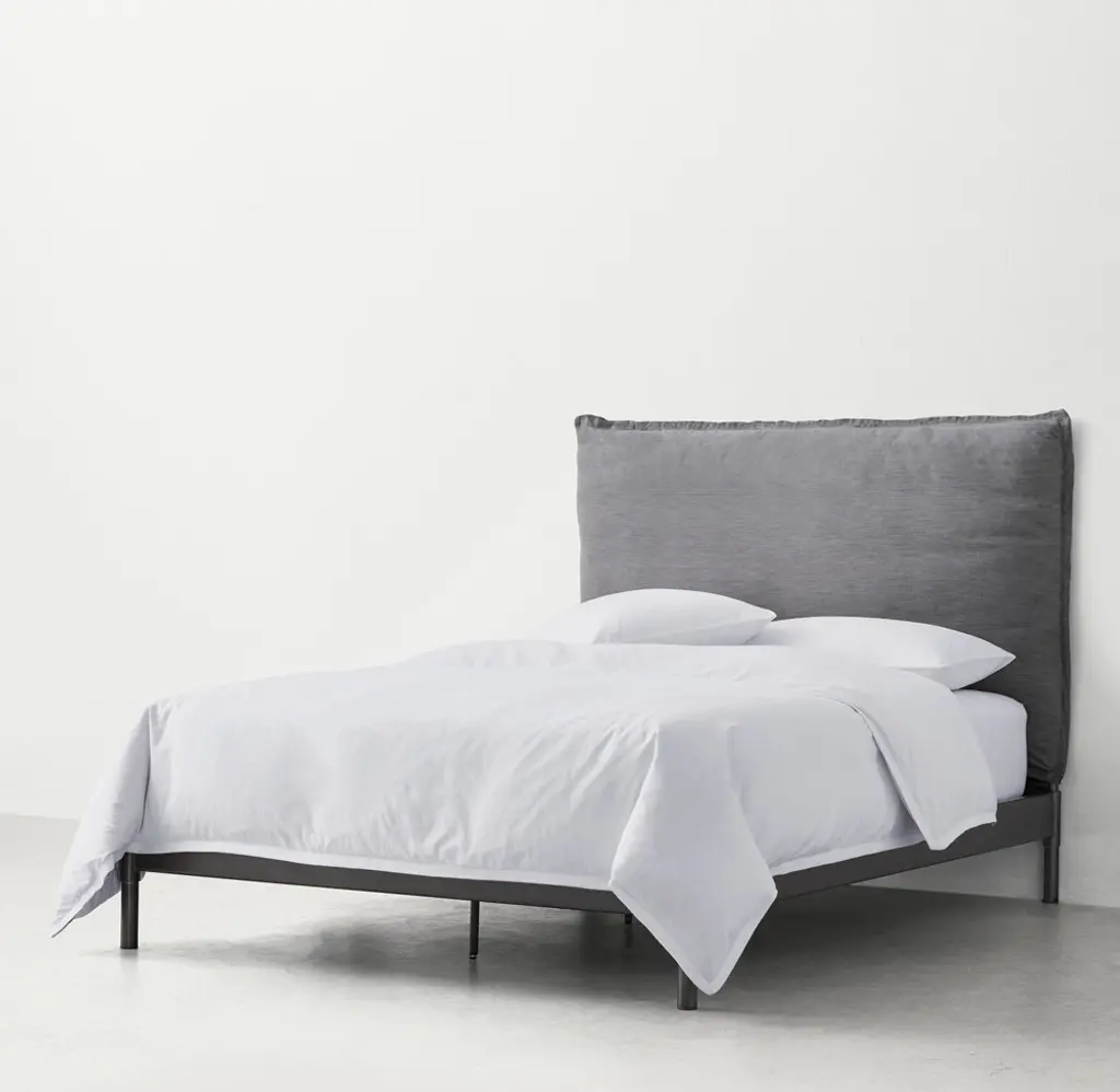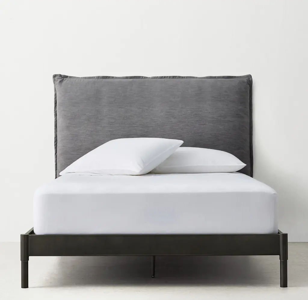 Modern industrial design takes an ultra-comfortable turn in our Cooper bed. Slipcovered in flange-edged, stain-resistant fabric and generously filled with feathers and down, the plush headboard stands in relaxed counterpoint to the sleek steel frame.